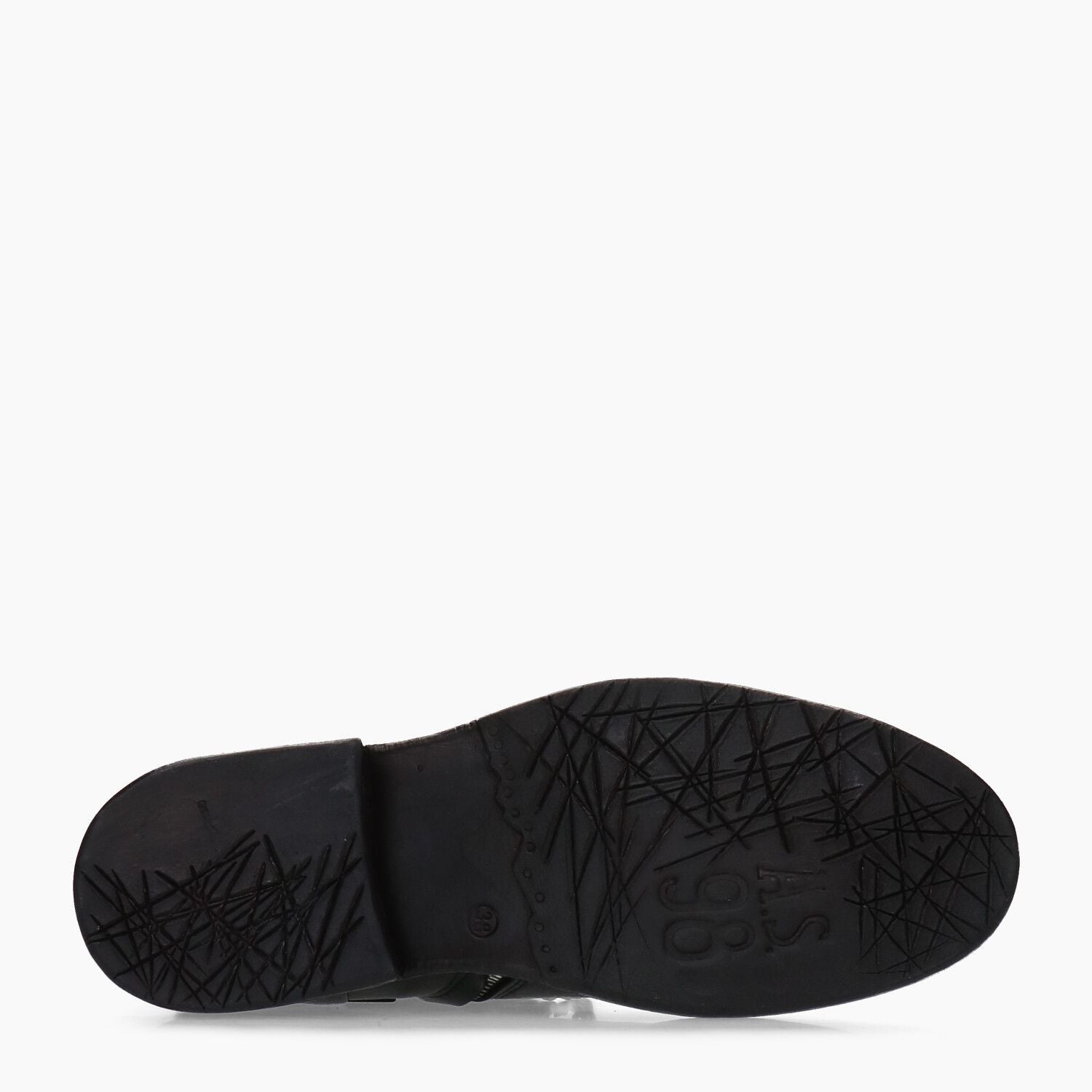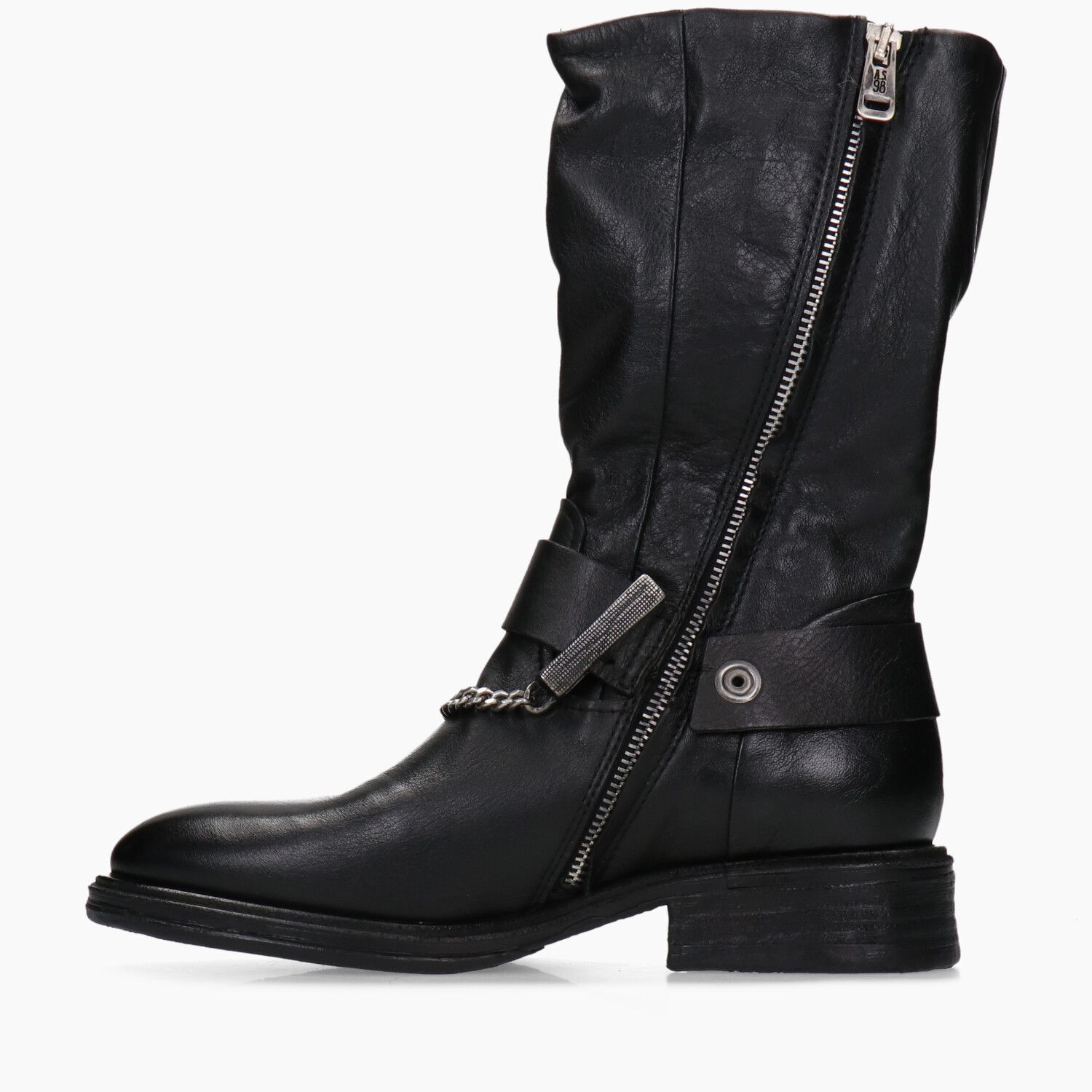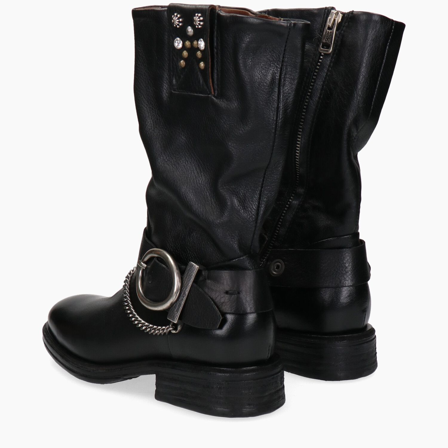 Biker in pelle nera con fibbia e catena in metallo e borchie. Punta tonda. Chiusura con zip laterale. Interno in pelle. Suola in gomma. Tacco di 4 cm. Collezione A.S.98 donna Autunno/Inverno.