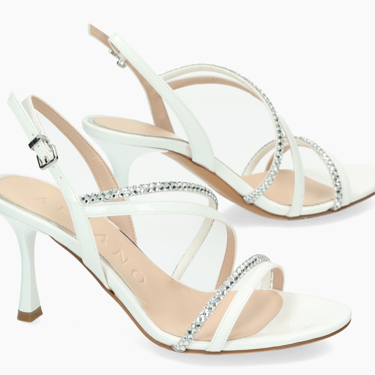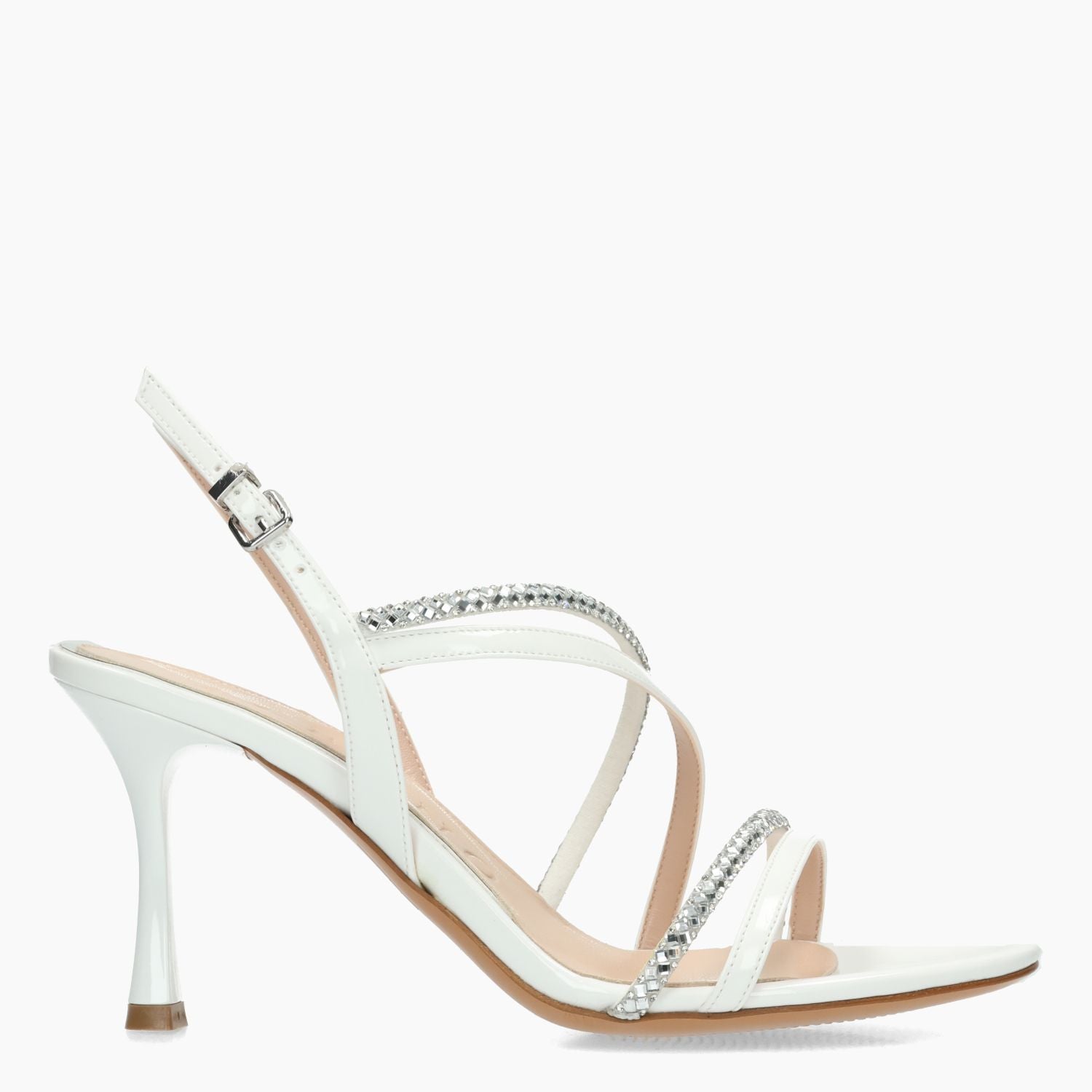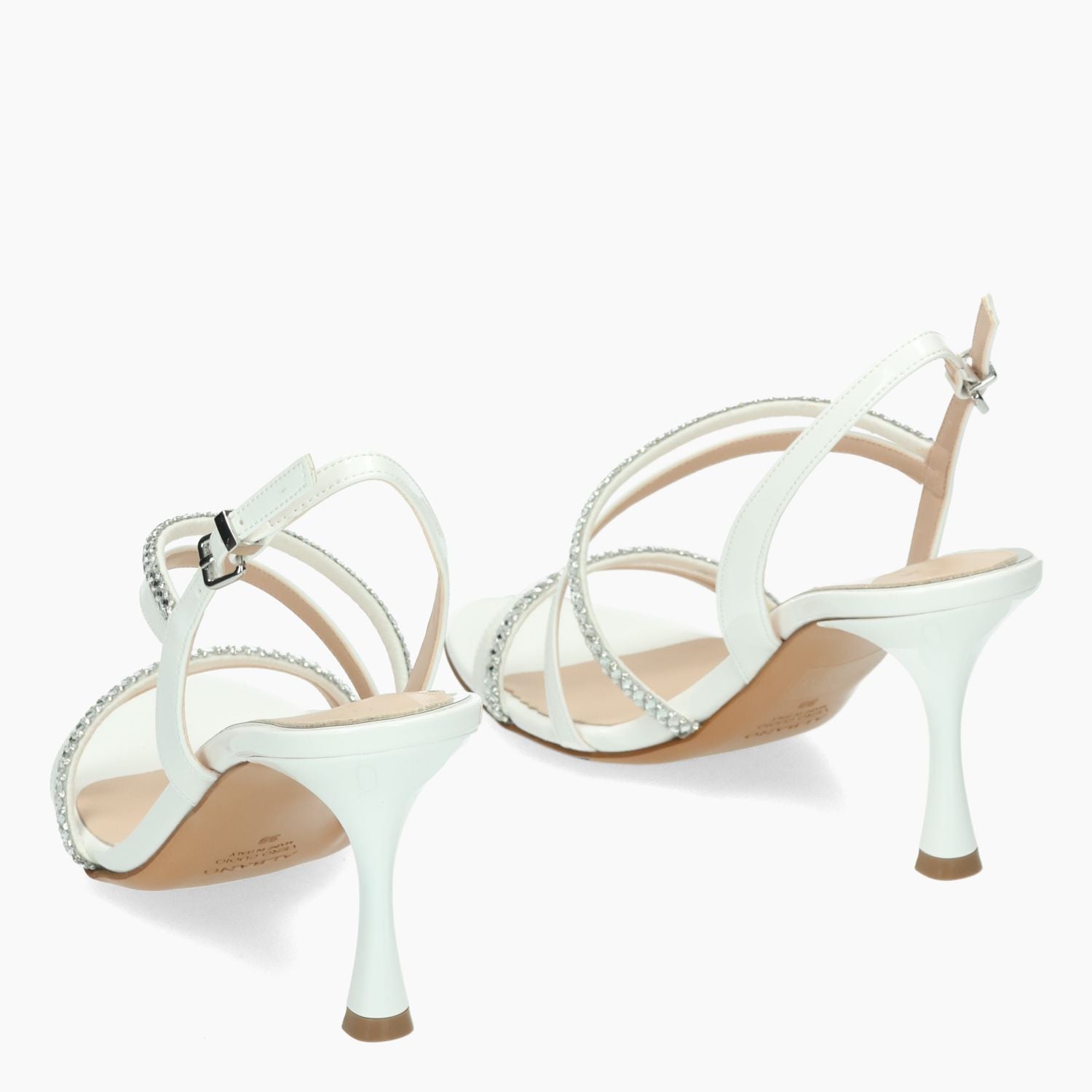 Sandalo in ecopelle in vernice bianca con cinturini in strass argento. Chiusura con cinturino regolabile. Interno in ecopelle con sottopiede in pelle. Suola in cuoio con tacco di 7 cm. Nella scatola è incluso un sacchetto da viaggio. Collezione Albano donna Primavera/Estate.