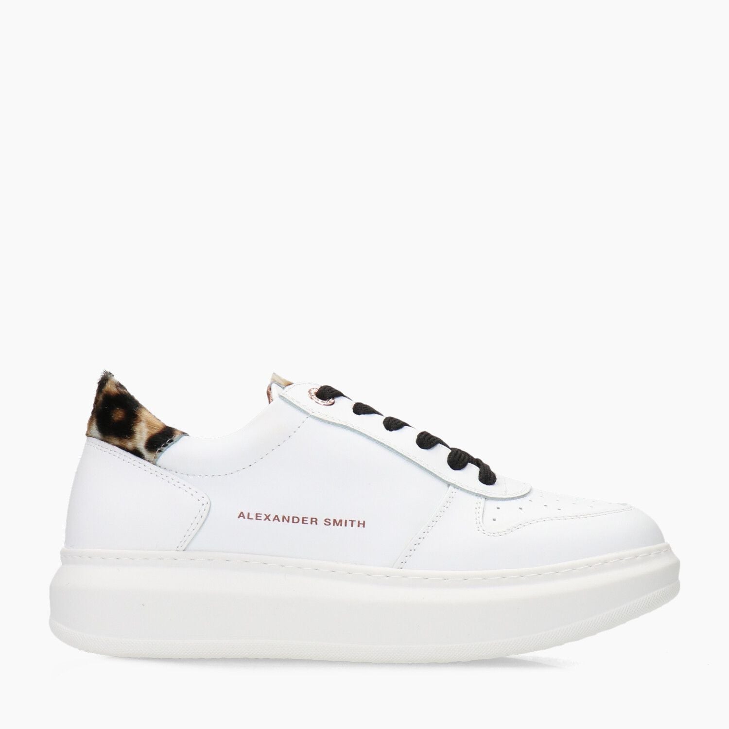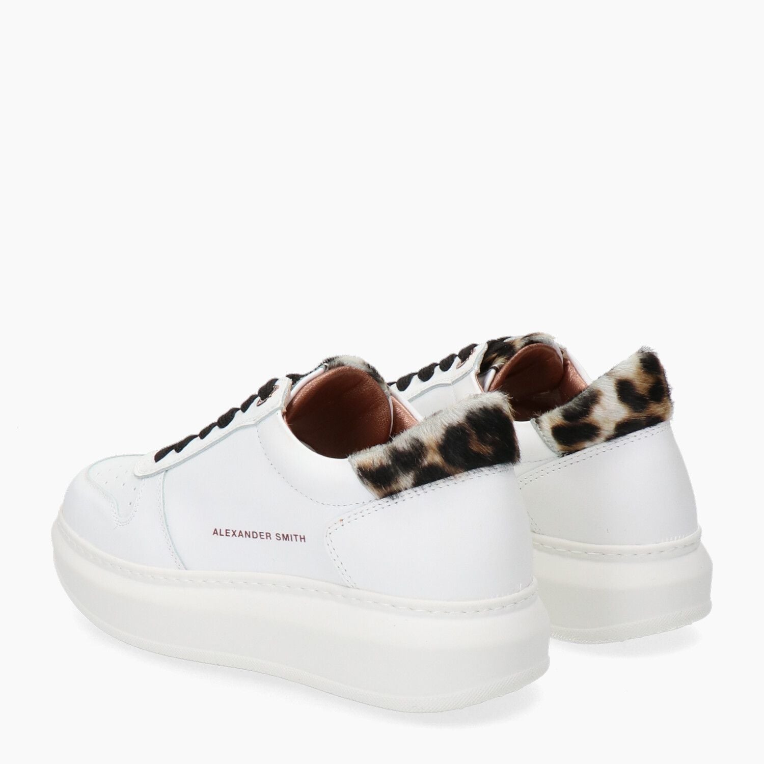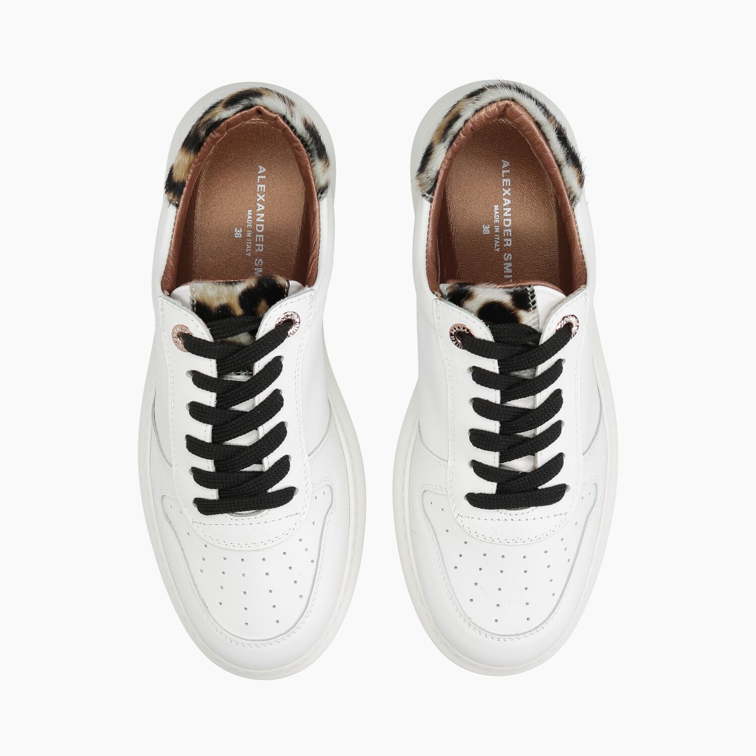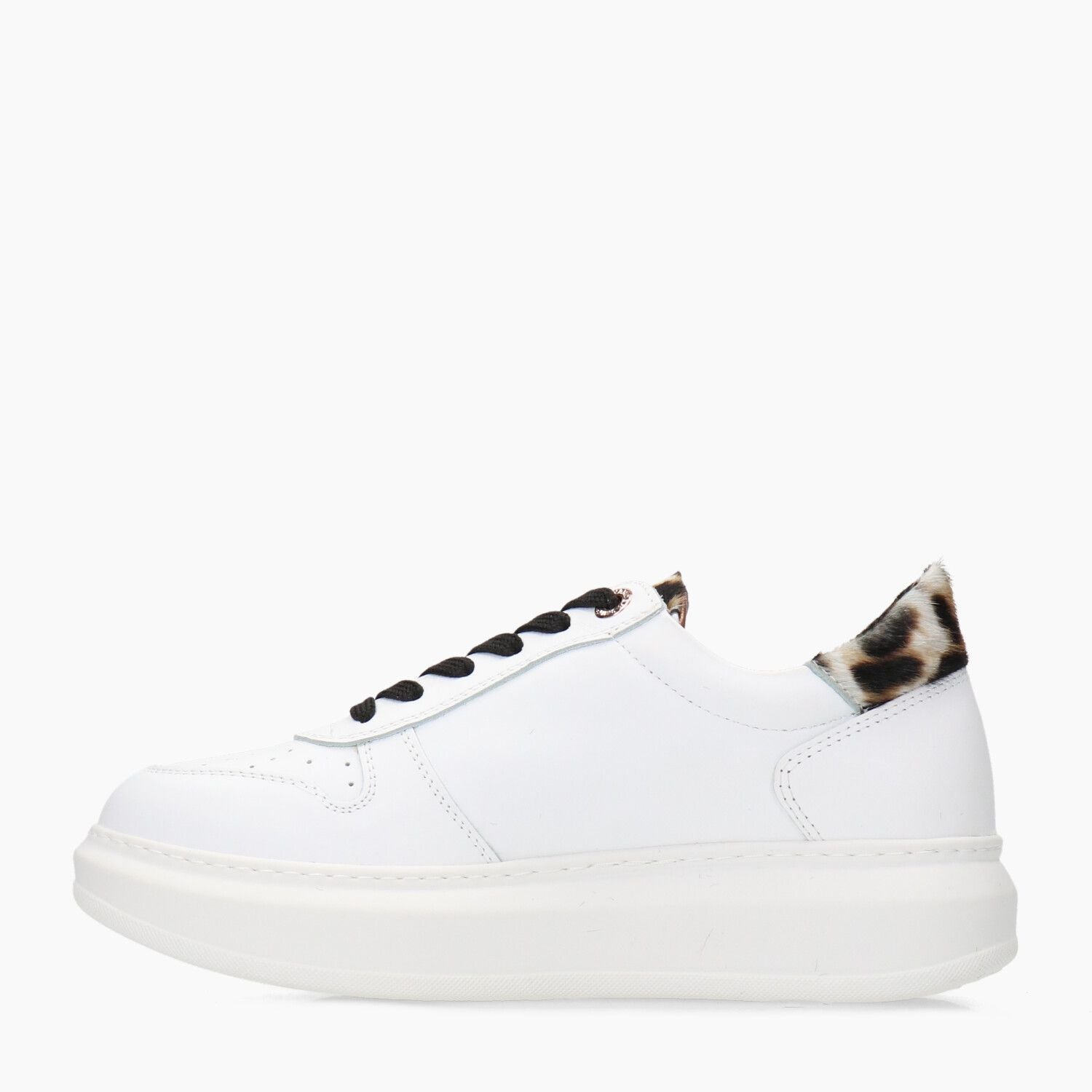 Sneakers in pelle bianca con vaschetta traforata, tallone in cavallino maculato, fondo gomma.