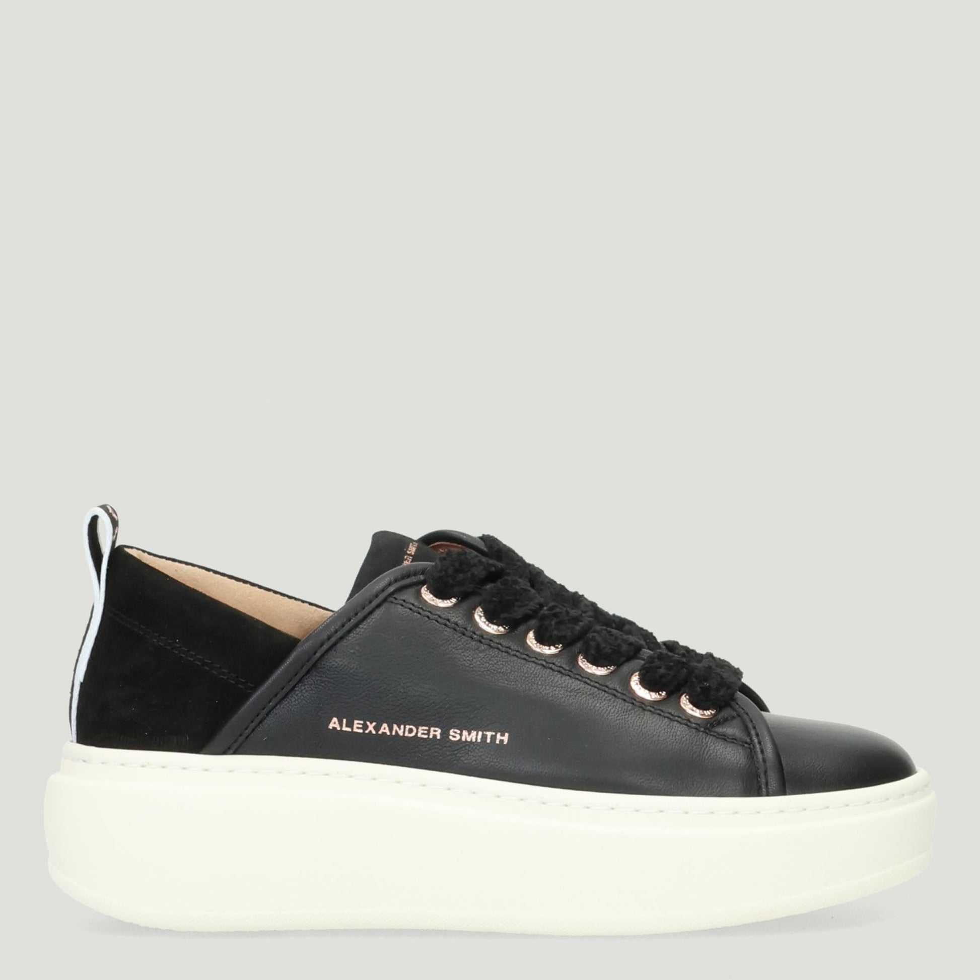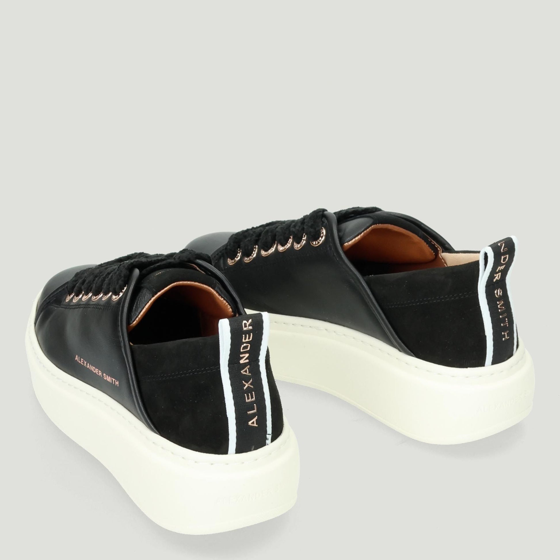 Sneakers Wembley High con tomaia in pelle nera. Tallone in camoscio nero con logo dorato. Sottopiede estraibile in pelle con interni in tessuto. Chiusura con lacci in ciniglia. Linguetta con logo. Suola in gomma di 4 cm. Collezione Alexander Smith donna.