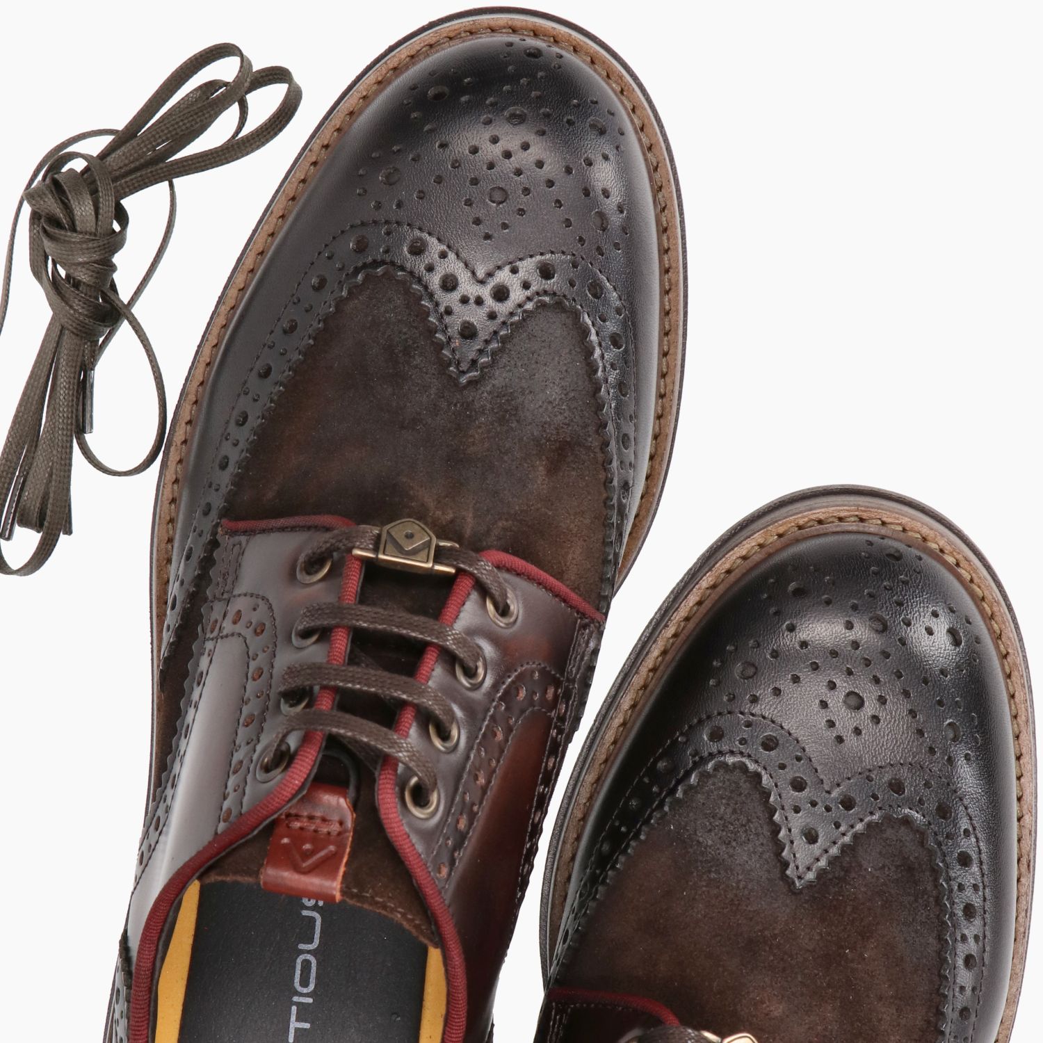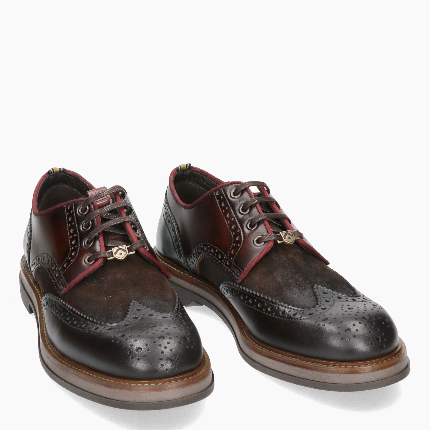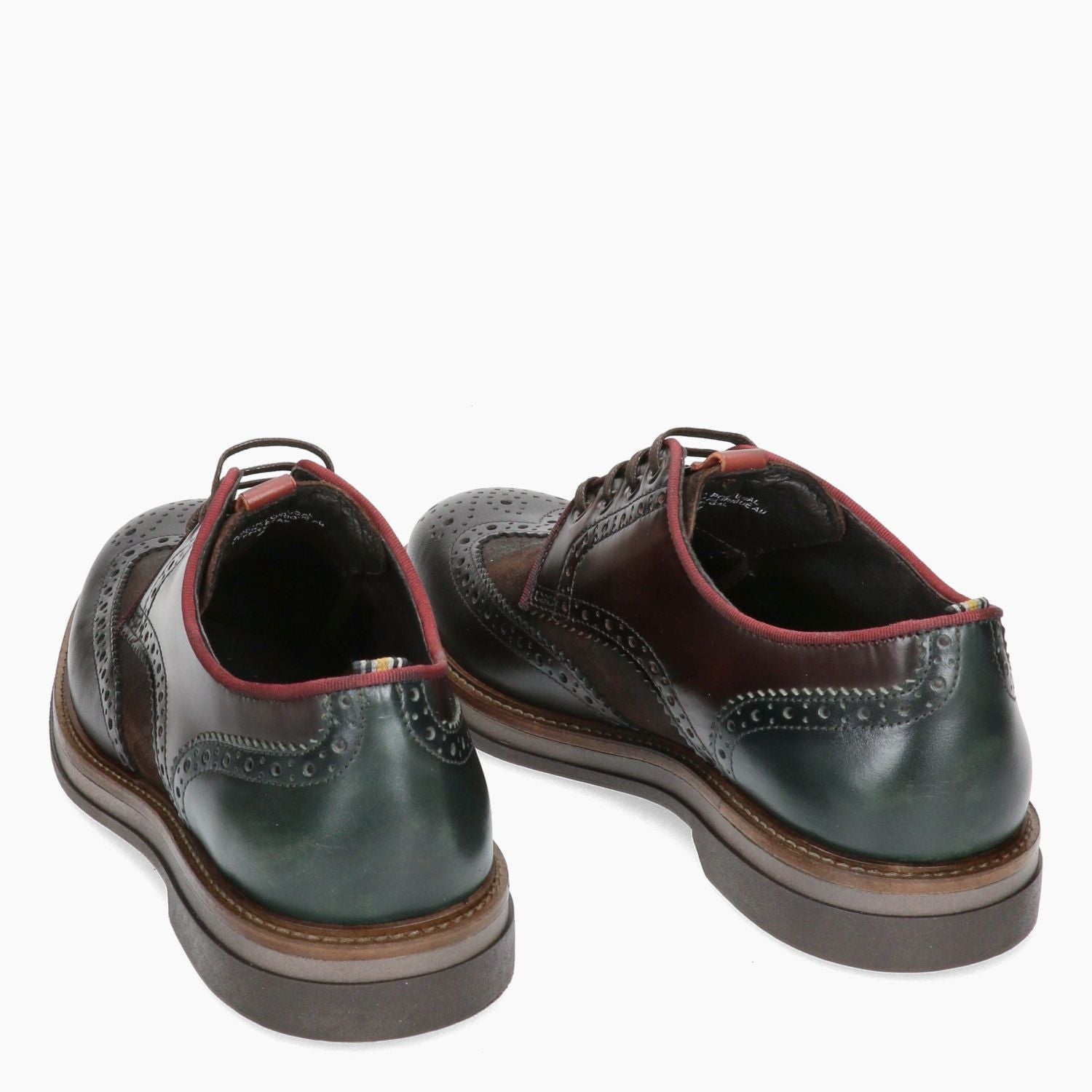 Derby coda rondine con tomaia in pelle e camoscio in colore testa di moro. Interno in pelle e tessuto con sottopiede estraibile. Chiusura con lacci. Linguetta con logo. Suola in gomma. Nella confezione sono presenti dei lacci cerati di ricambio in colore verde militare. Collezione Ambitious uomo Autunno/Inverno.