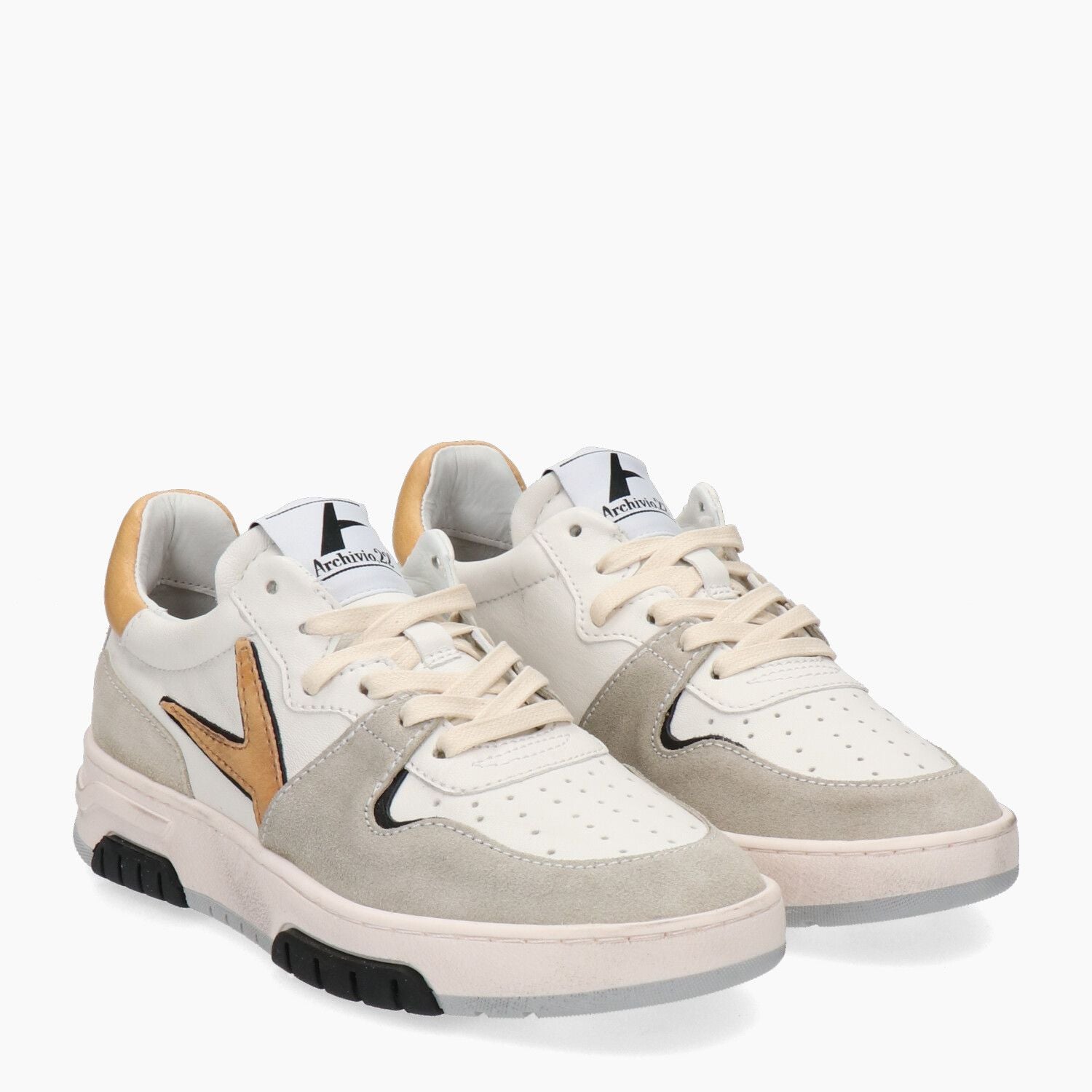 Sneakers con tomaia in pelle in colore bianco e dettagli in pelle scamosciata. Logo in pelle cucito a lato. Punta tonda traforata. Chiusura con lacci in cotone in colore avorio. Linguetta con logo in tessuto cucito. Talloncino in pelle in colore beige con logo. Interno in pelle. Soletta interna rimovibile. Suola in gomma. Suola di 4,5 cm. Nella scatola è presente un sacchetto protettivo. Collezione Archivio 22 donna.