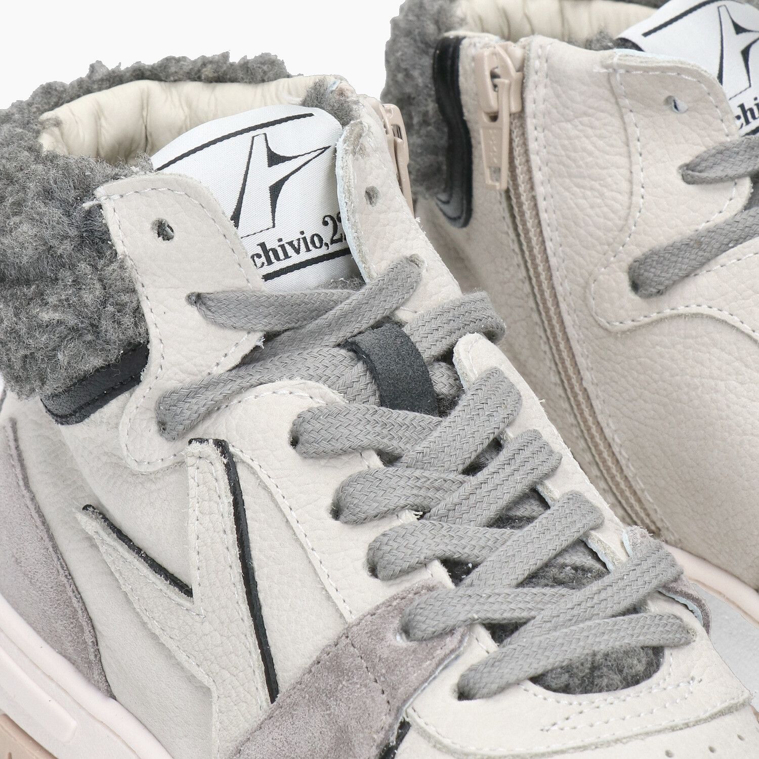 Sneakers alte Archivio 22 con tomaia in pelle in colore bianco con dettagli a contrasto in camoscio grigio. Bordo superiore in lana grigia. Punta tonda. Chiusura con lacci e zip. Linguetta con logo. Soletta interna rimovibile. Suola in gomma. Collezione Archivio 22 donna Autunno/Inverno.