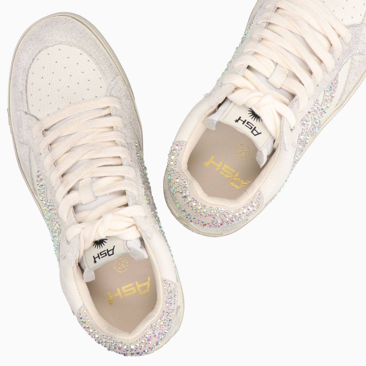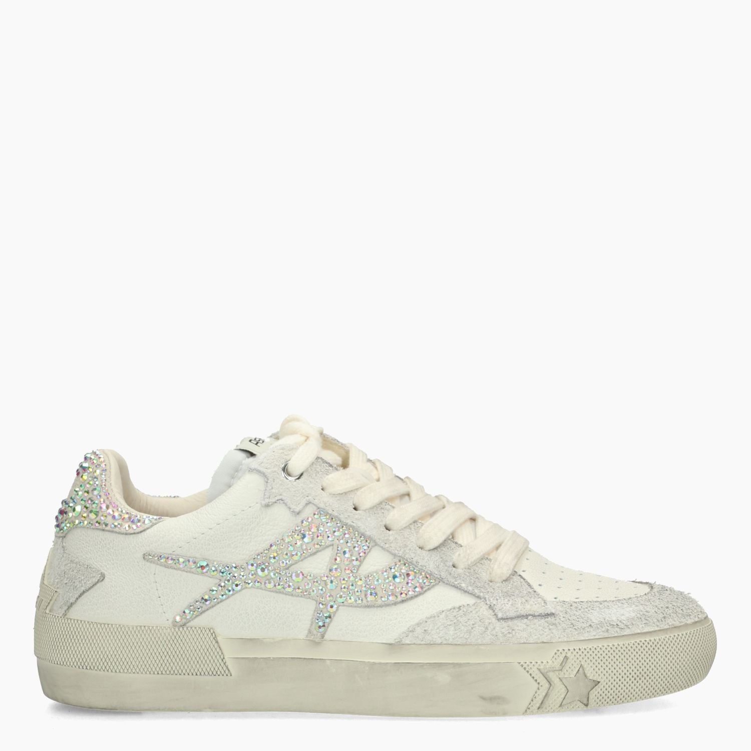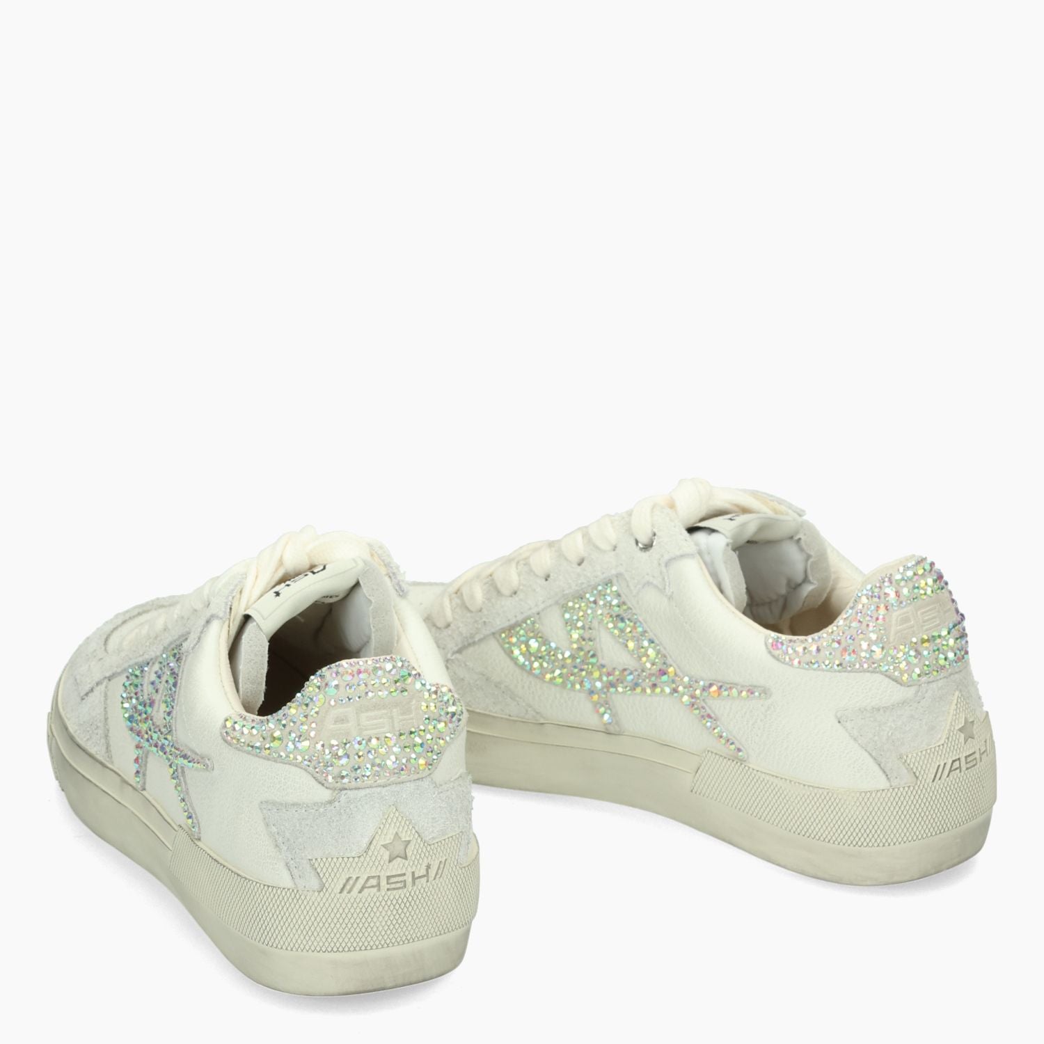 Sneakers in pelle bianca off white effetto vintage con strass multicolor. Interno in pelle con sottopiede estraibile. Suola in gomma. Collezione Ash donna.
