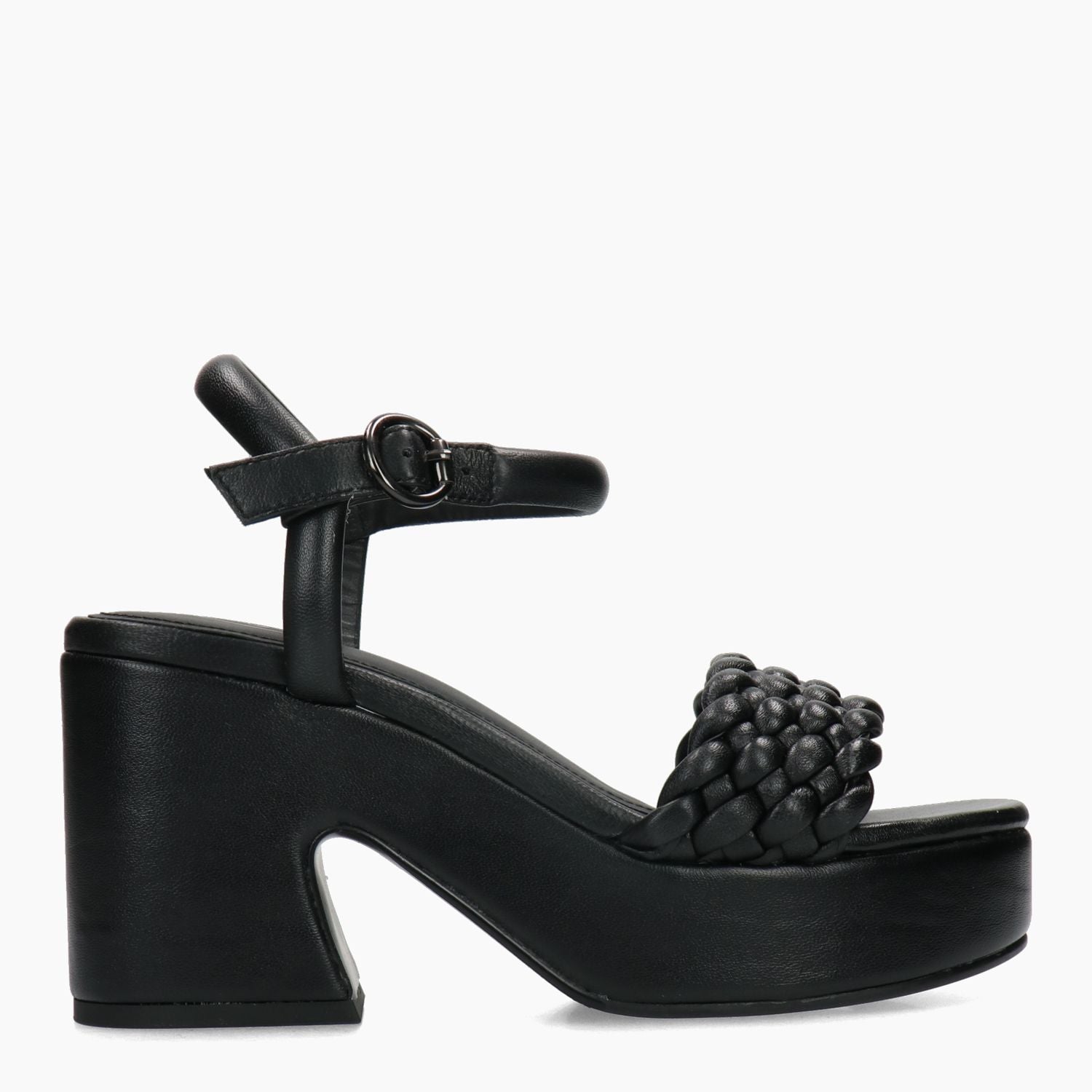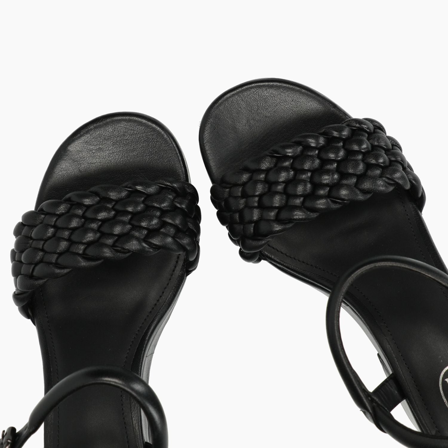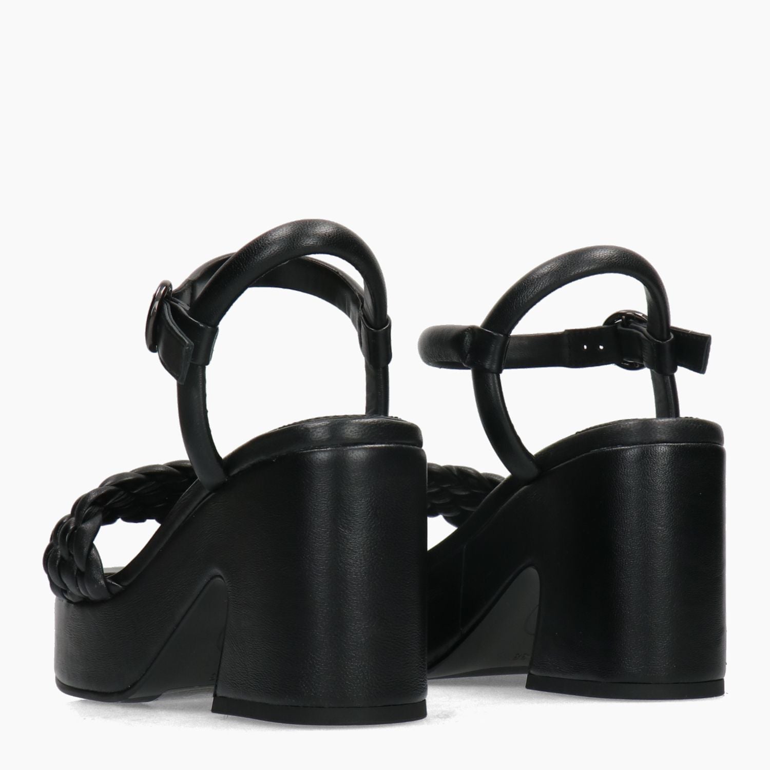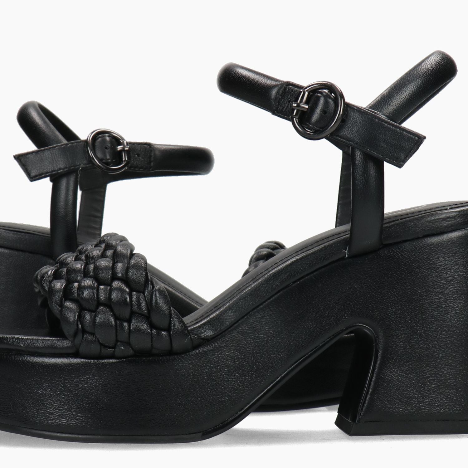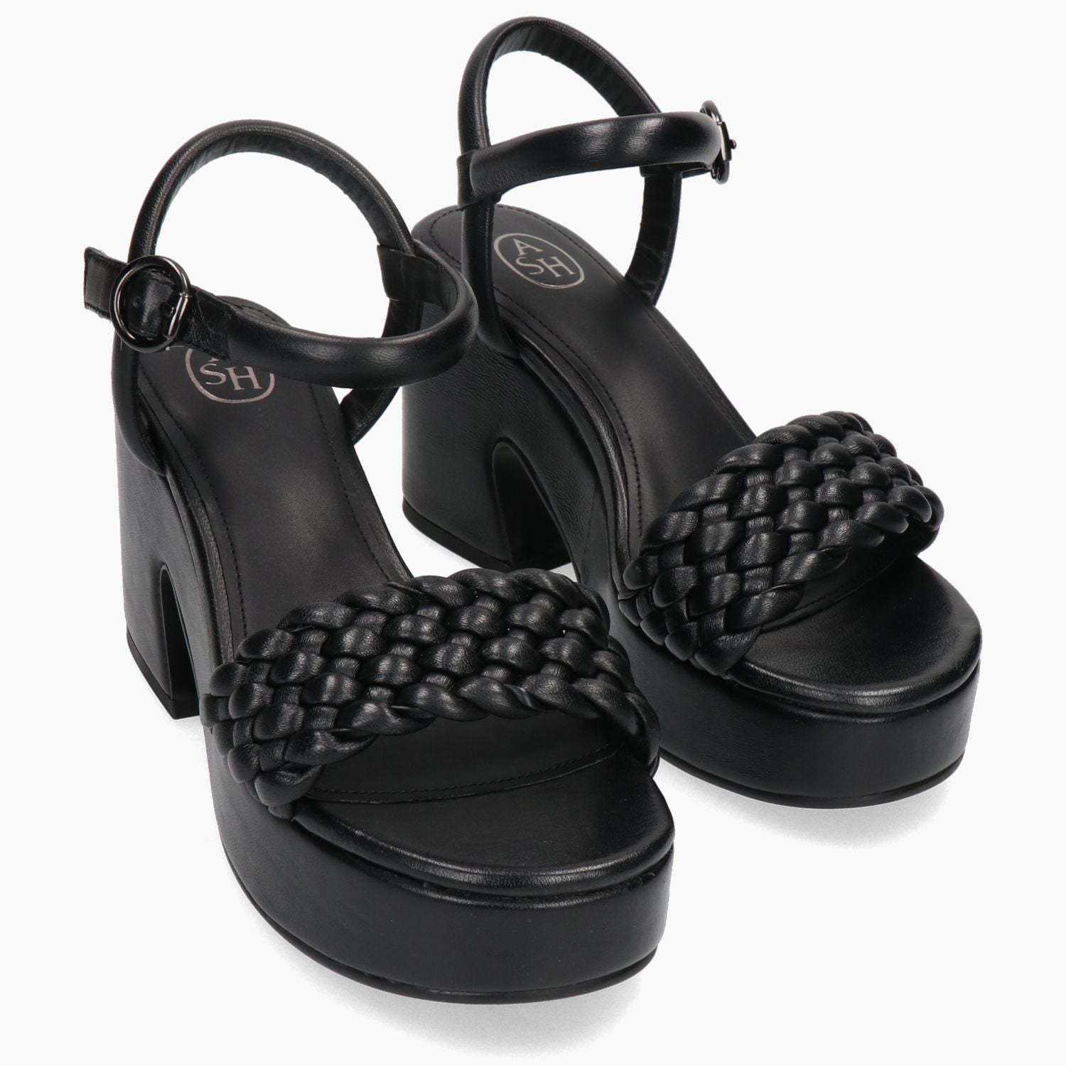 Sandalo in pelle nera con fascetta intrecciata. Cinturino alla caviglia con fibbia regolabile. Interno in pelle. Suola in gomma con tacco di 8 cm e plateau di 3 cm. Collezione Ash primavera/estate.