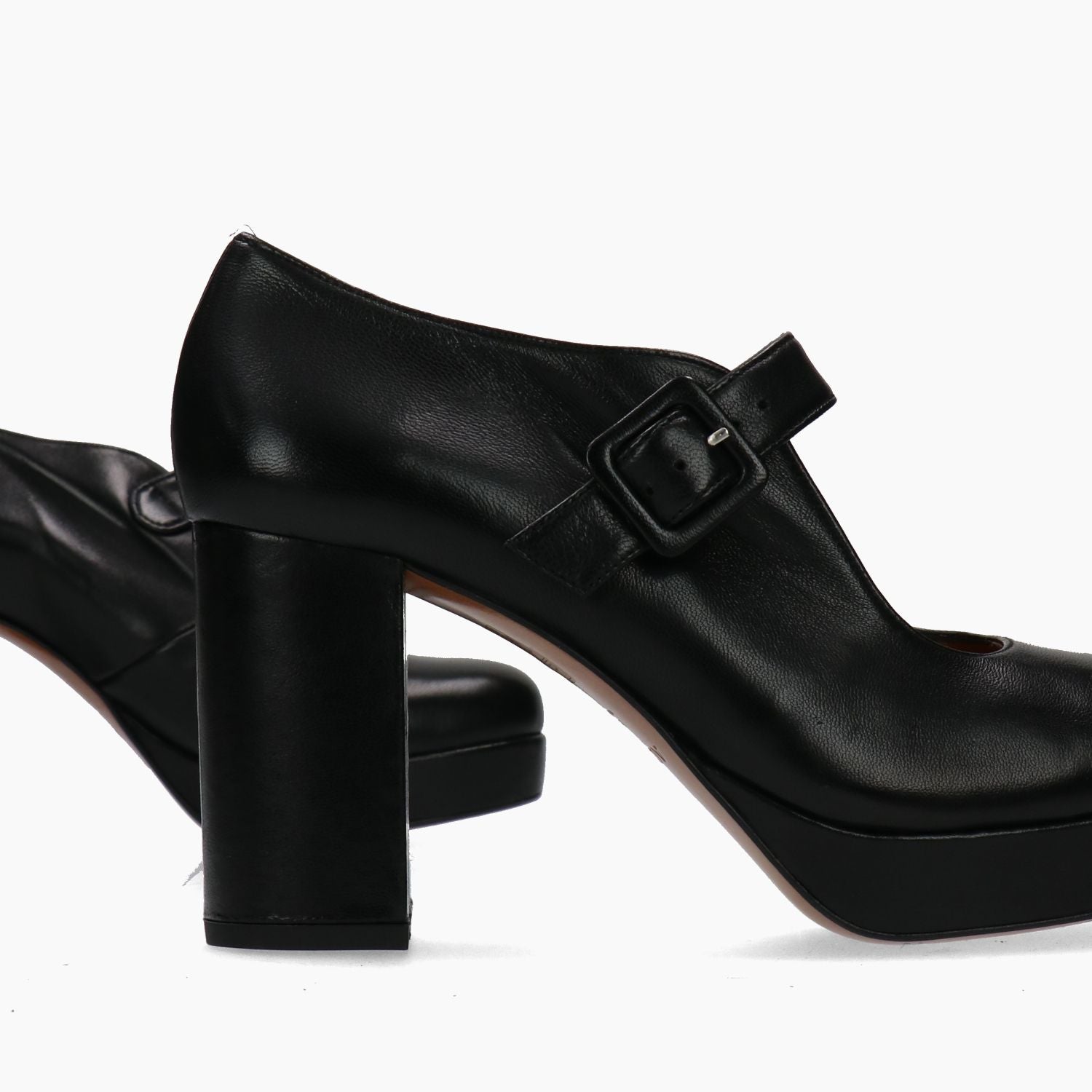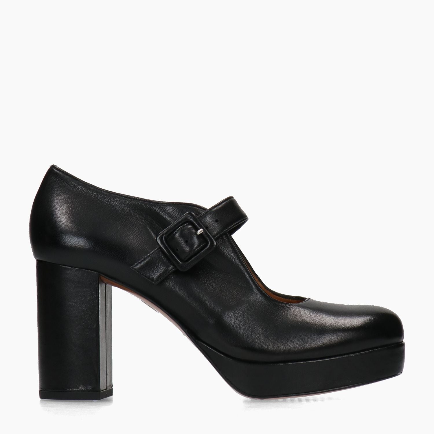 Decollete con plateau. Tomaia in pelle nera. Punta tonda. Interno in pelle in colore beige. Chiusura con cinturitno e fibbia ricoperta. Suola in cuoio. Tacco 8 cm con plateau di 2 cm. Collezione Audley donna Autunno-inverno.