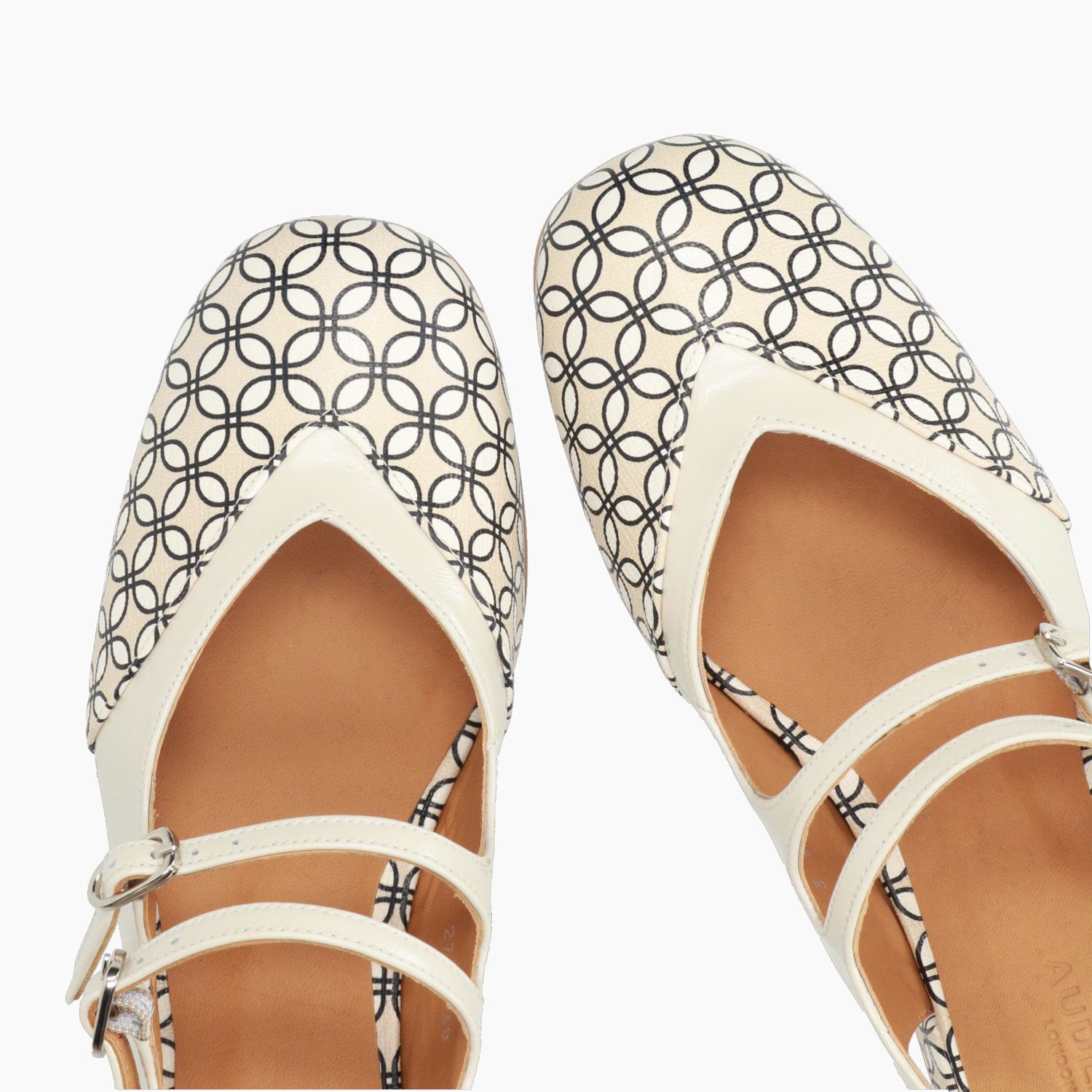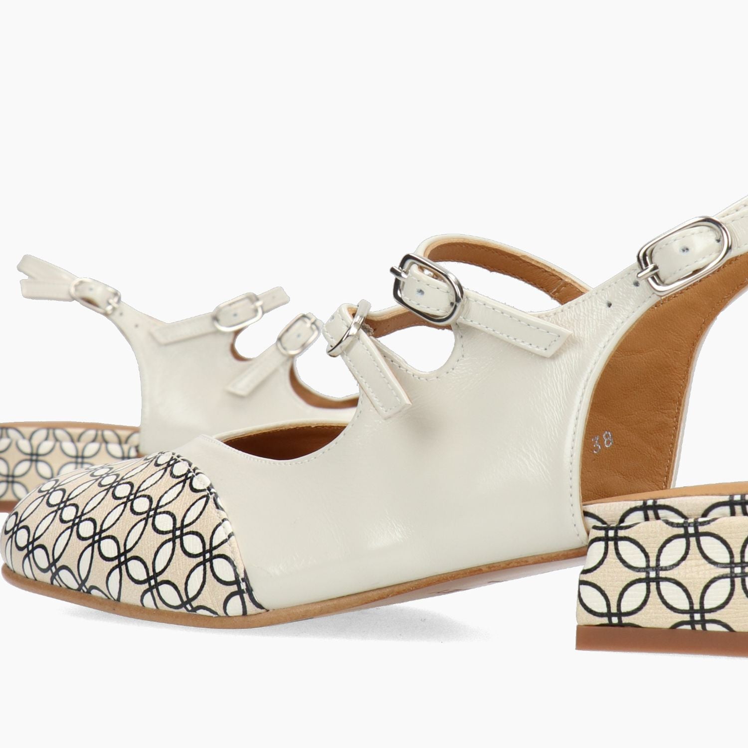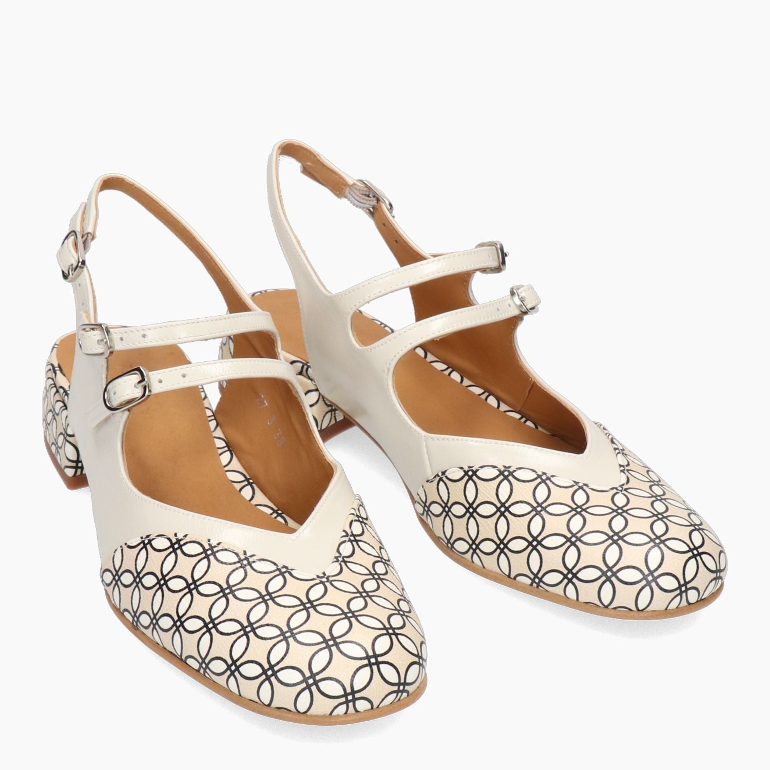 Chanel in pelle beige e fantasia con disegno a cravatta. Regolazione con tre fibbie. Interno in pelle con sottopiede imbottito. Suola in cuoio e gomma con tacco di 3,5 cm. Collezione Audley Primavera/Estate.