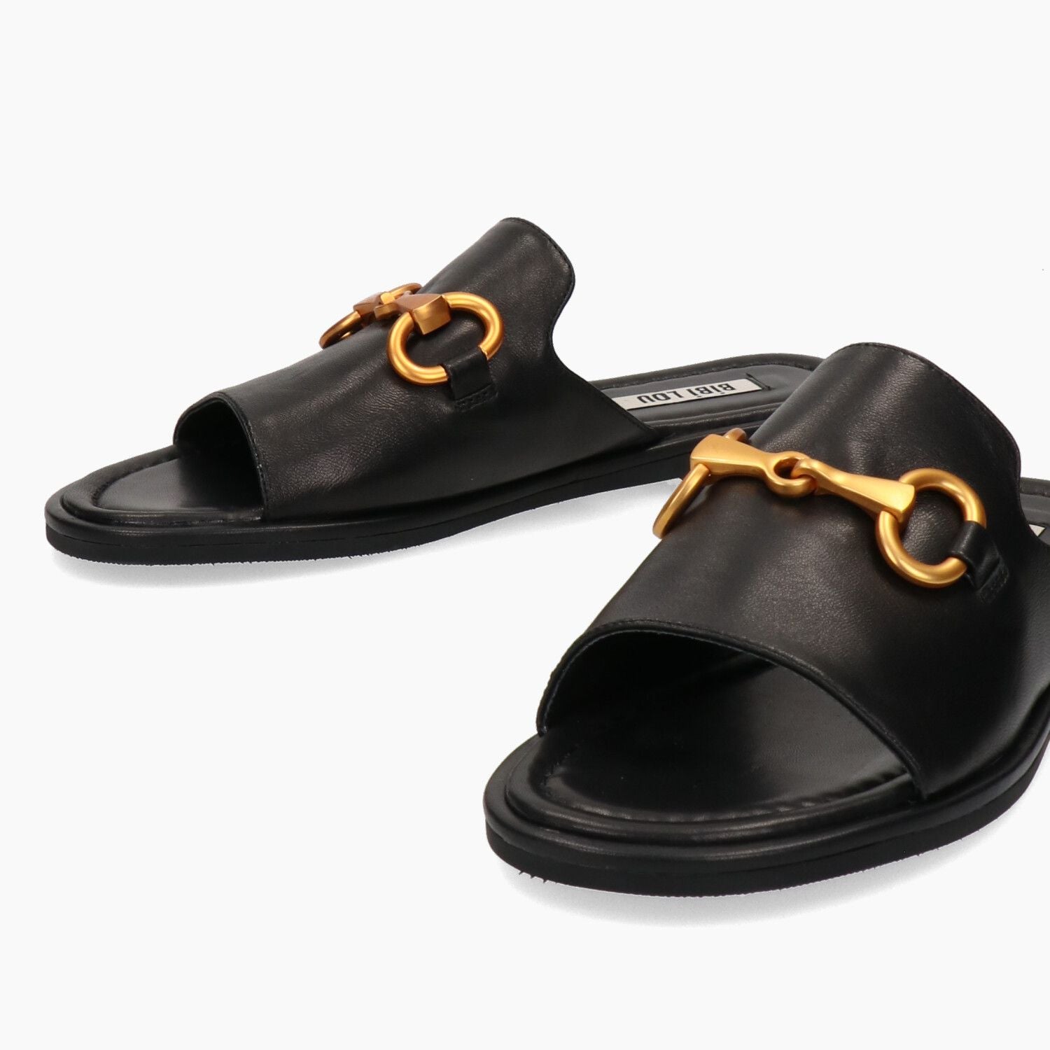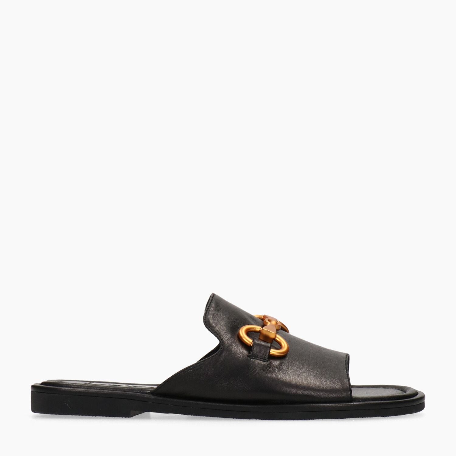 Ciabatte in pelle nera con morsetto dorato, fondo gomma.
