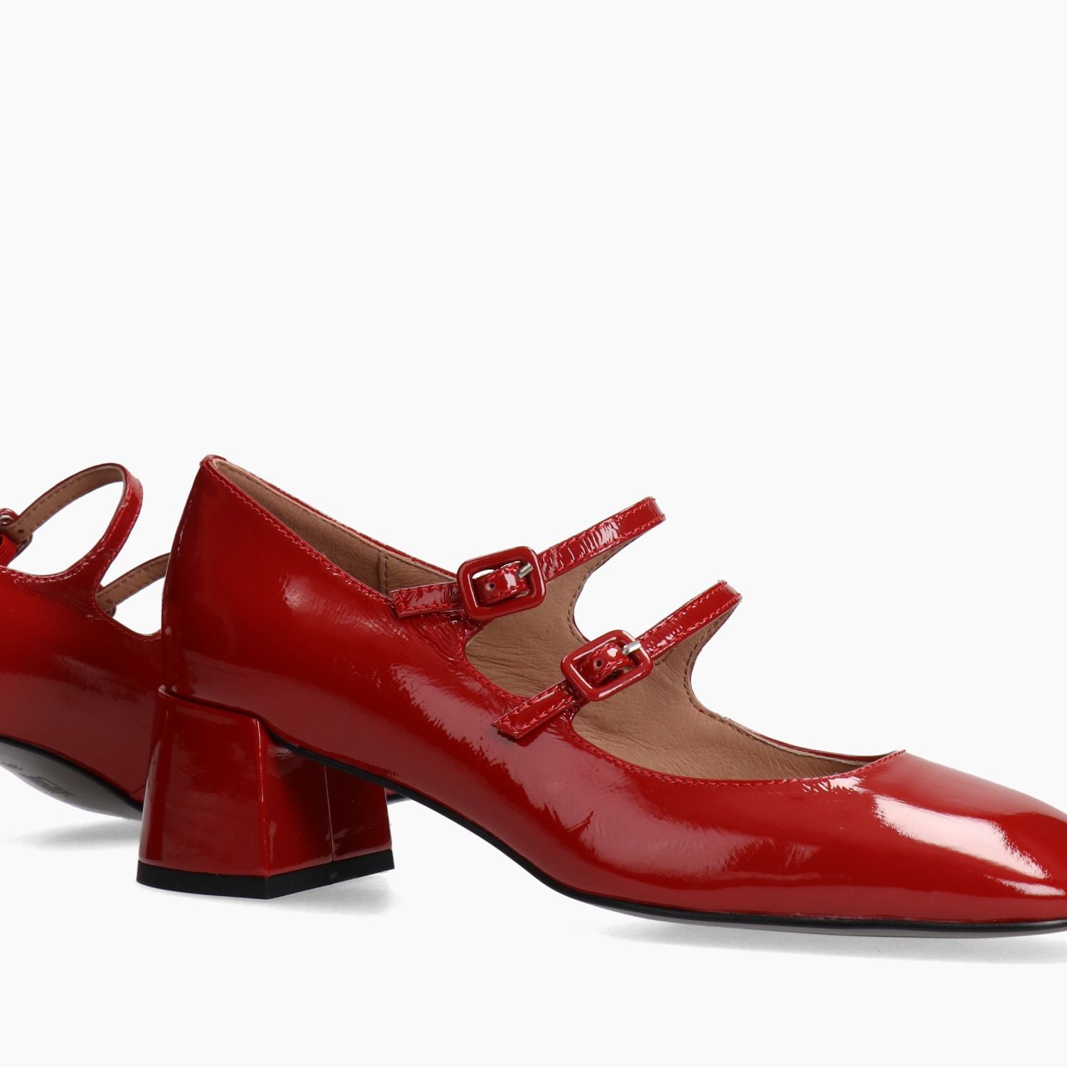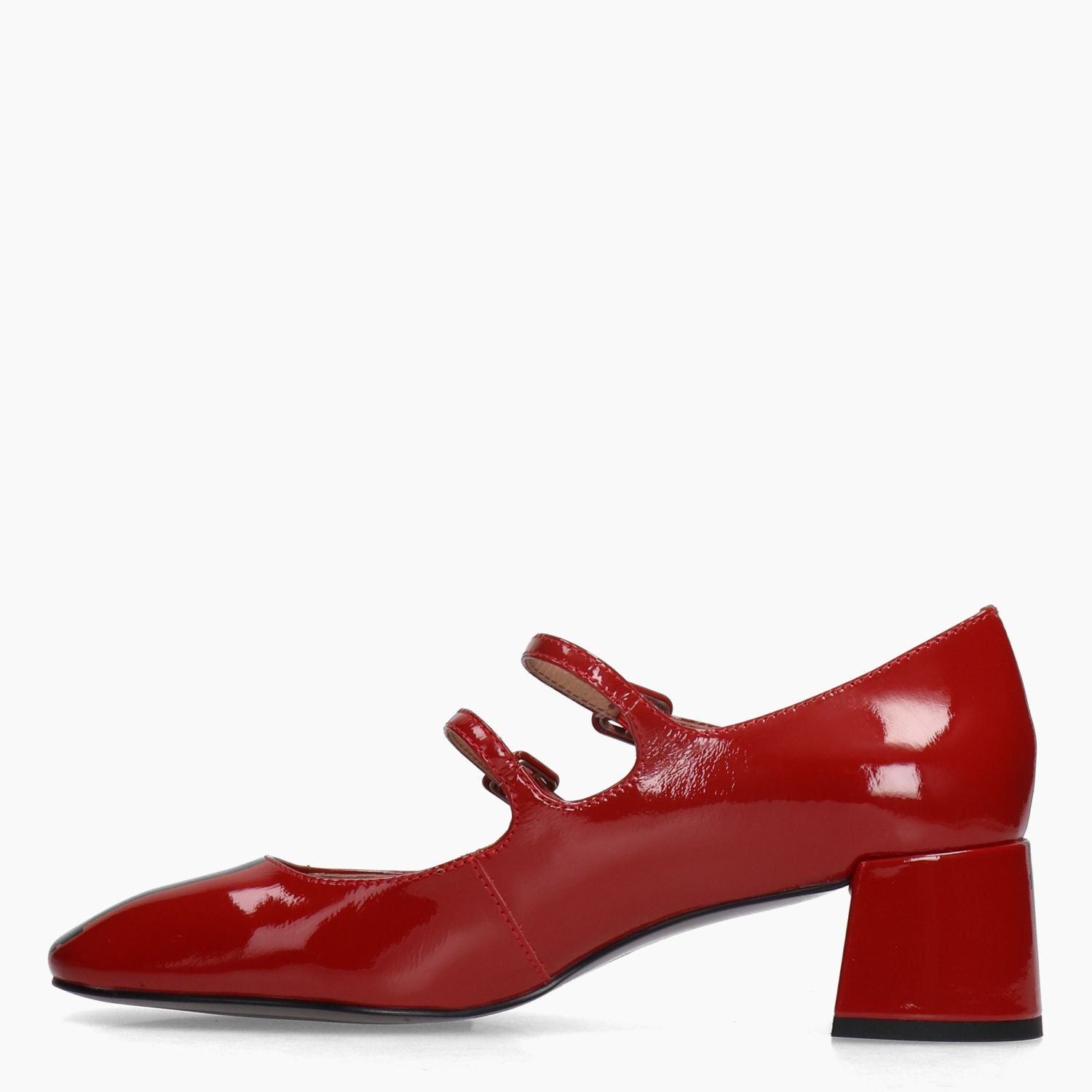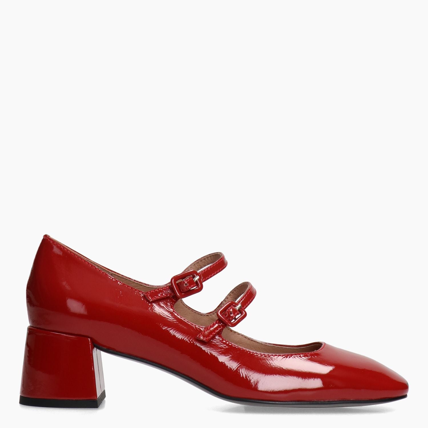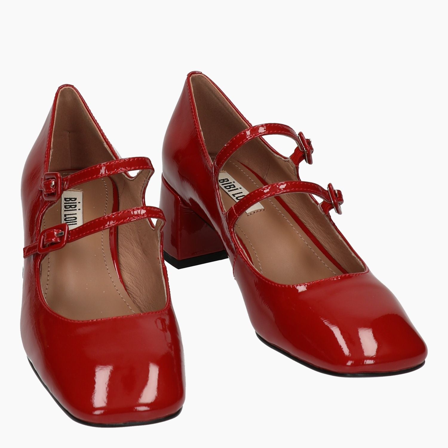 Mary Jane con tomaia in pelle verniciata rossa con doppio cinturino regolabile. Punta quadrata. Interno in pelle. Suola in gomma. Tacco di 4,5 cm. Collezione Bibi Lou donna autunno/inverno.
