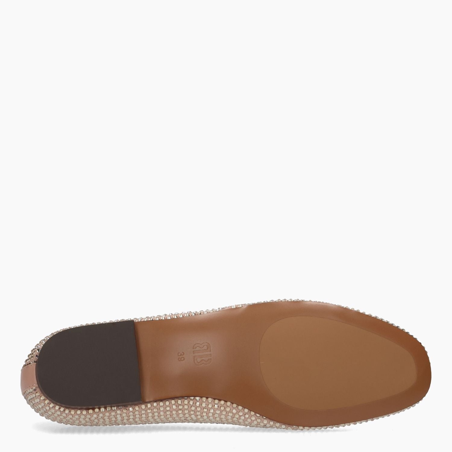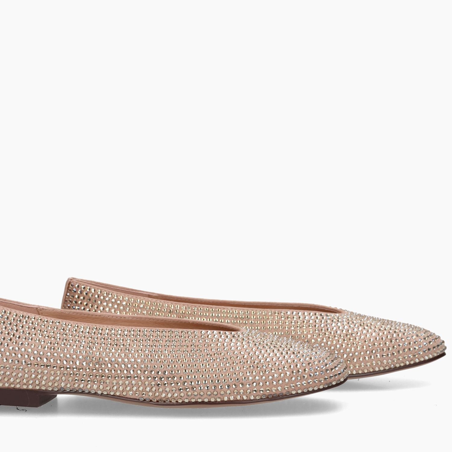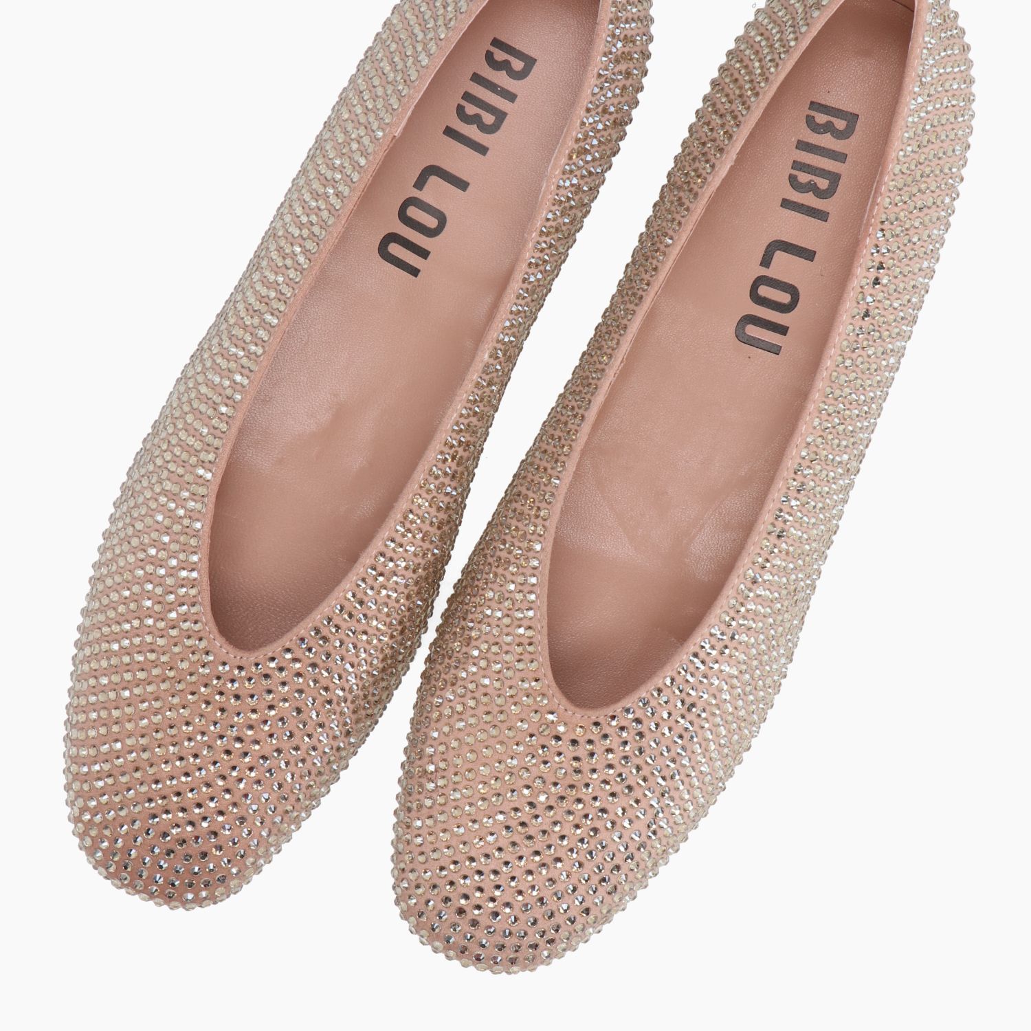 Ballerina color nude con tomaia interamente ricoperta di strass argento. Interno in pelle. Suola in gomma con tacco di 1 cm. Collezione Bibi Lou donna primavera/estate.