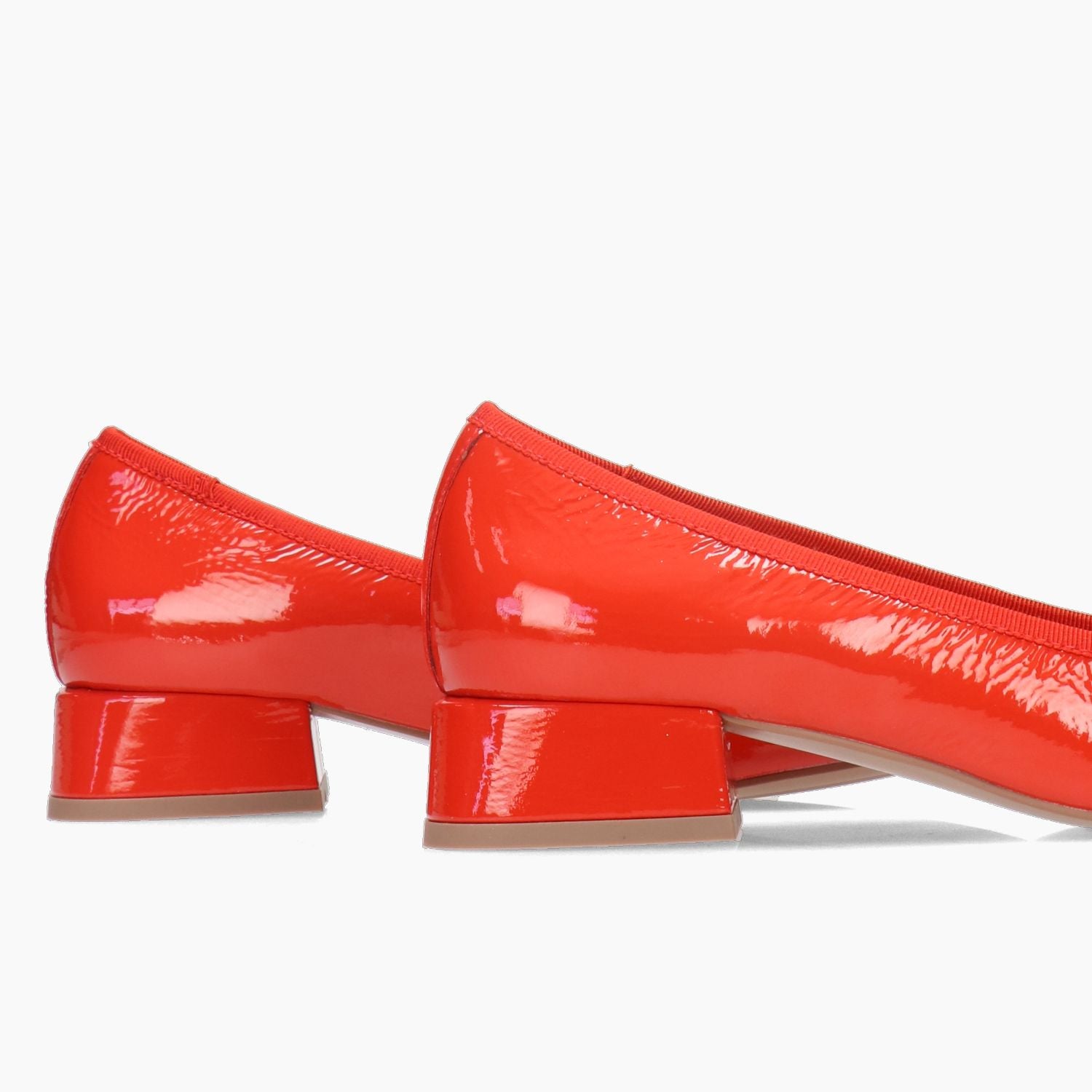 Ballerine Bibi Lou con tomaia in pelle verniciata in colore rosso corallo con fiocco in tinta. Interno in pelle. Suola in gomma con tacco di 3 cm. Collezione Bibi Lou donna Primavera/Estate.