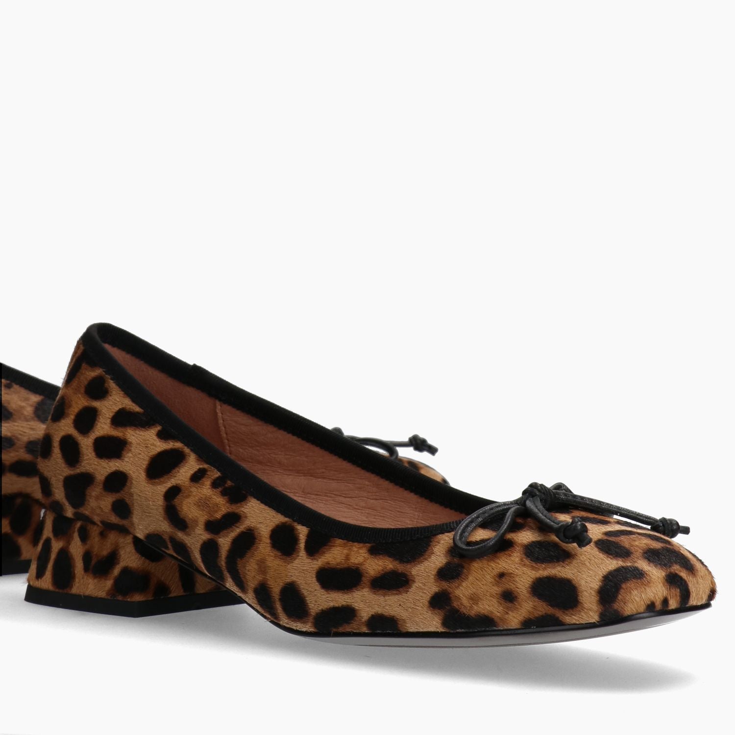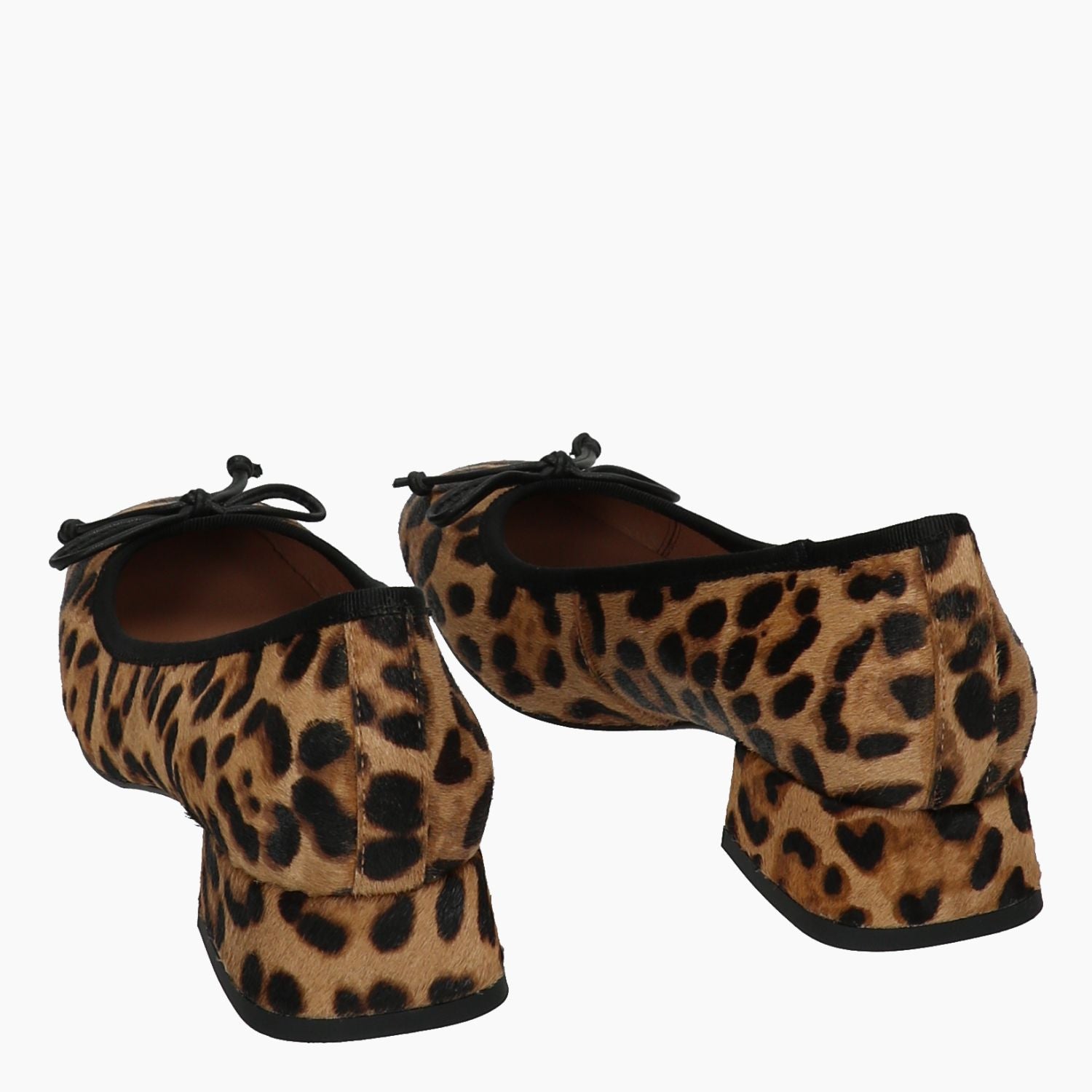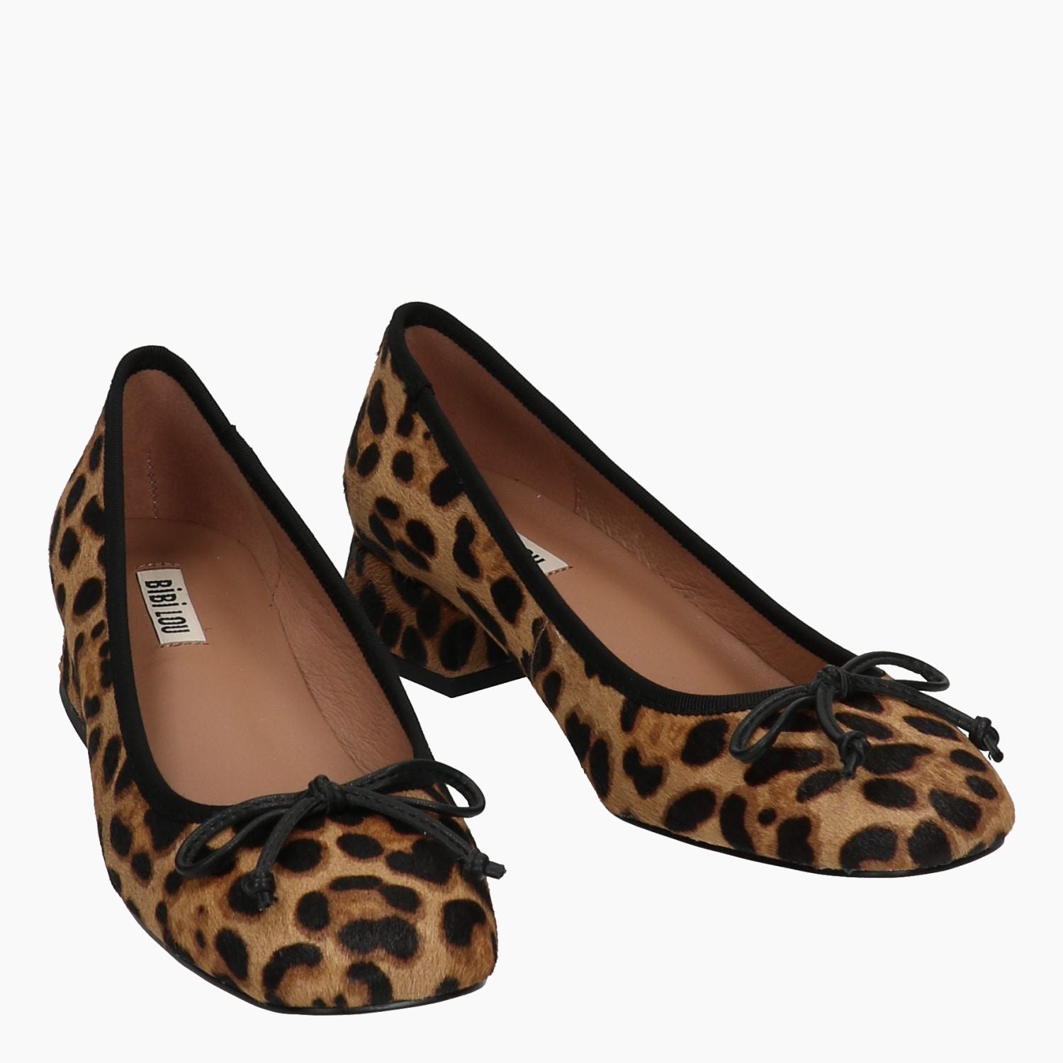 Ballerina con tomaia in cavallino maculato con rifinitura in gro nero. Punta quadrata. Interno in pelle. Suola in gomma con tacco di 3 cm. Collezione Bibi Lou donna autunno/inverno.