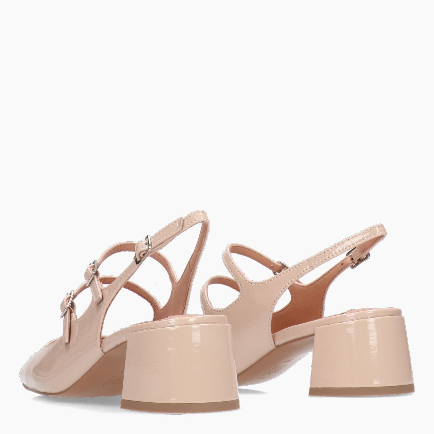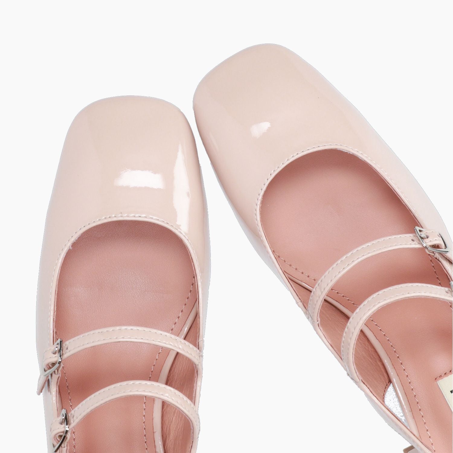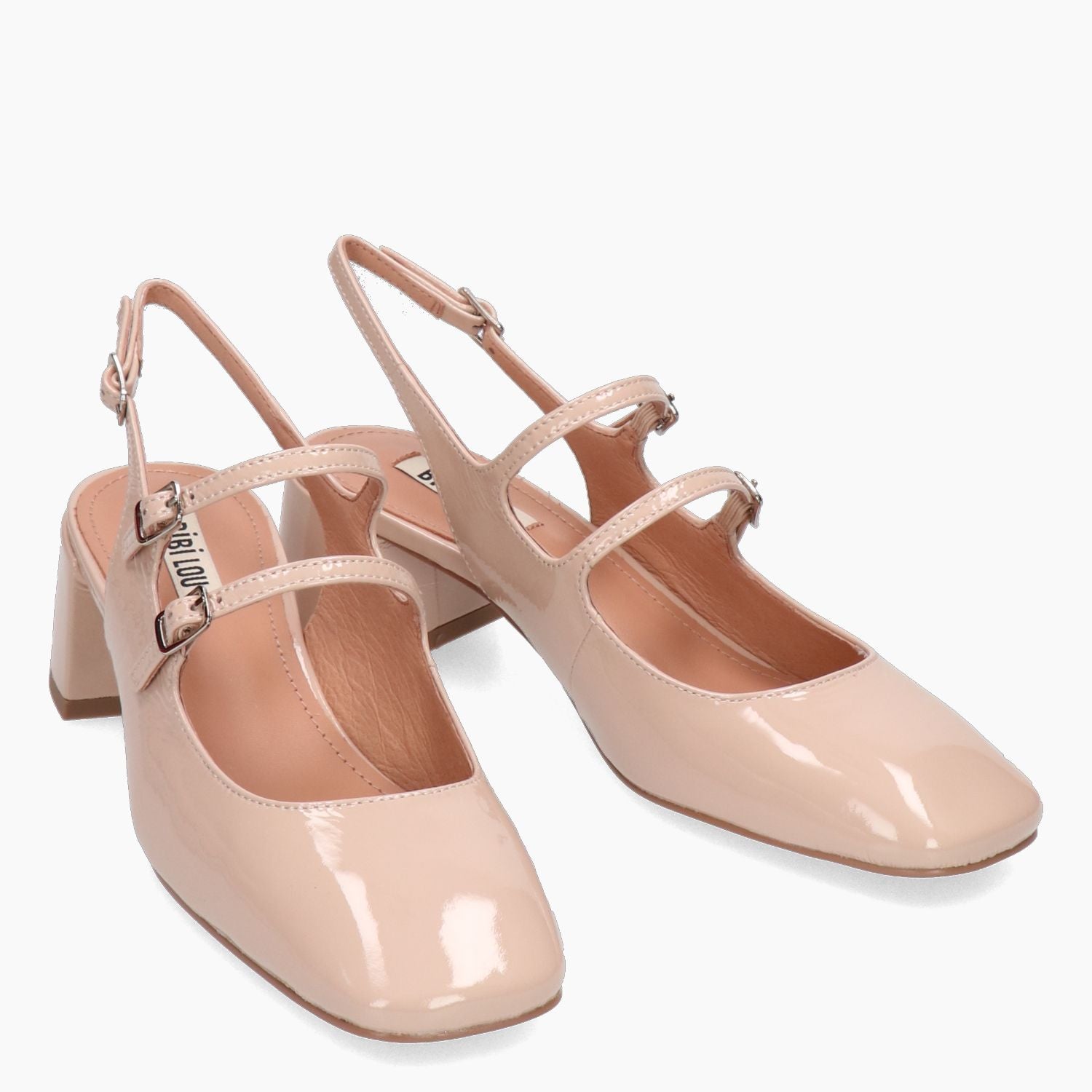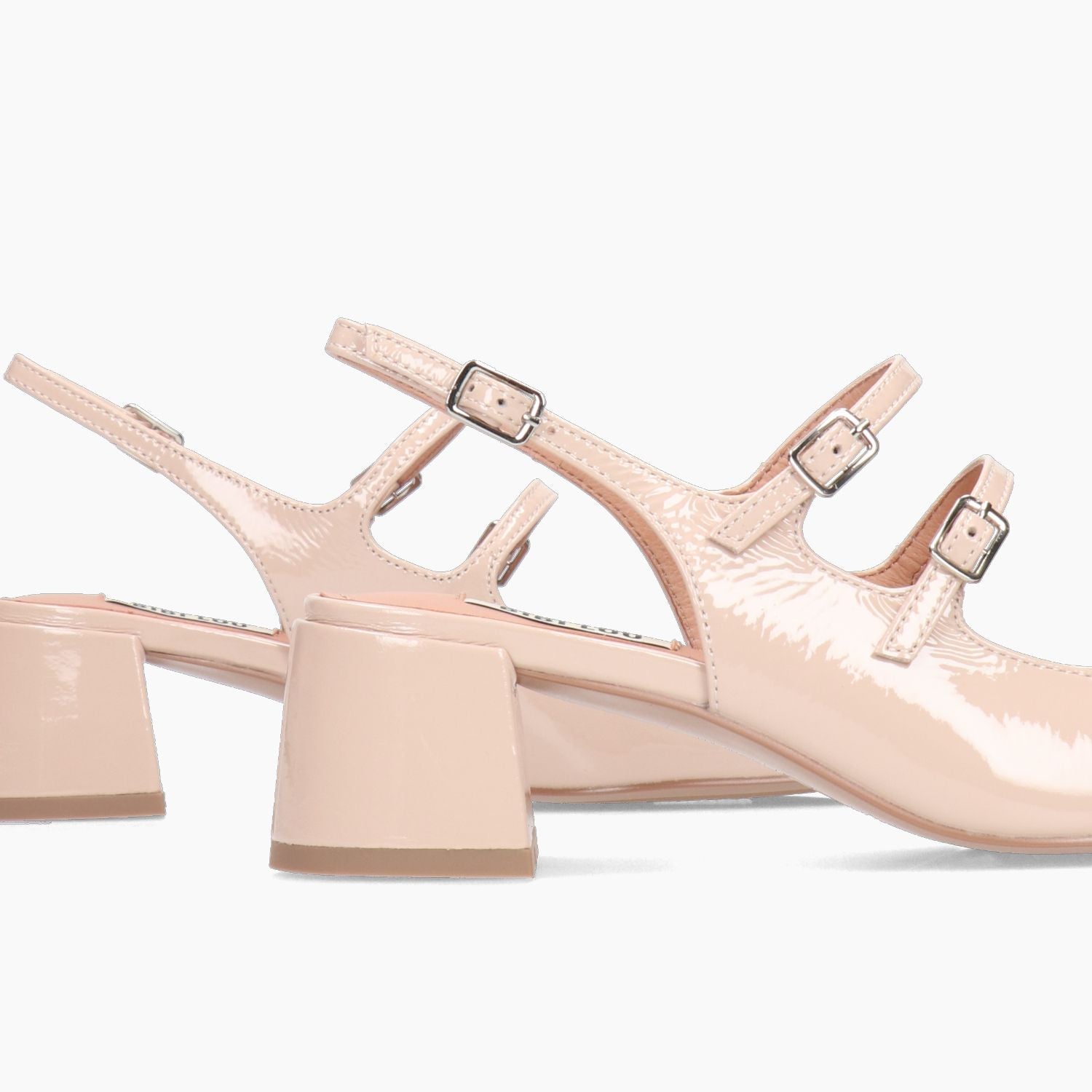 Chanel in vernice naplak nude con triplo cinturino regolabile. Interno in pelle. Suola in gomma con tacco di 4 cm. Collezione Bibi Lou donna primavera/estate.