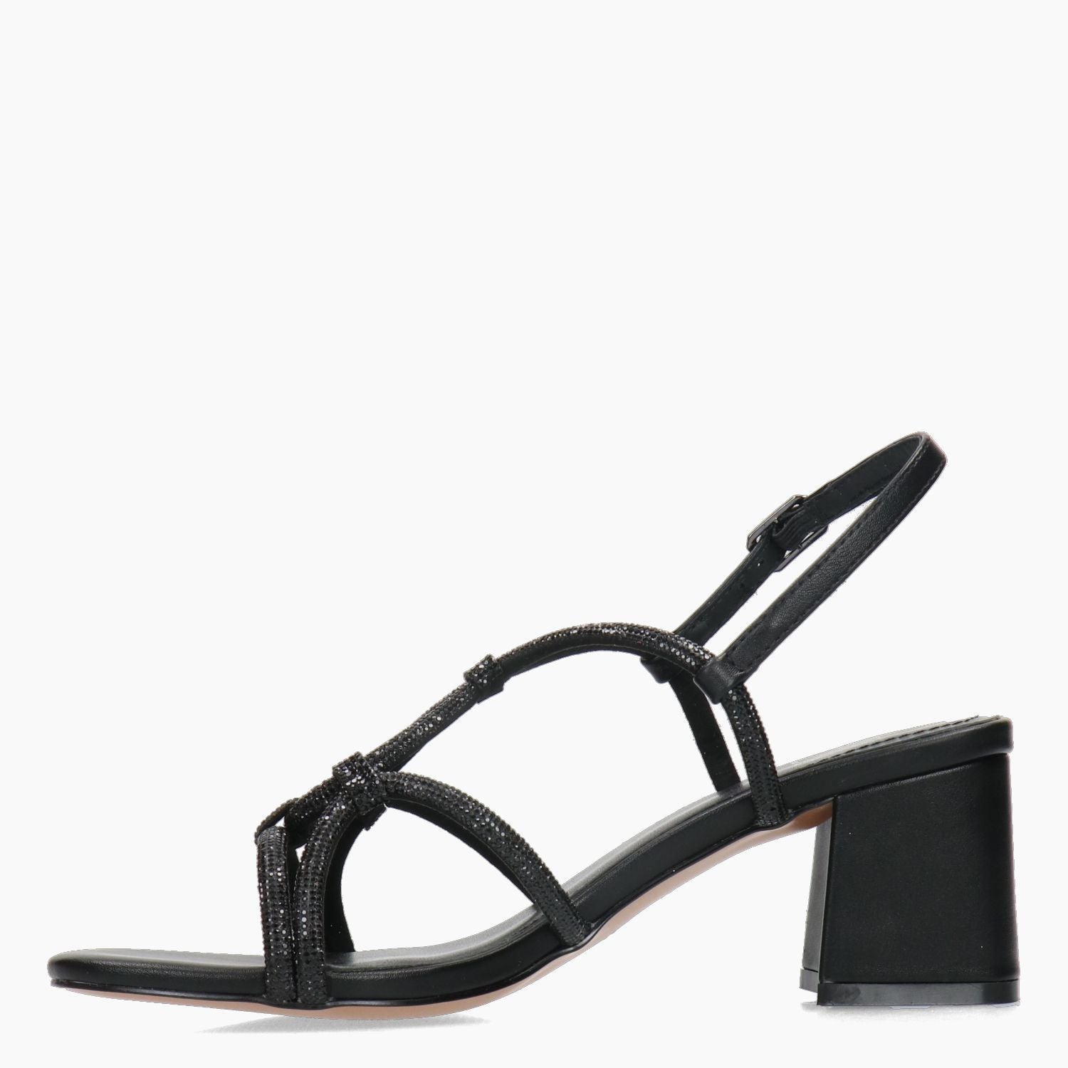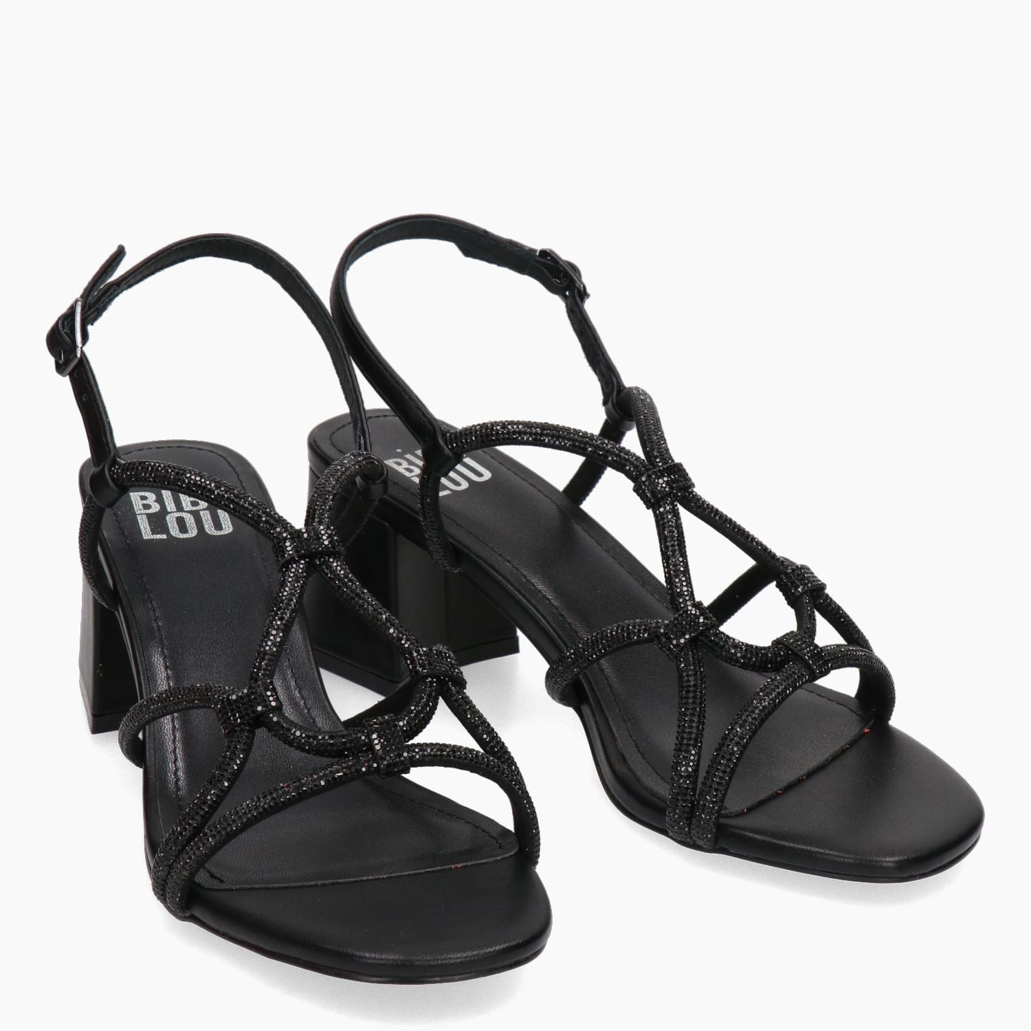 Sandalo Bibi Lou con cinturini di strass in colore nero e pelle nera. Chiusura con cinturino. Interno in pelle. Suola in gomma con tacco di 5,5 cm. Collezione Bibi Lou donna Primavera/Estate.