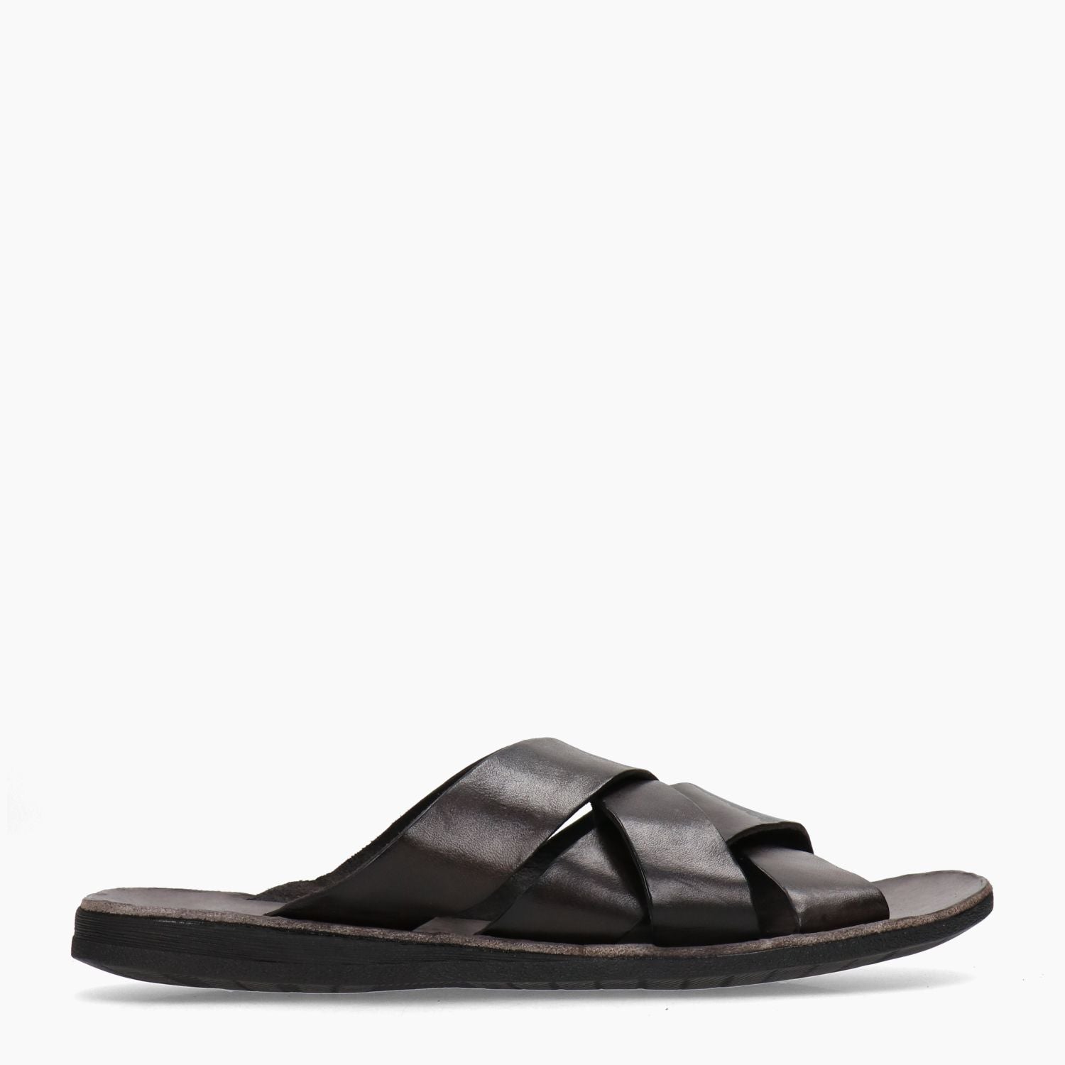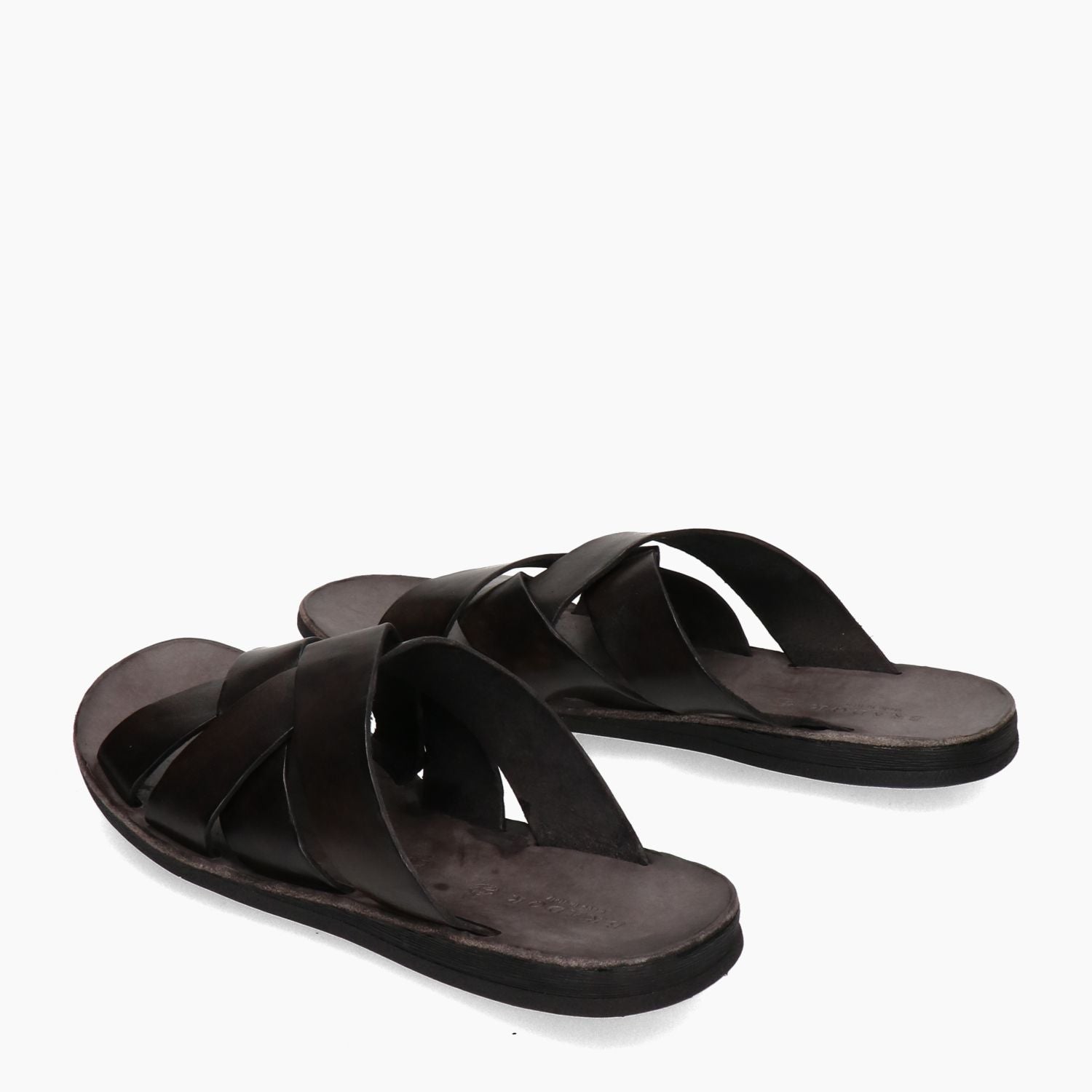 Ciabatta con incrocio. Tomaia in pelle in colore marrone e incrocio di bande in pelle. Punta aperta. Interno in pelle in colore marrone. Suola esterna in gomma in colore nero. Suola di 2 cm. Collezione Brador uomo Primavera/Estate.