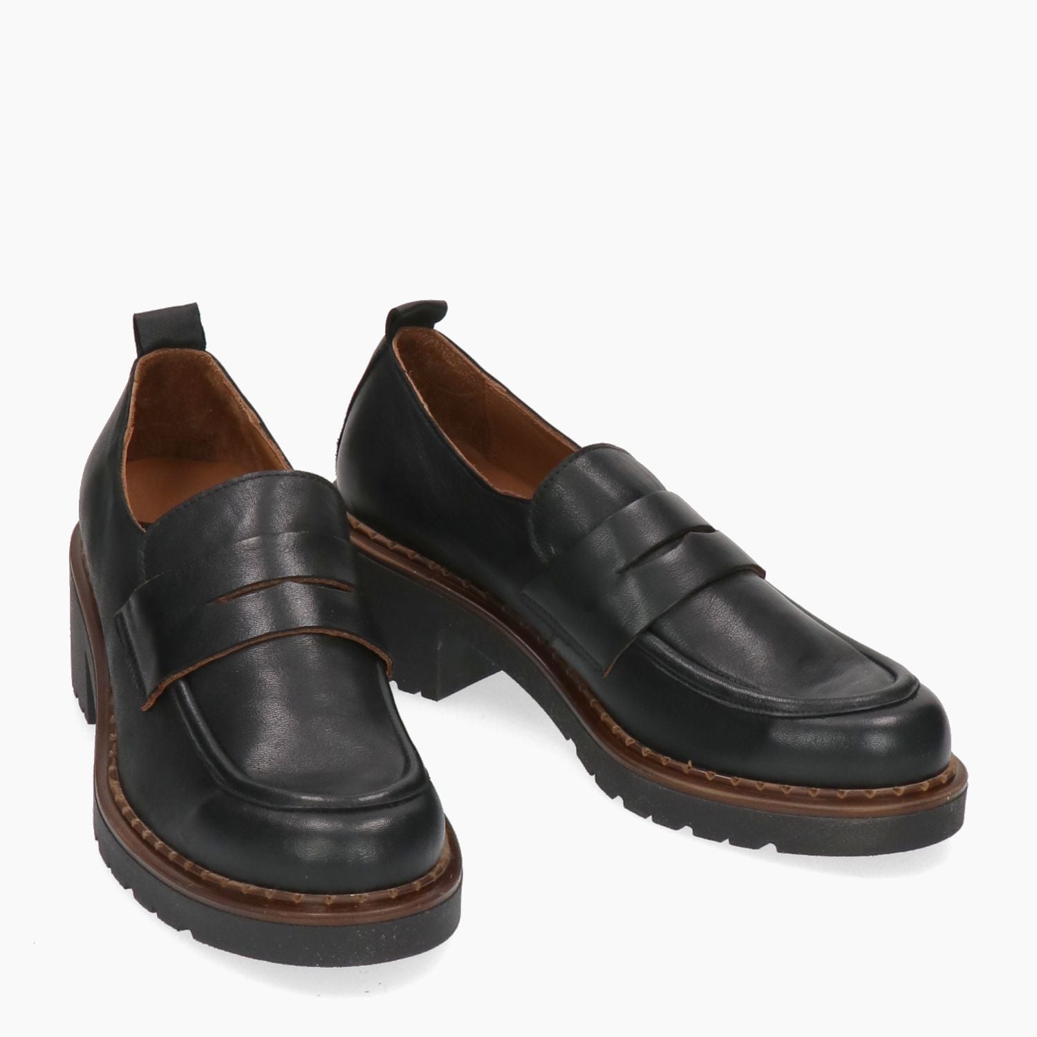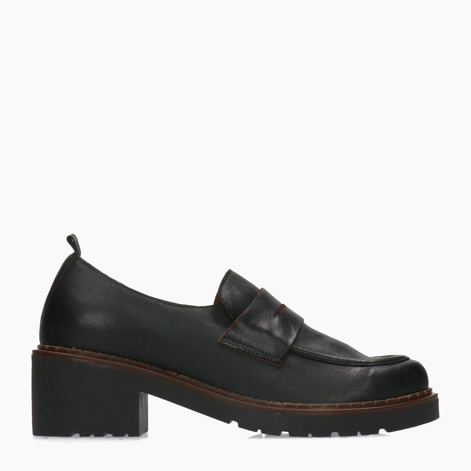 Mocassino in pelle nera. Interni in pelle con sottopiede estraibile. Suola in gomma con guardolo marrone. Tacco di 5 cm. Collezione Bueno donna Autunno/Inverno.