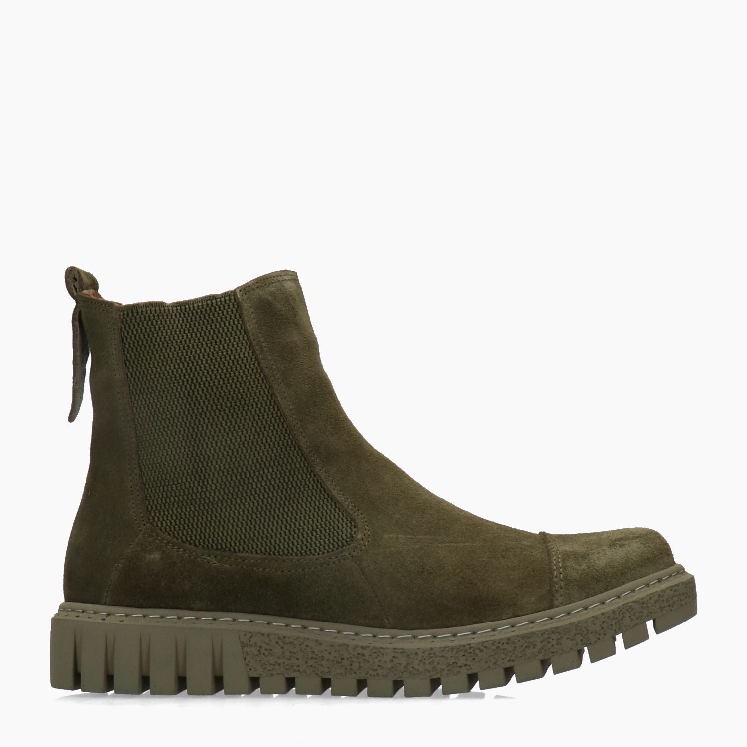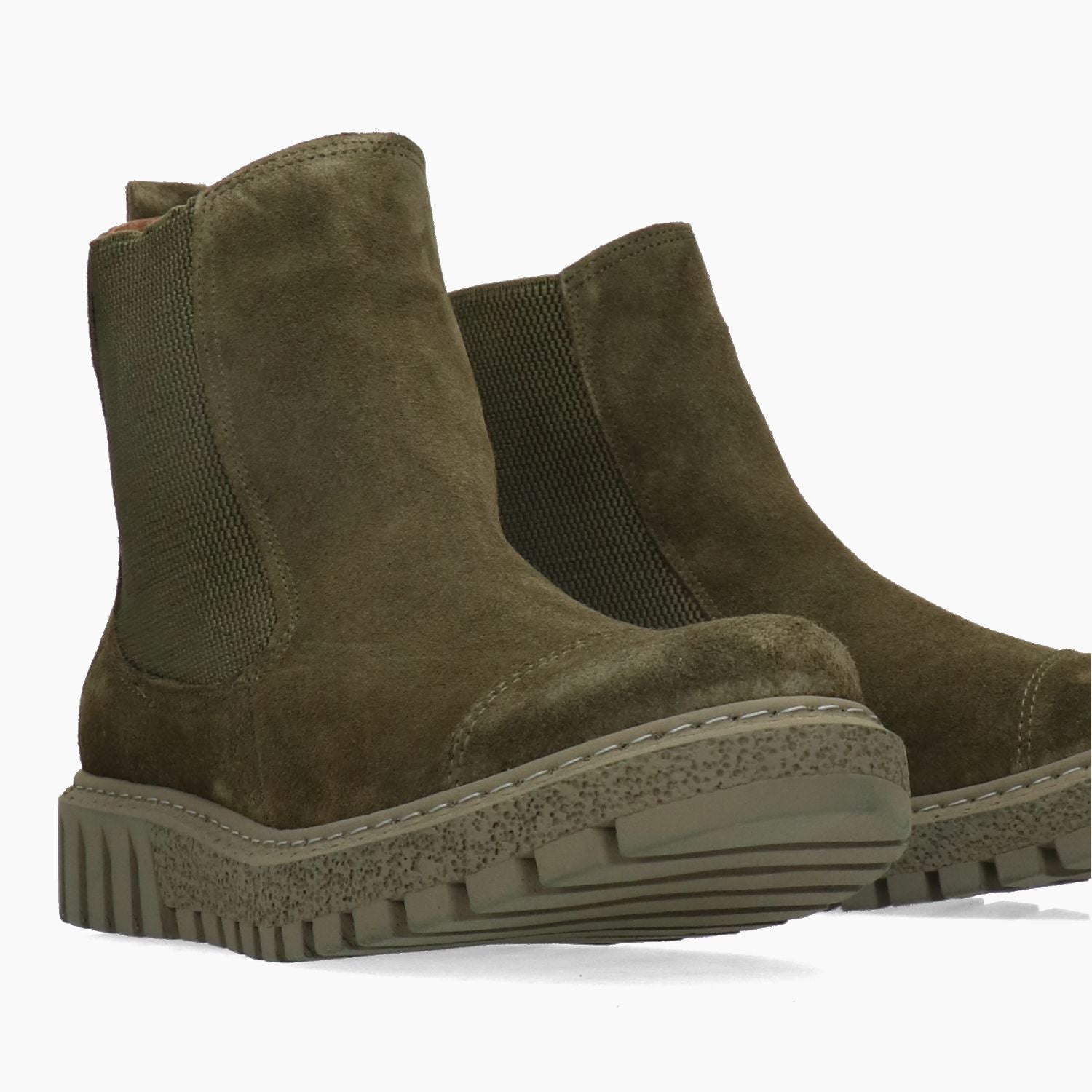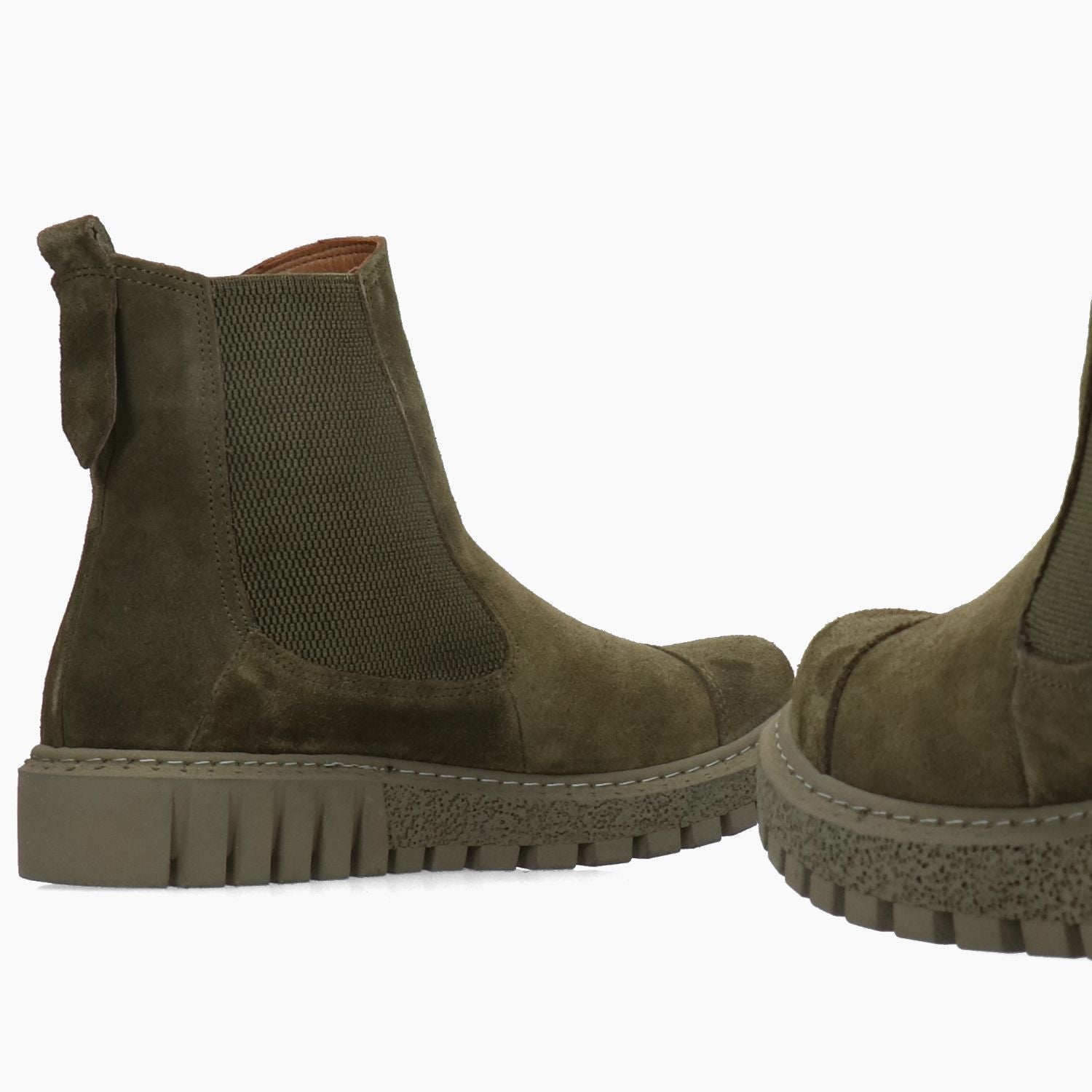 Beatles in camoscio verde miliatre con puntale. Elastici laterali in tinta effetto rete. Interni in tessuto con sottopiede estraibile. Suola in gomma con zeppa di 3 cm. Collezione Bueno donna Autunno/Inverno.