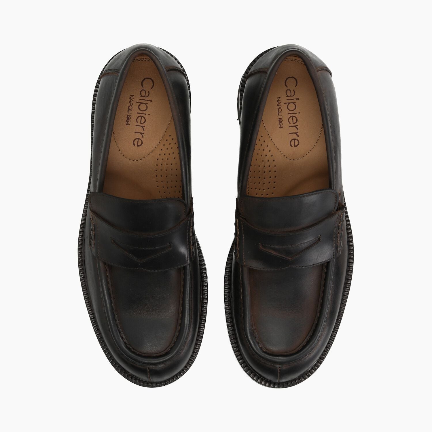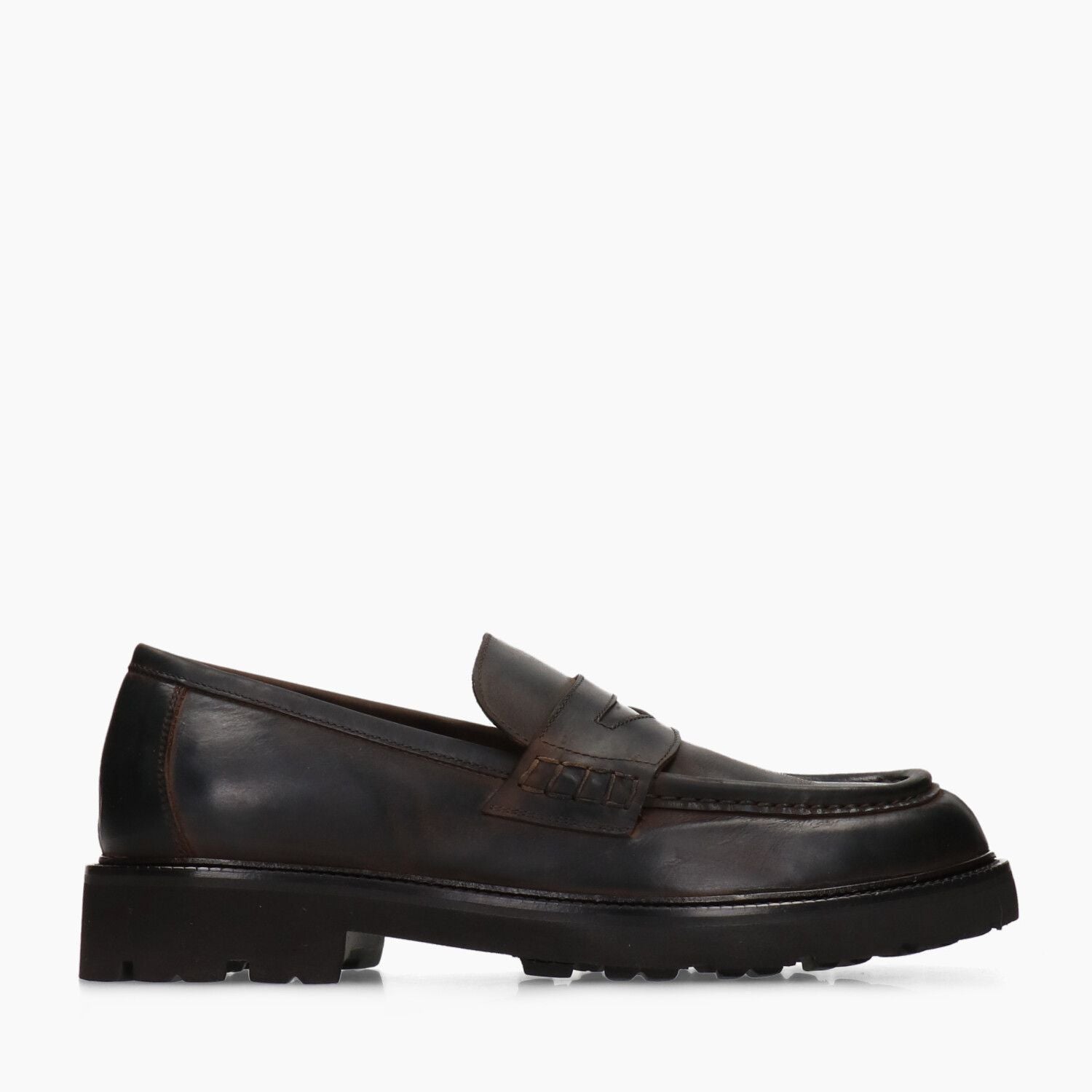Mocassiniin pelle testa di moro invecchiata, fondo gomma cucito.