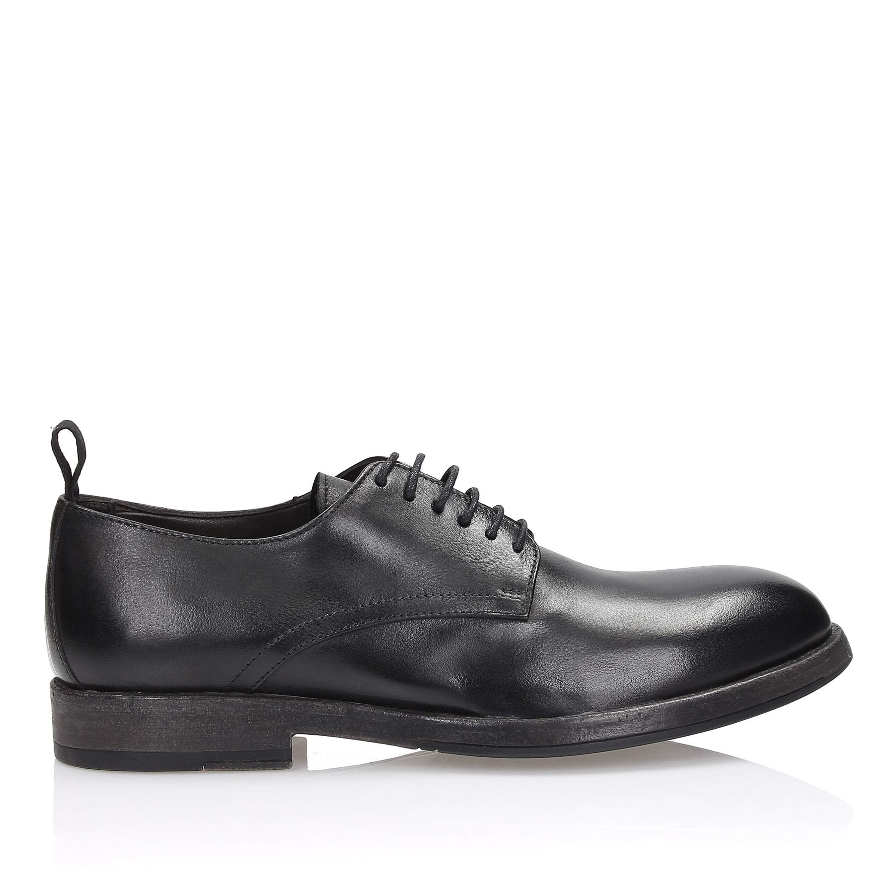 Derby in pelle nera con lavorazione a sacchetto per aumentare la comodità, tacco 20 fondo gomma cucito.