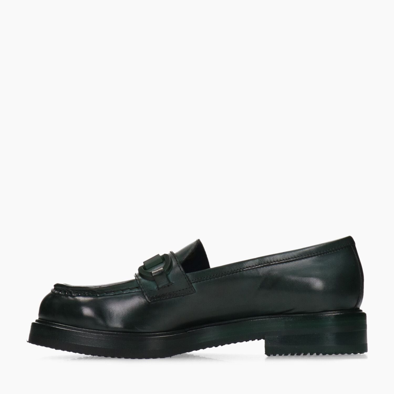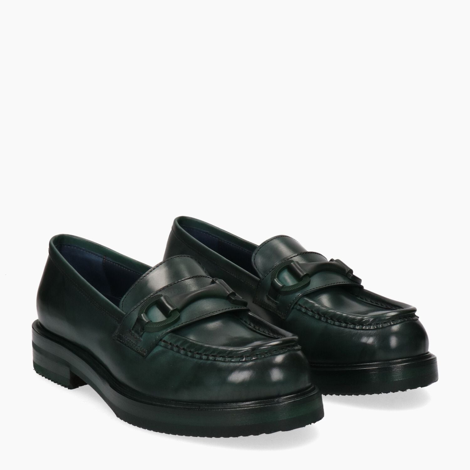 Mocassini in pelle verde bottiglia invecchiato con fascetta in gomma morbida, fondo gomma extralight.