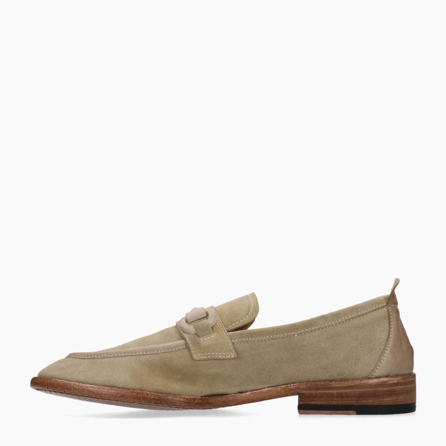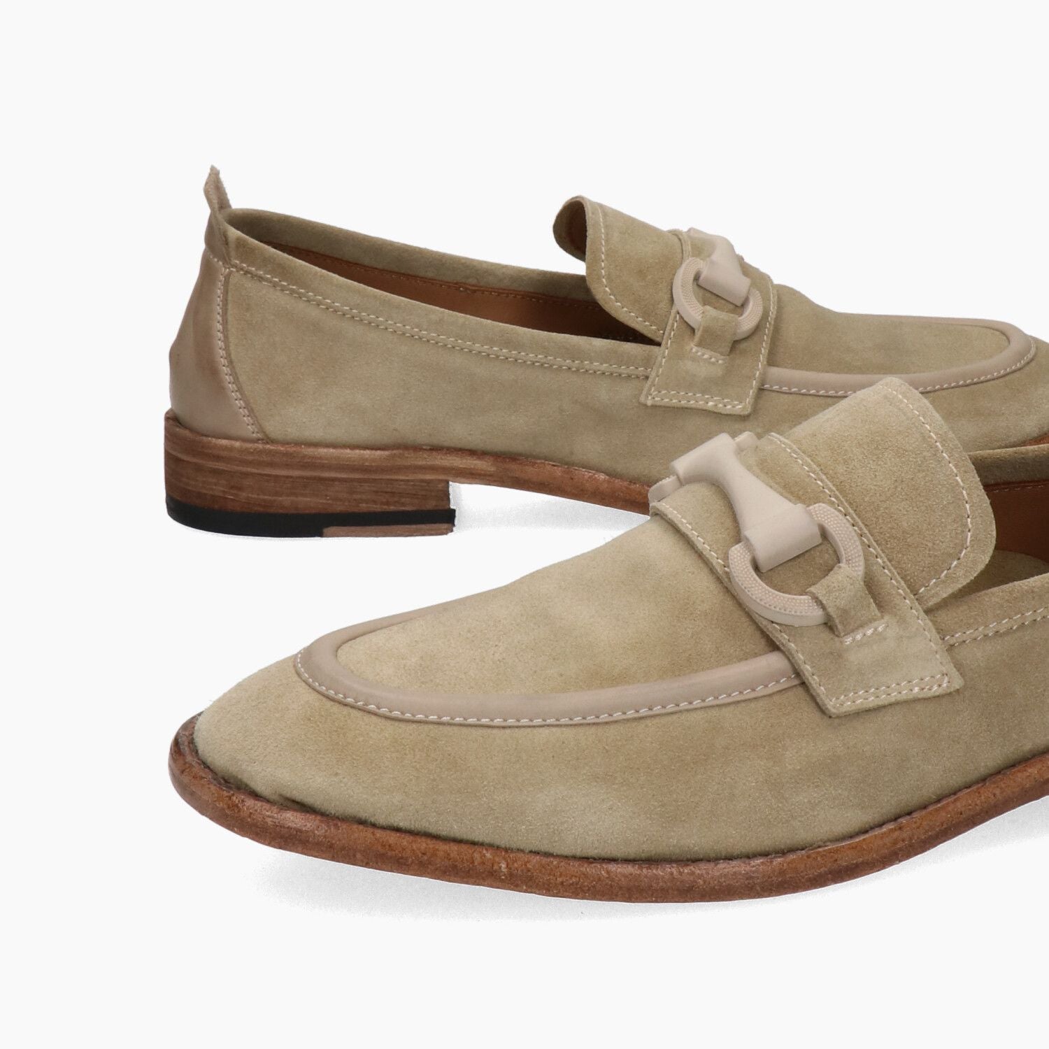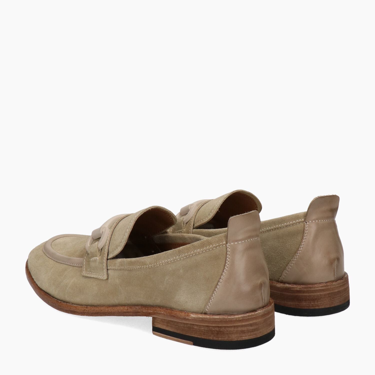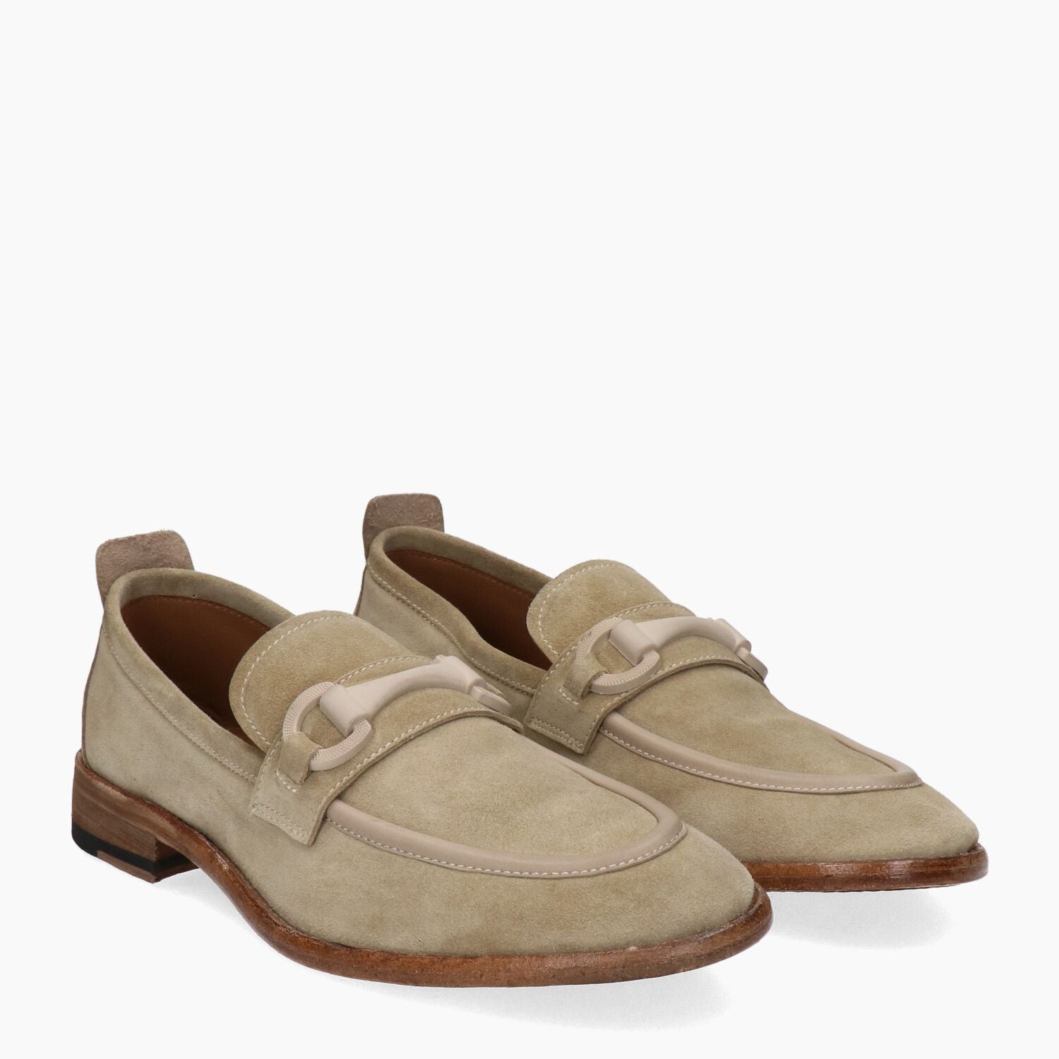 Mocassini in camoscio beige con morsetto in gomma, fondo cuoio e gomma cucito.