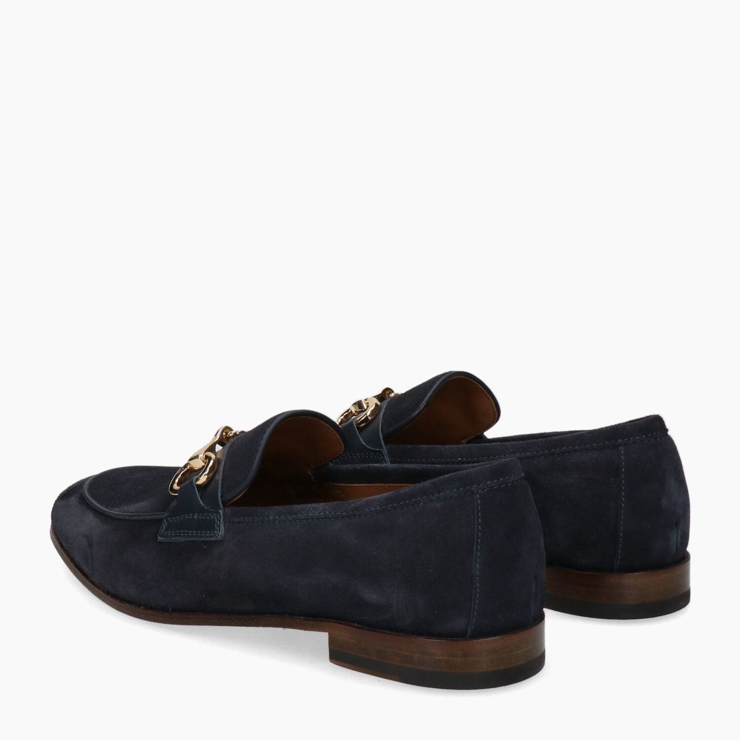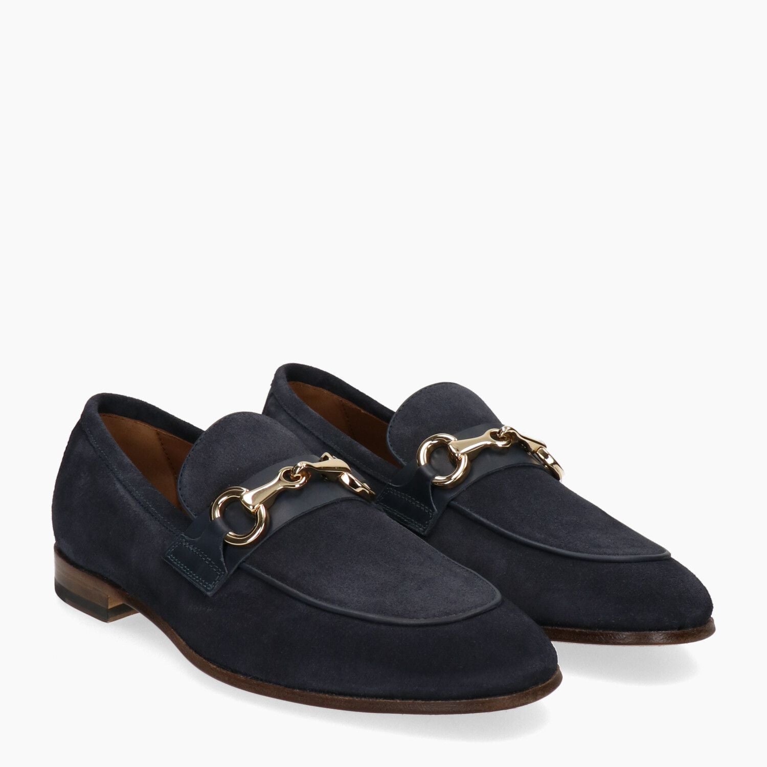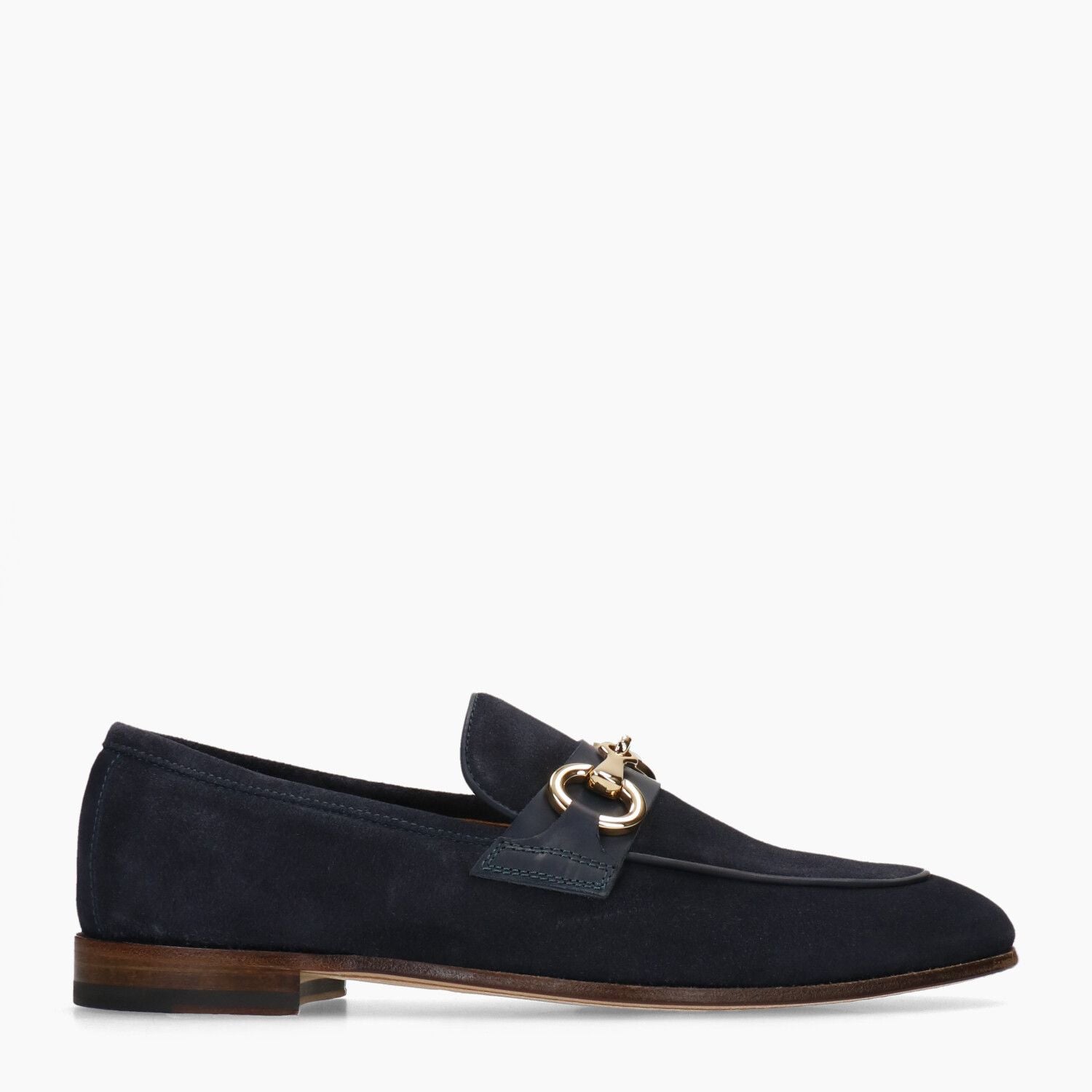 Mocassini in camoscio blu con morsetto dorato, fondo cuoio cucito.