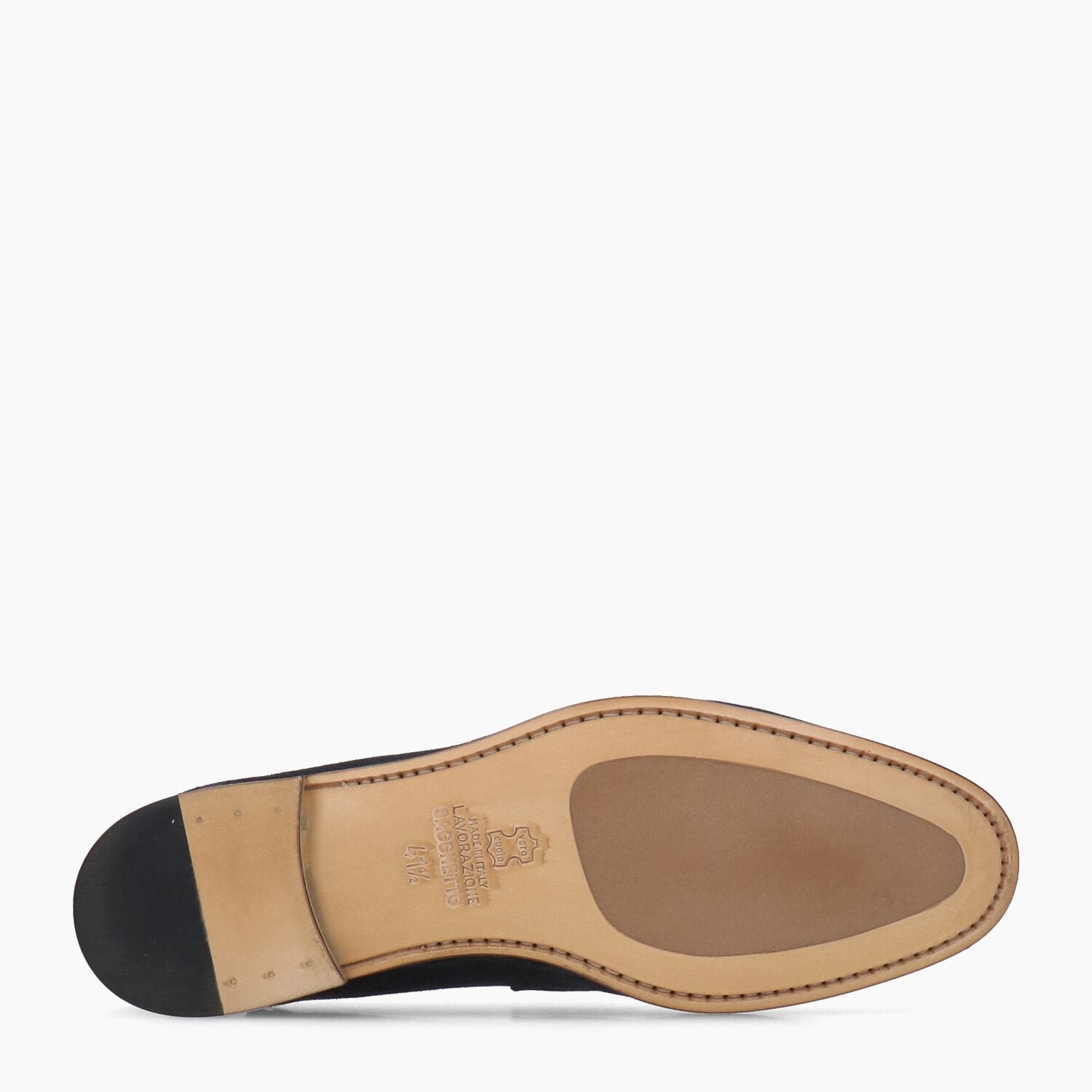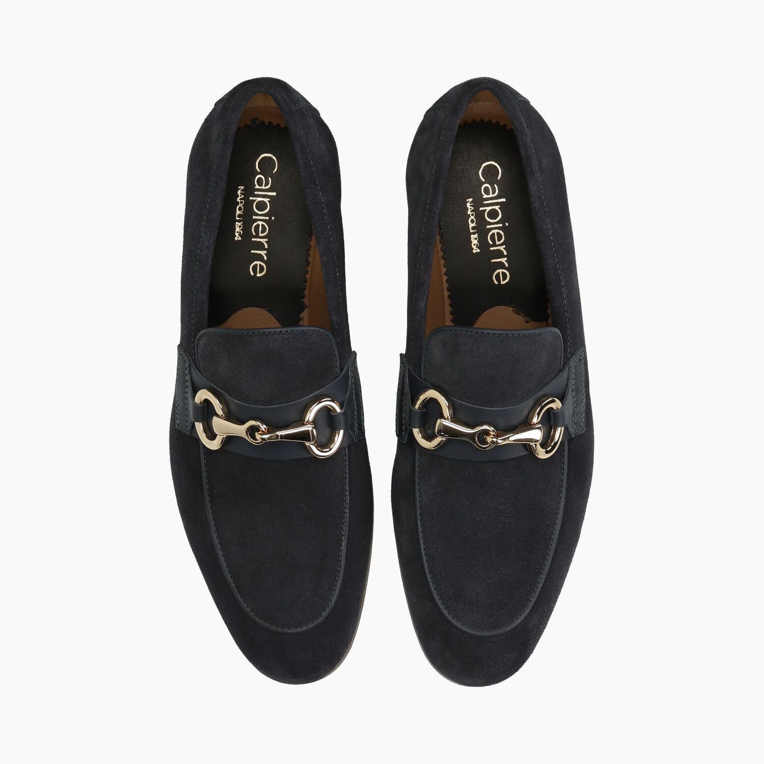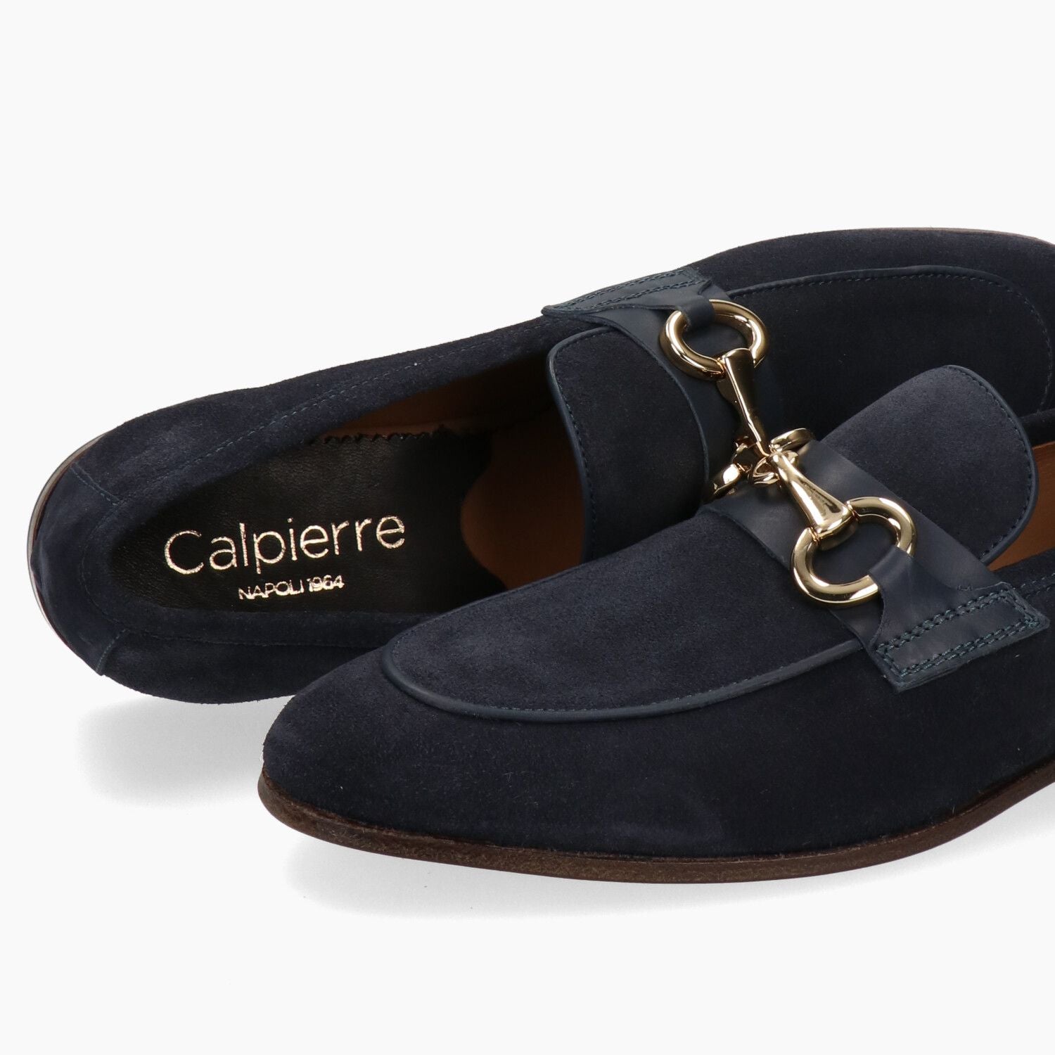 Mocassini in camoscio blu con morsetto dorato, fondo cuoio cucito.