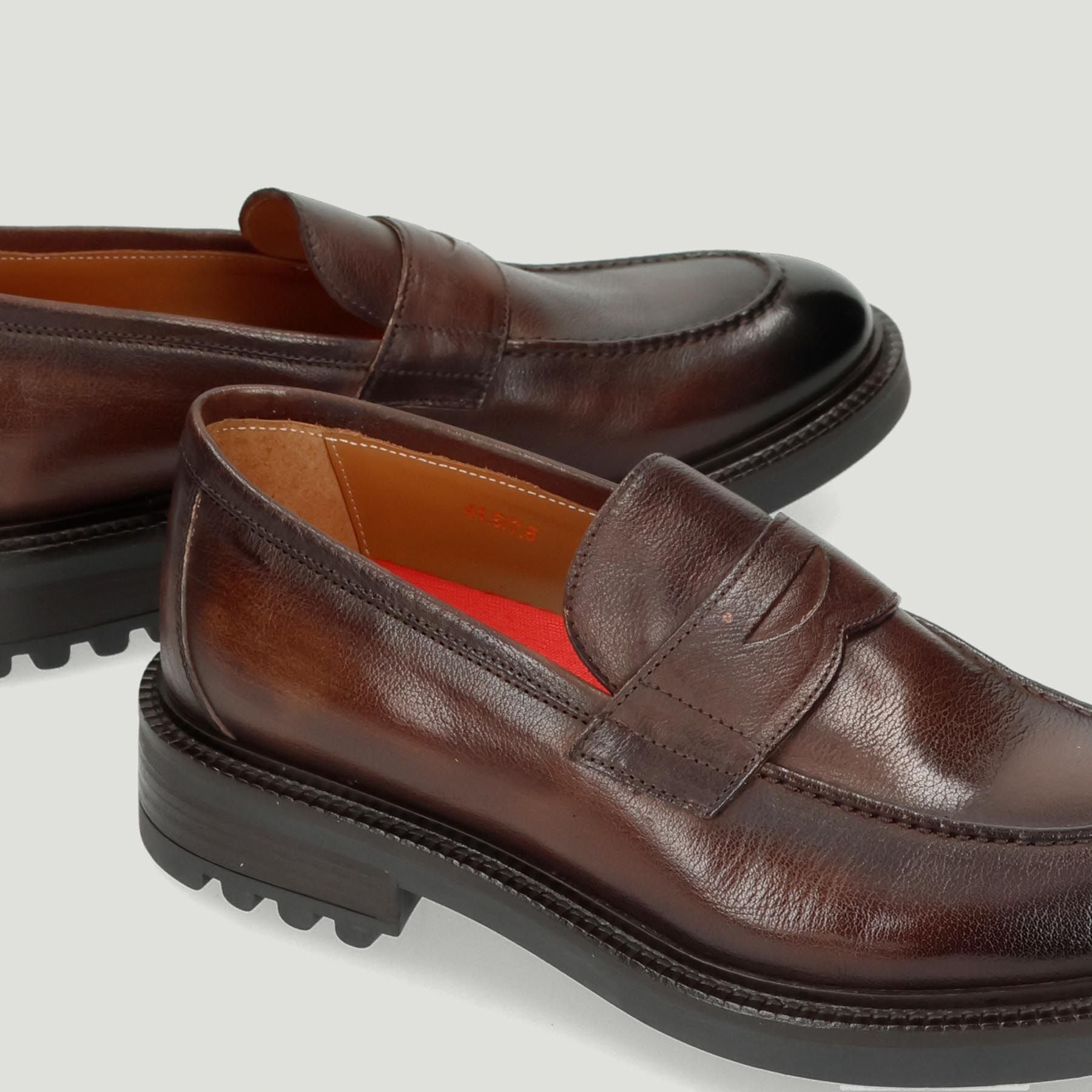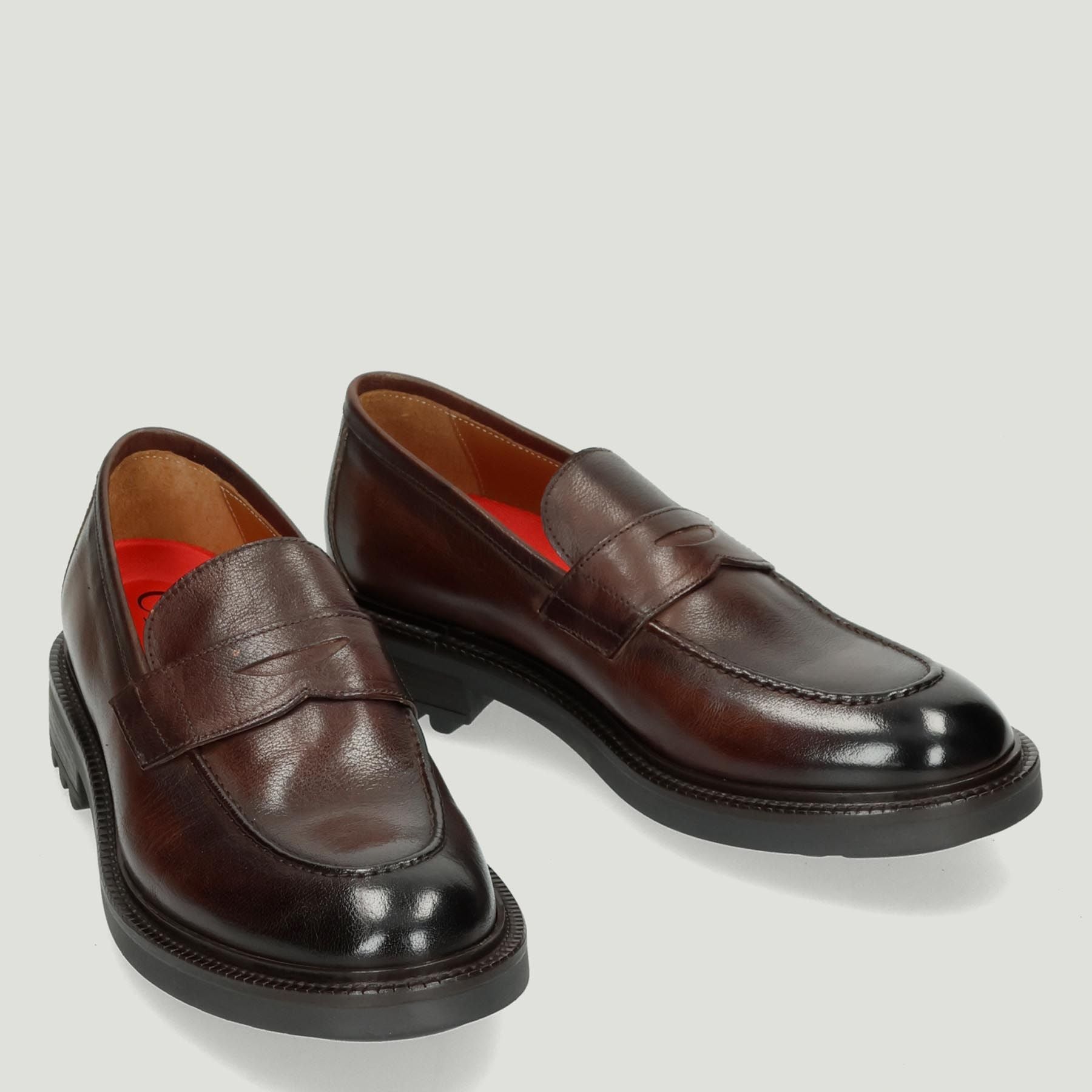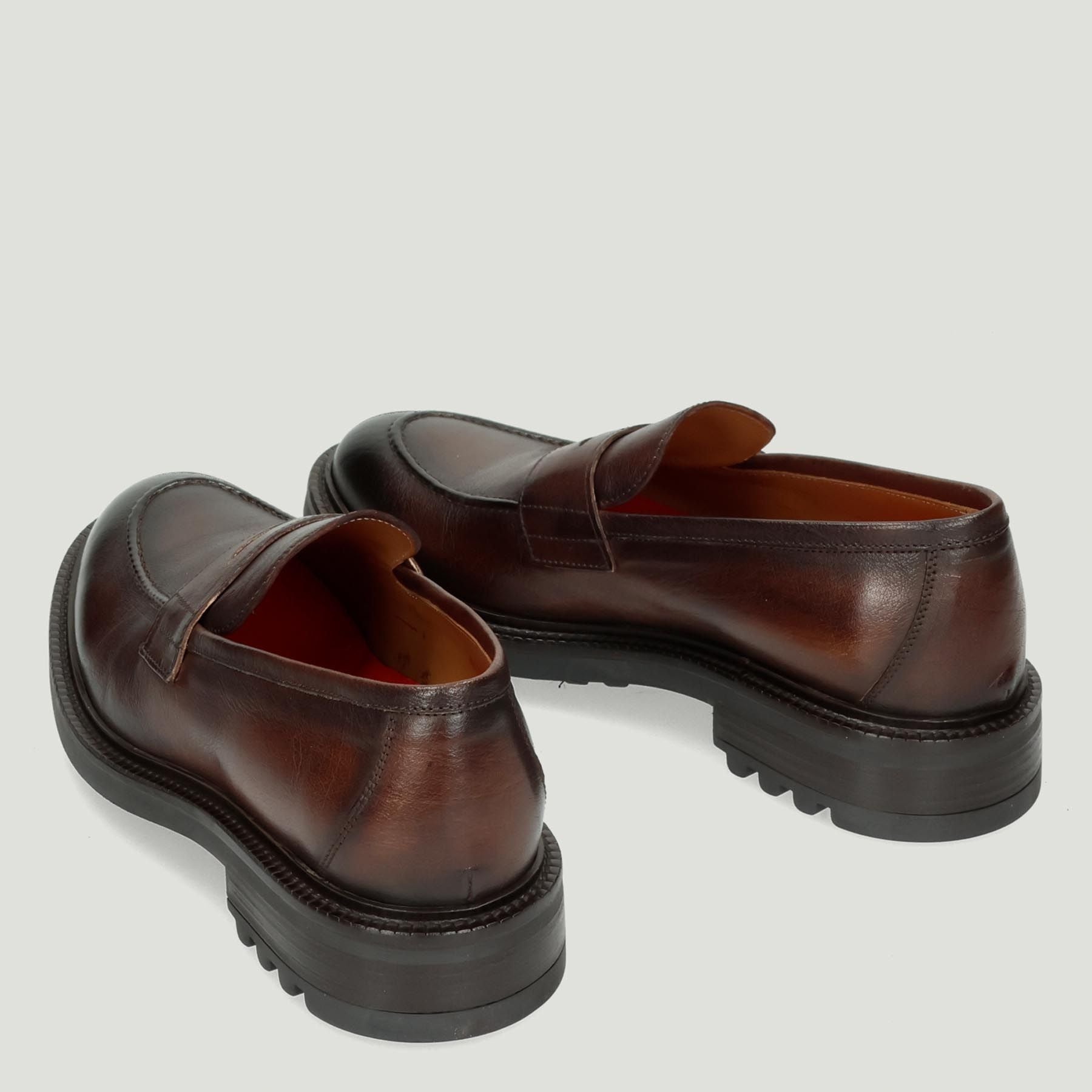 Mocassino con fascetta in pelle marrone. Interno in pelle. Soletta interna amovibile. Suola in gomma con tacco di 3 cm. Collezione Cerbero uomo Autunno/Inverno.
