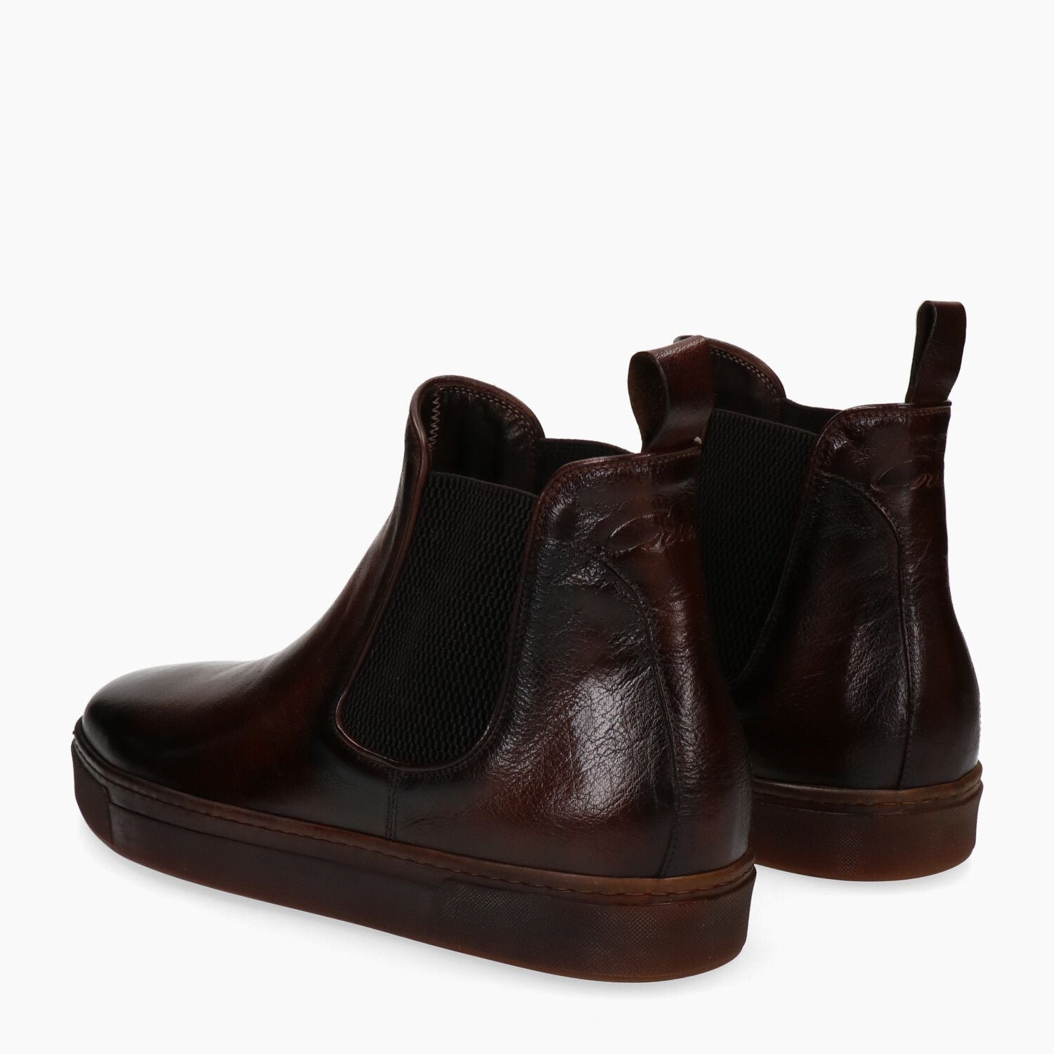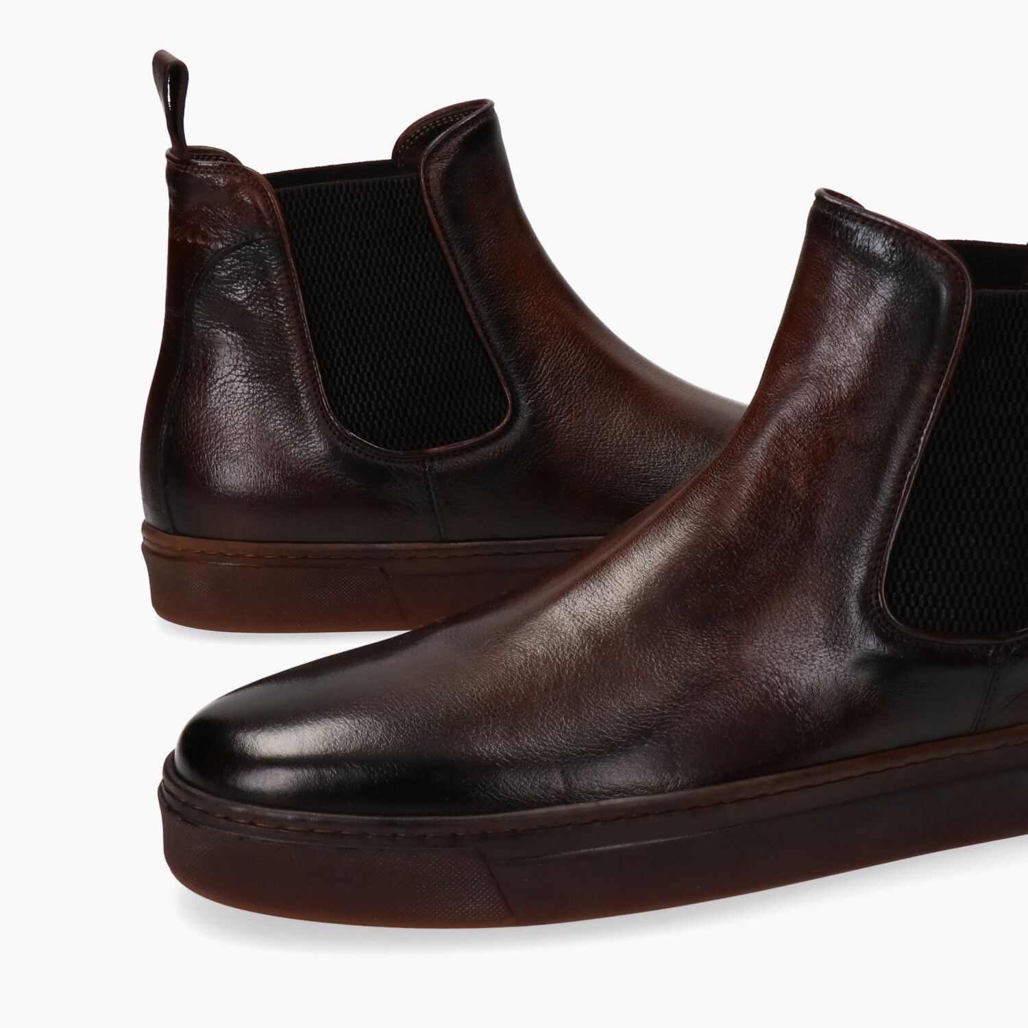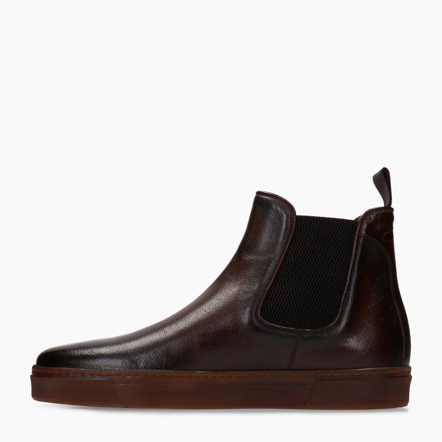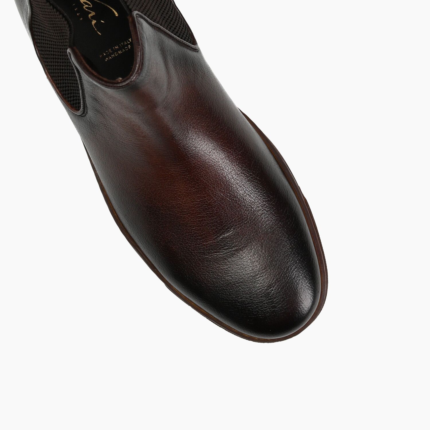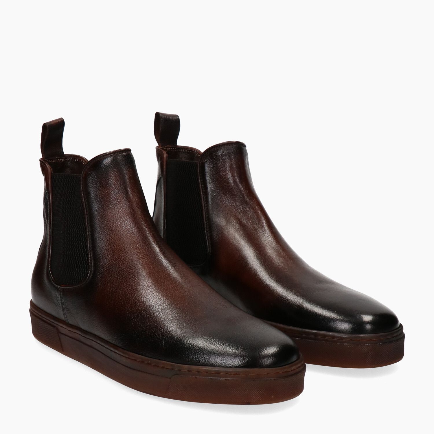 Stivaletti in pelle marrone invecchiata con elastici laterali, fondo in lattice naturale (Lactae Hevea).