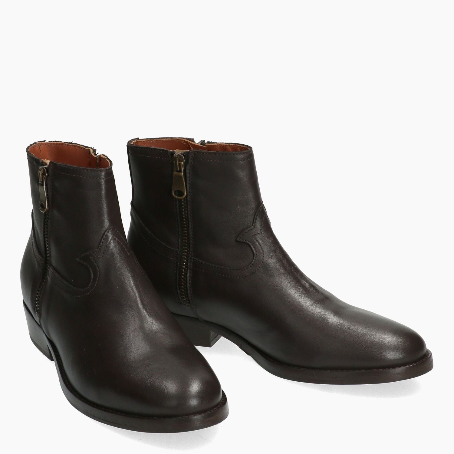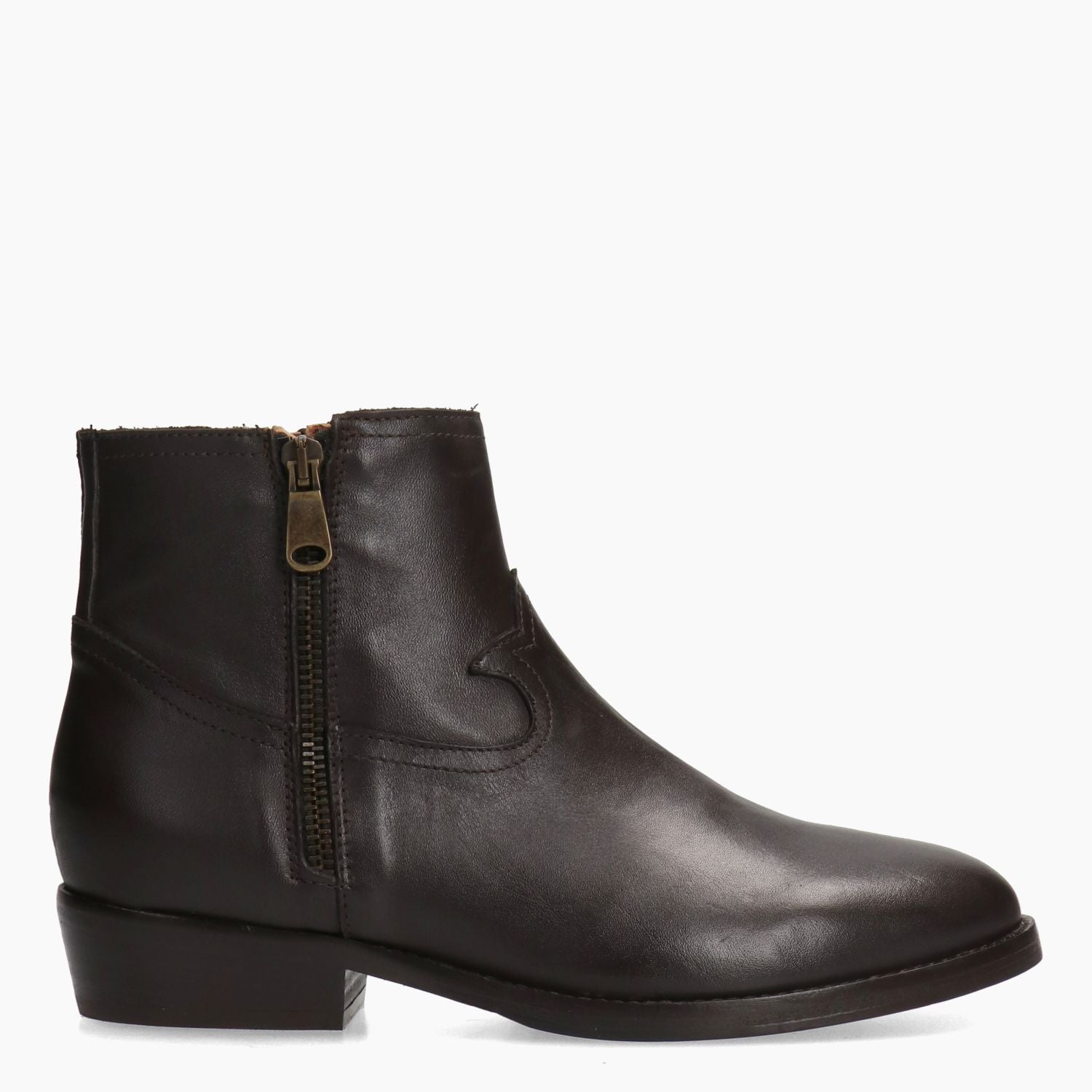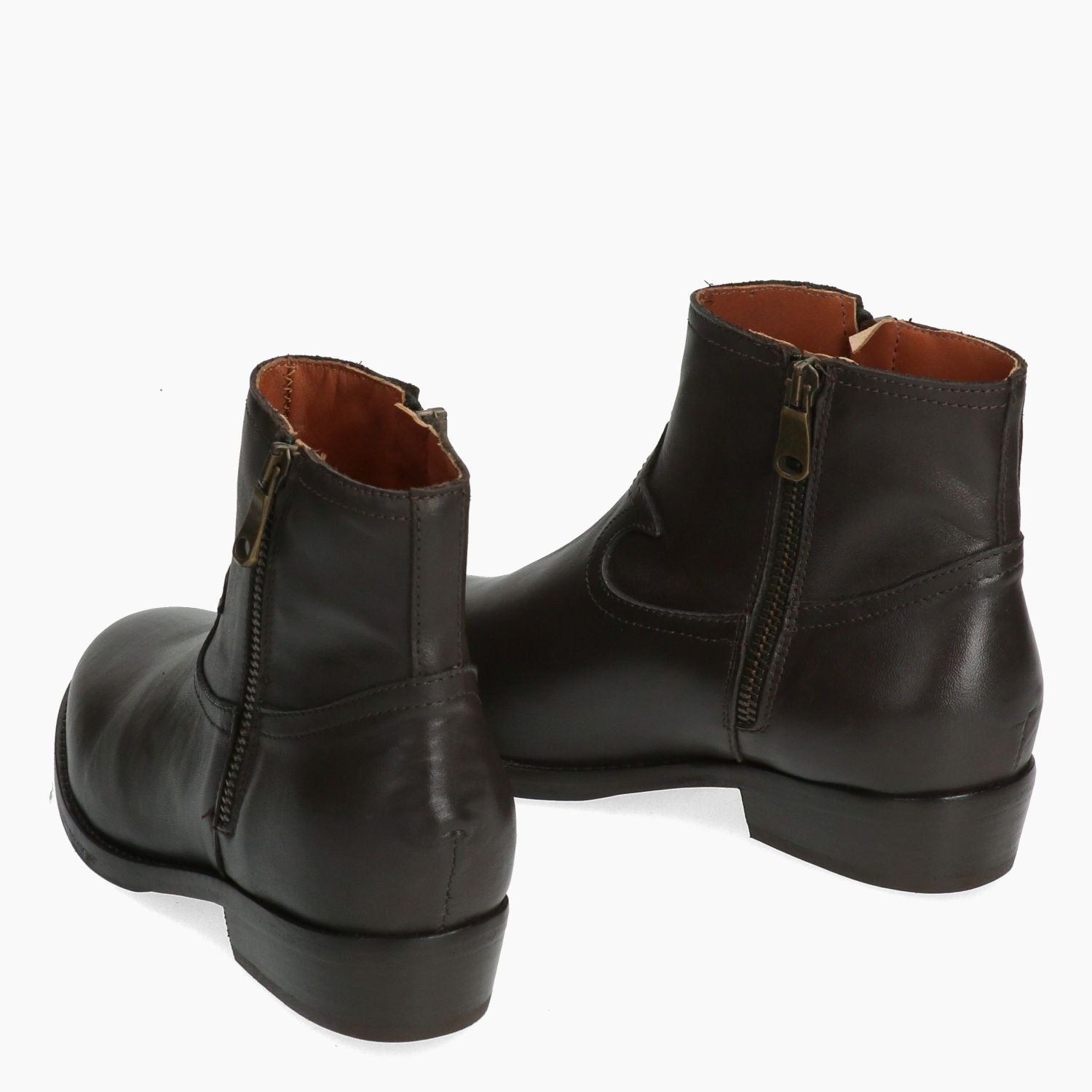 Stivaletto in pelle testa di moro con doppie zip laterali. Interno in pelle. Soletta interna non rimovibile. Suola in cuoio e gomma con tacco di 3 cm. Collezione Curiosite' donna.