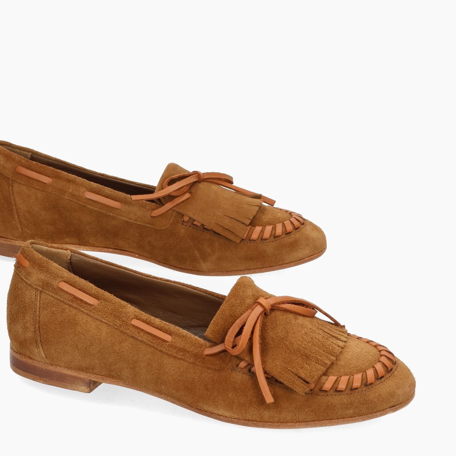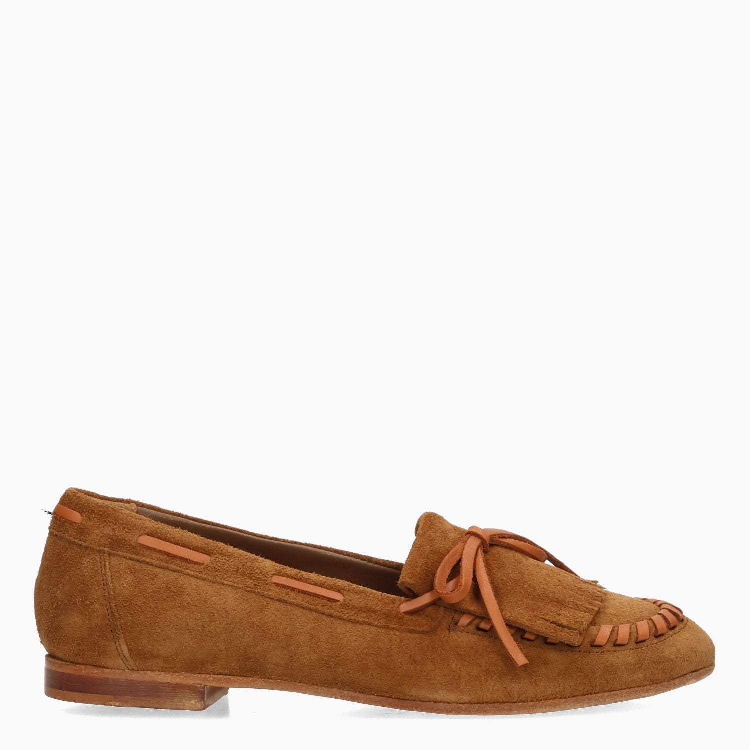Mocassino in pelle scamosciata cuoio con infilature in pelle cuoio e frangia. Interno in pelle. Soletta interna non rimovibile. Suola in cuoio con isola in gomma e tacco di 1 cm. Collezione Curiosite' donna.