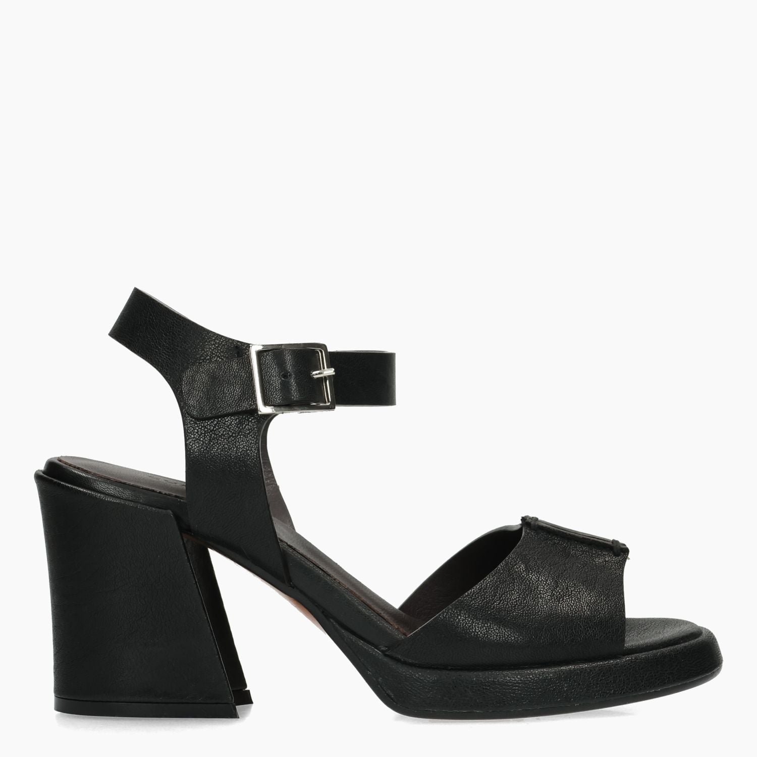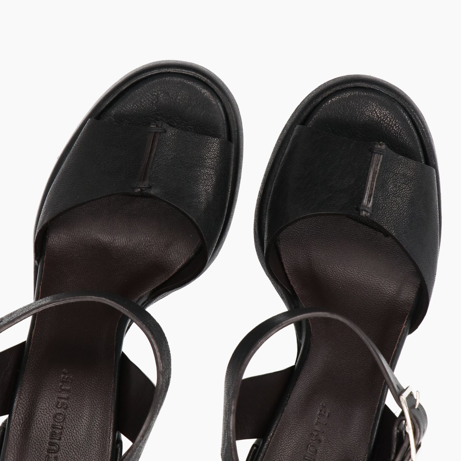 Sandalo in pelle in colore nero. Chiusura con cinturino regolabile e fibbia argento. Interno in pelle. Suola in cuoio con isola antiscivolo in gomma. Plateau di 2 cm. Tacco di 7,5 cm. Collezione Curiosite' donna Primavera/Estate.