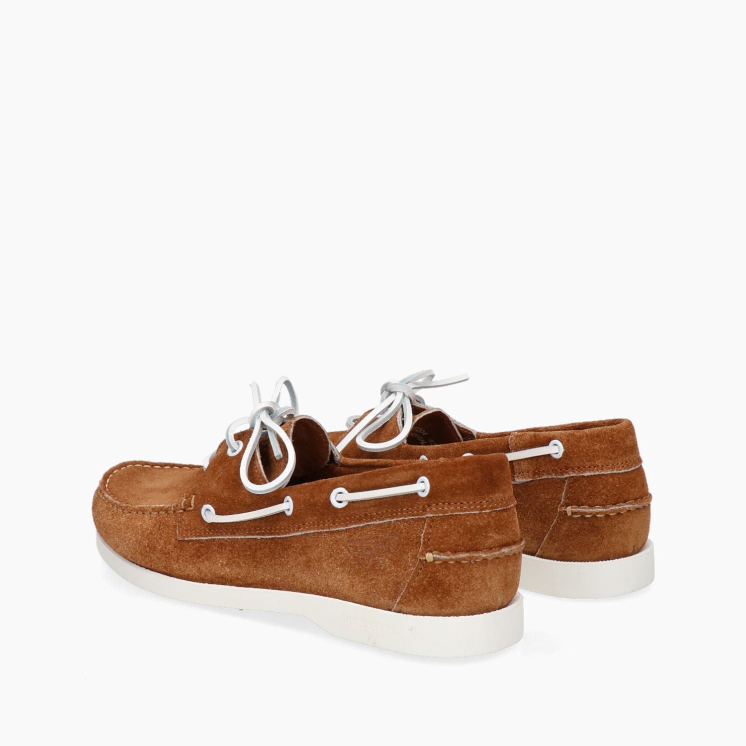 Mocassini in camoscio cuoio con lacci in pelle bianca, fondo in gomma bianco.