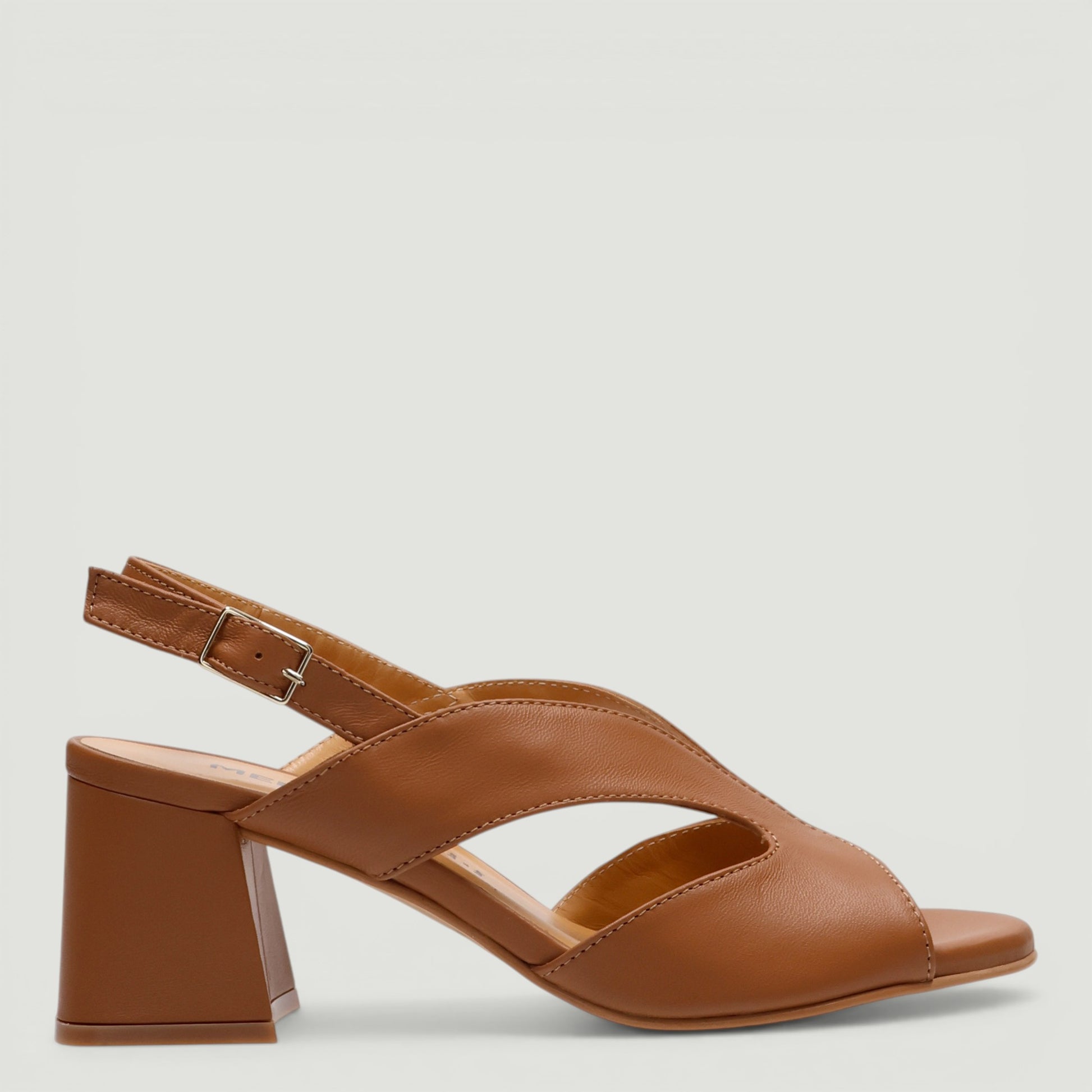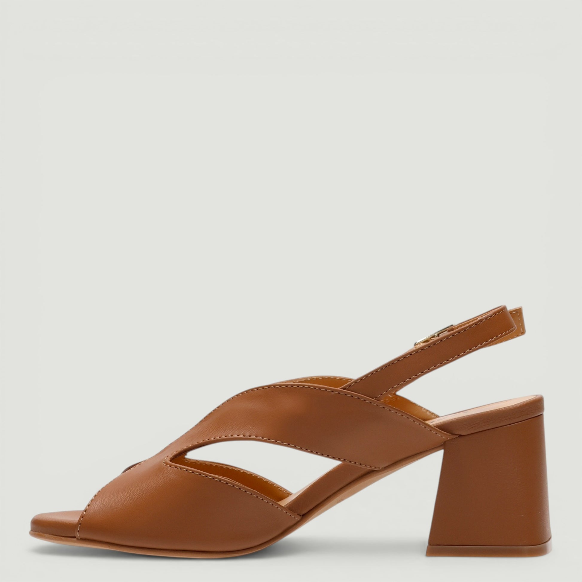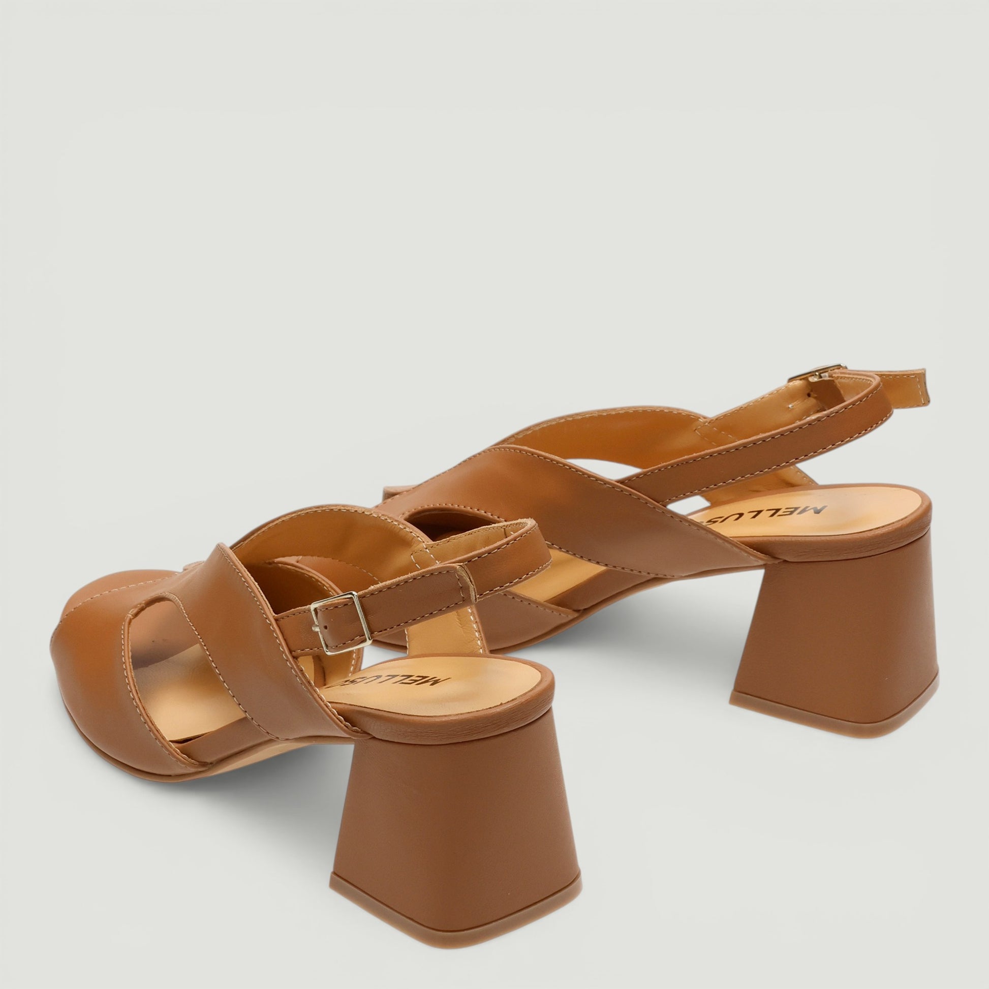 Sandalo Melluso con tomaia in pelle cuoio. Chiusura con cinturino regolabile. Interno in pelle. Suola in gomma con tacco di 6 cm. Collezione Melluso donna Primavera/Estate.