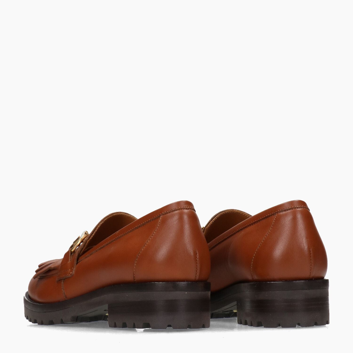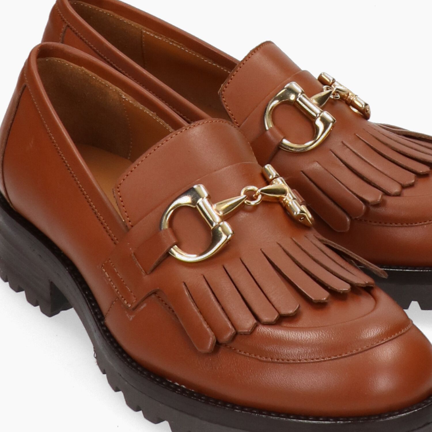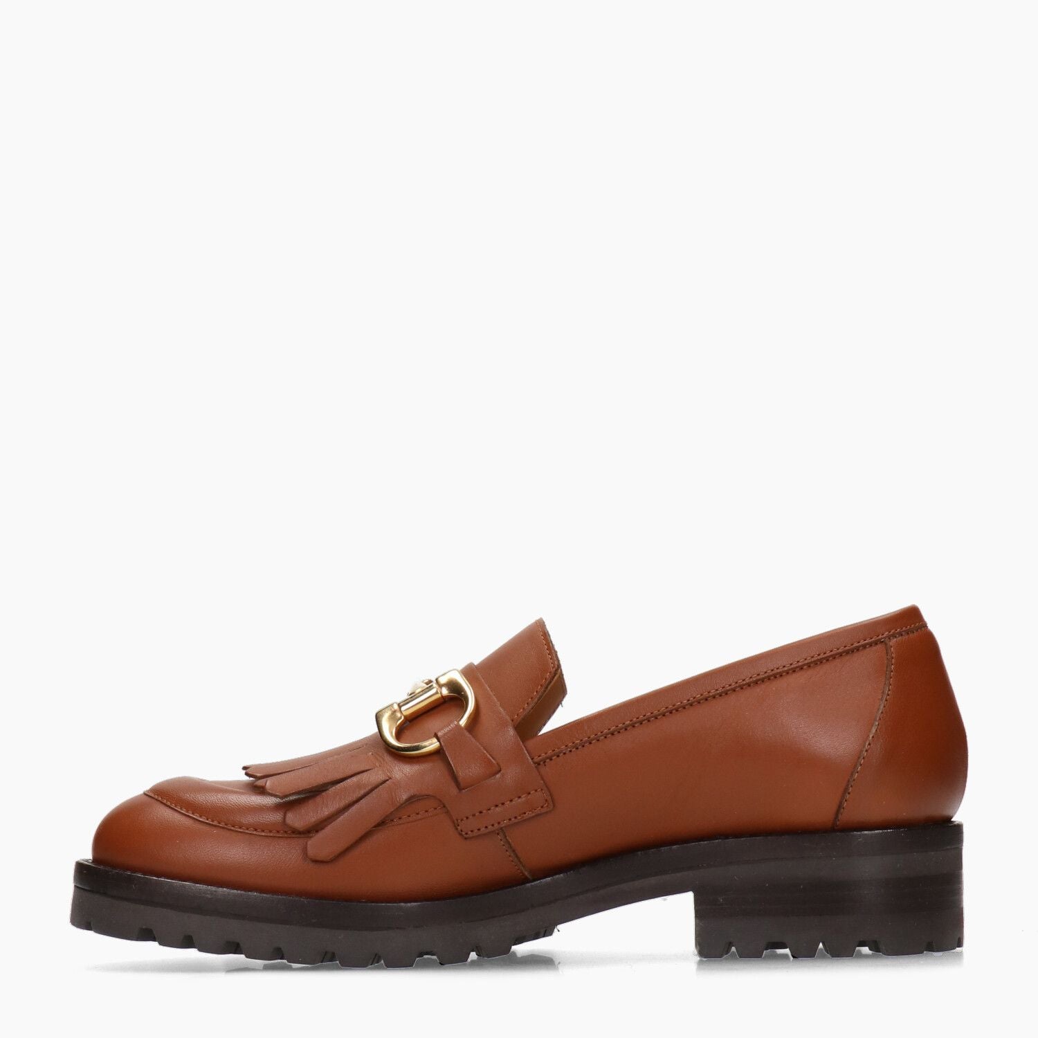Mocassini Duccio Del Duca con tomaia in pelle in colore cuoio e frange con morsetto dorato. Punta tonda. Suola in gomma dentata. Suola di 3,5 cm. Collezione Duccio Del Duca donna Autunno/Inverno.