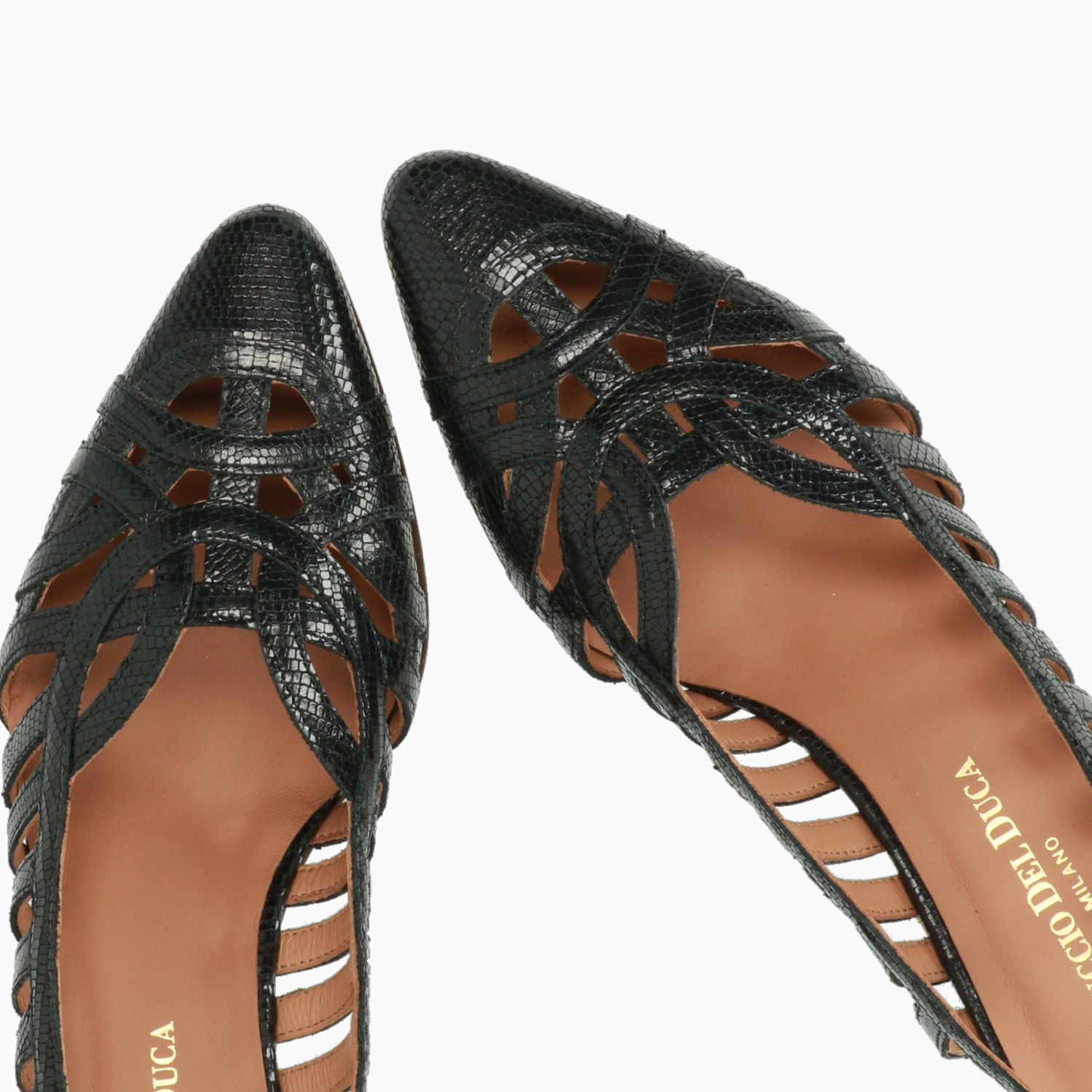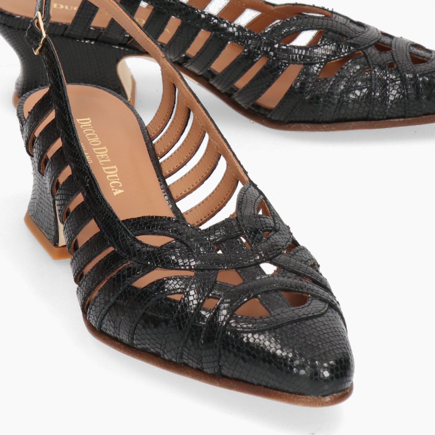 Chanel in pelle stampata rettile nera con cinturino regolabile alla caviglia. Interno in pelle. Suola in cuoio con tacco di 4 cm. Collezione Duccio Del Duca Primavera/Estate.