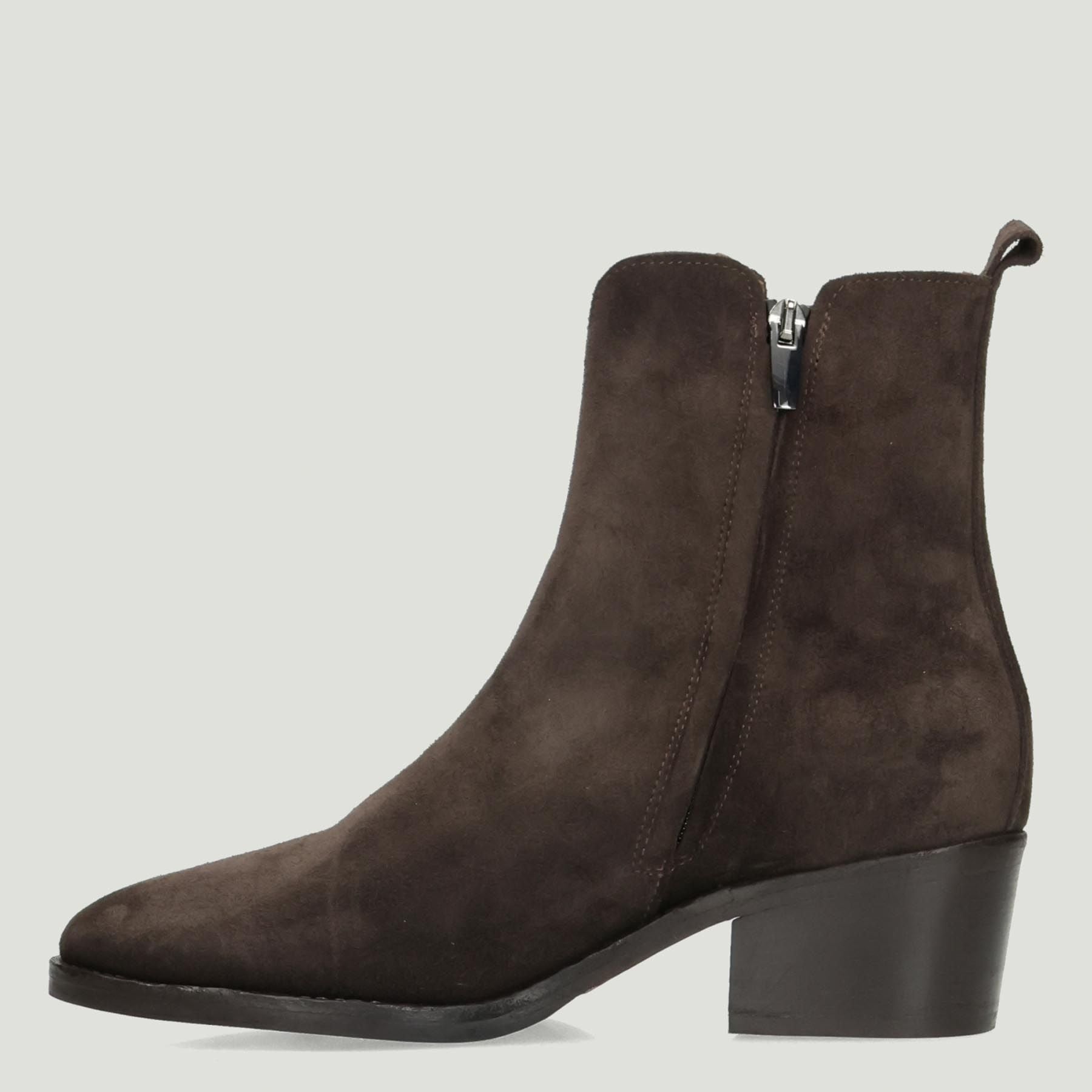 Stivaletti con tomaia in pelle scamosciata testa di moro. Piccola bugia laterale con elastico in tinta. Interno in pelle. Suola in cuoio e gomma con tacco di 5 cm. Collezione Duccio Del Duca donna Autunno/Inverno.