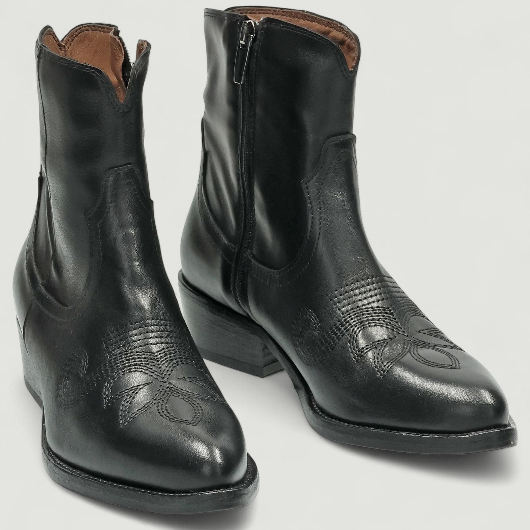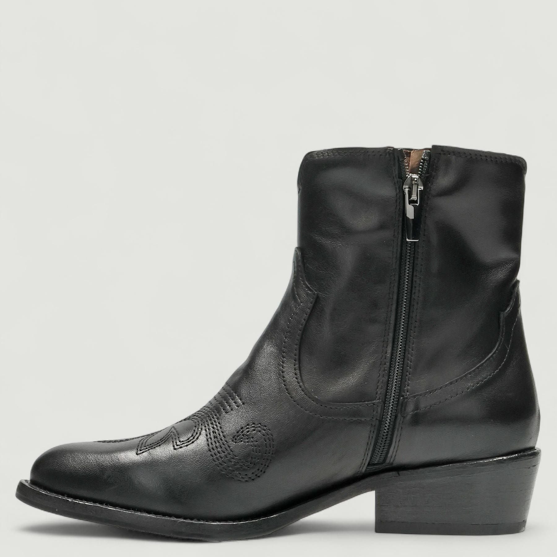 Stivaletto texano in pelle nera. Ricami in tinta sulla tomaia. Chiusura con zip laterale. Interno in pelle. Suola in cuoio e gomma con tacco di 3 cm. Collezione Duccio Del Duca donna Autunno/Inverno.