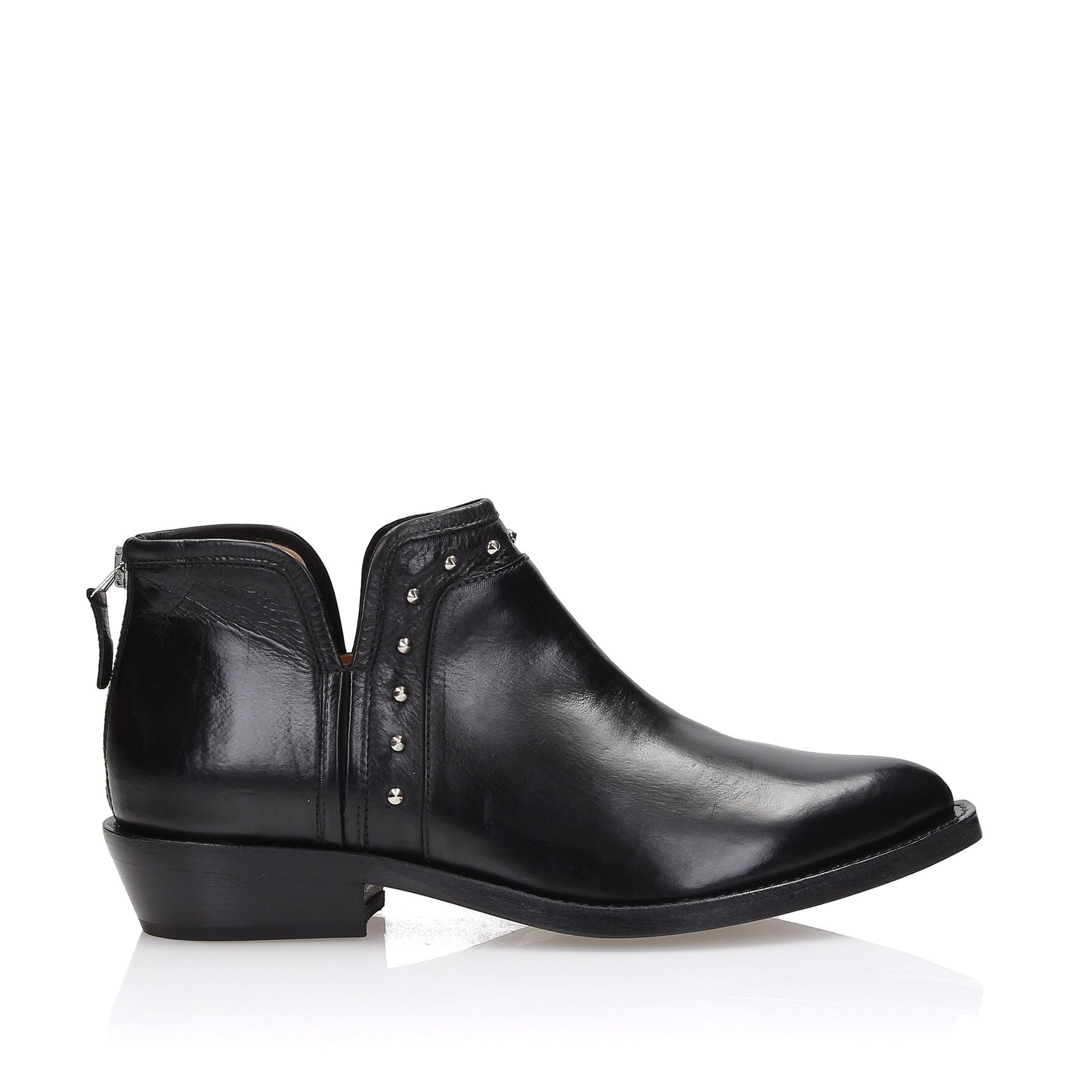 Stivaletto texano. Realizzato in pelle nera con profilo di borchiette argento. Chiusura con zip posteriore. Interno in pelle colore beige. Suola in cuoio. Tacco di 3,5 cm. Collezione Duccio Del Duca donna.