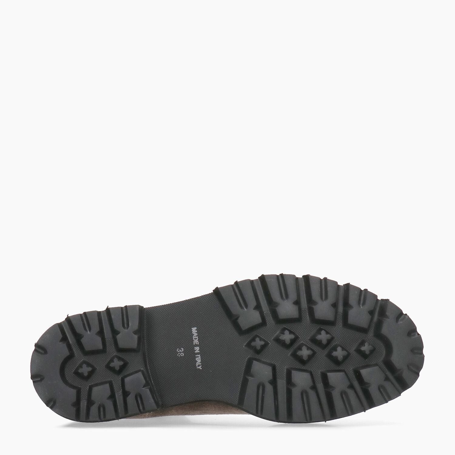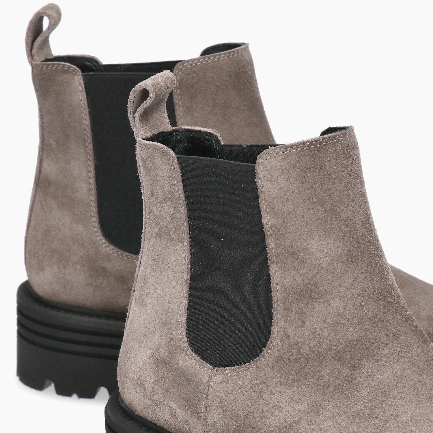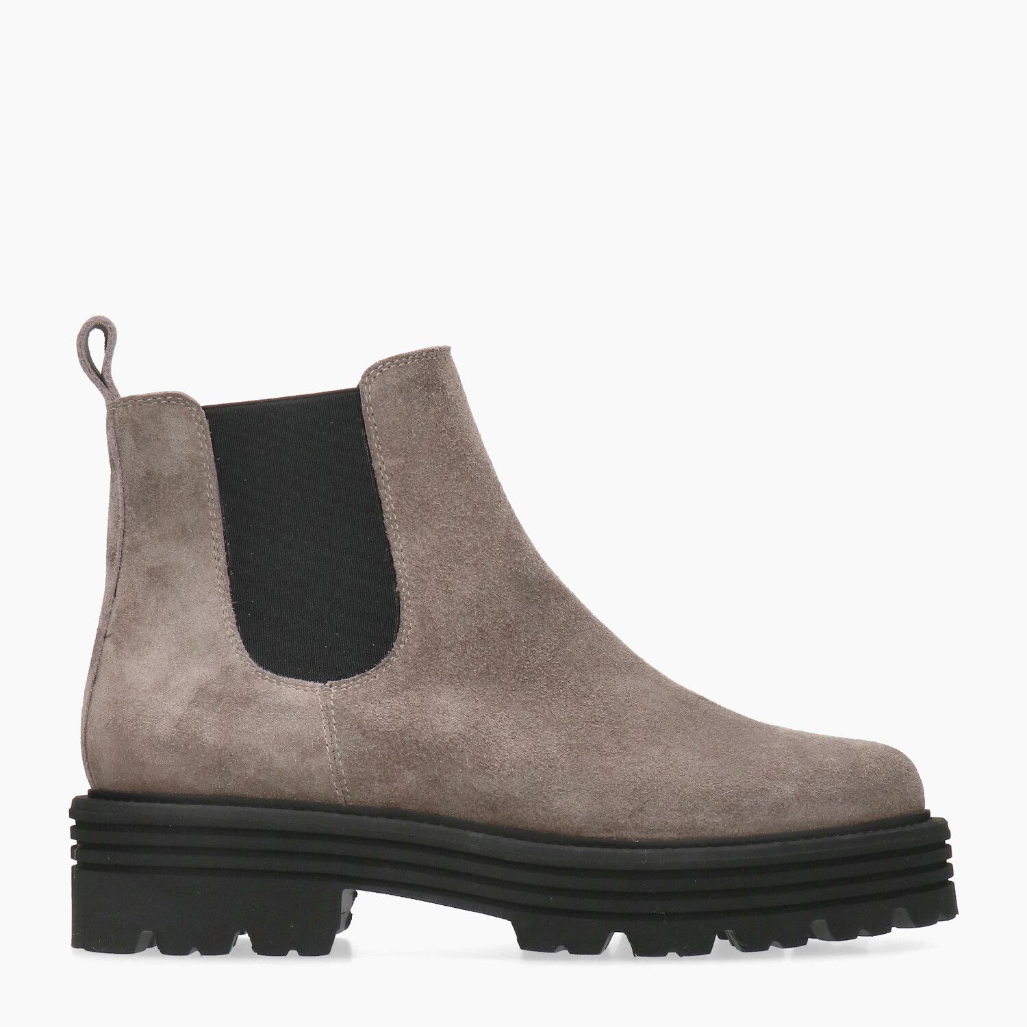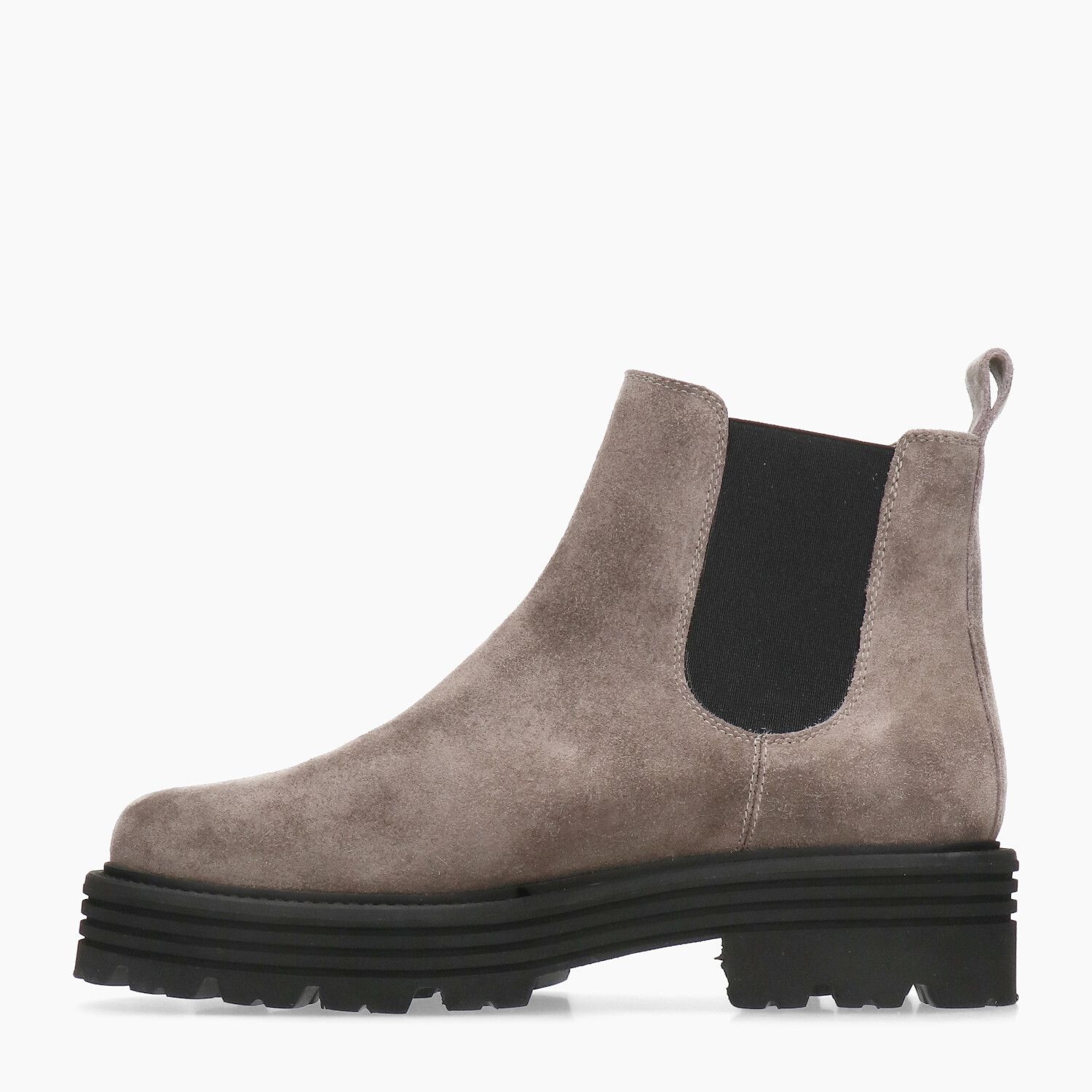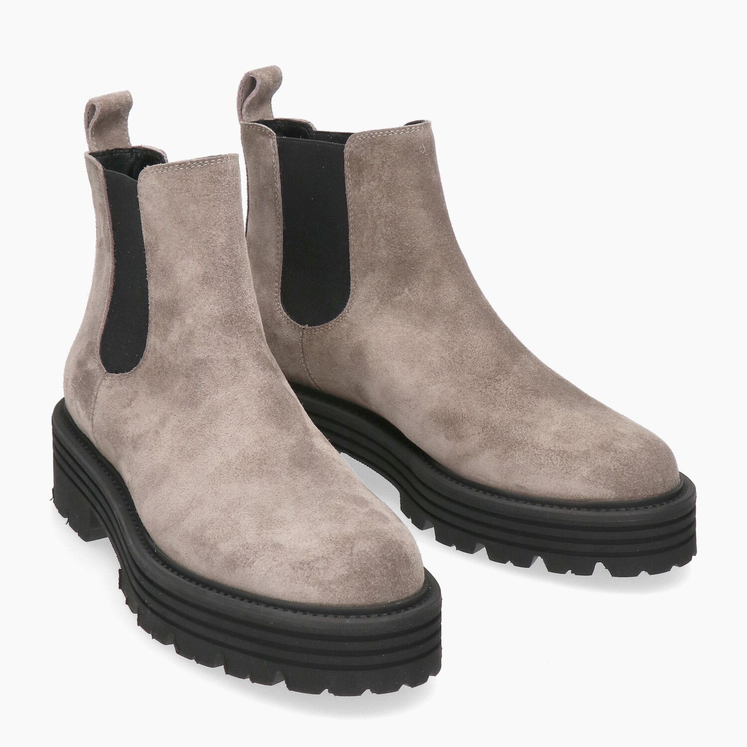 Stivaletto in stile chelsea Evaluna con tomaia in pelle scamosciata in colore tortora. Punta tonda. Inserti elastici laterali. Suola in gomma. Suola di 4,5 cm. Suola in gomma dentata. Collezione Evaluna donna Autunno/Inverno.