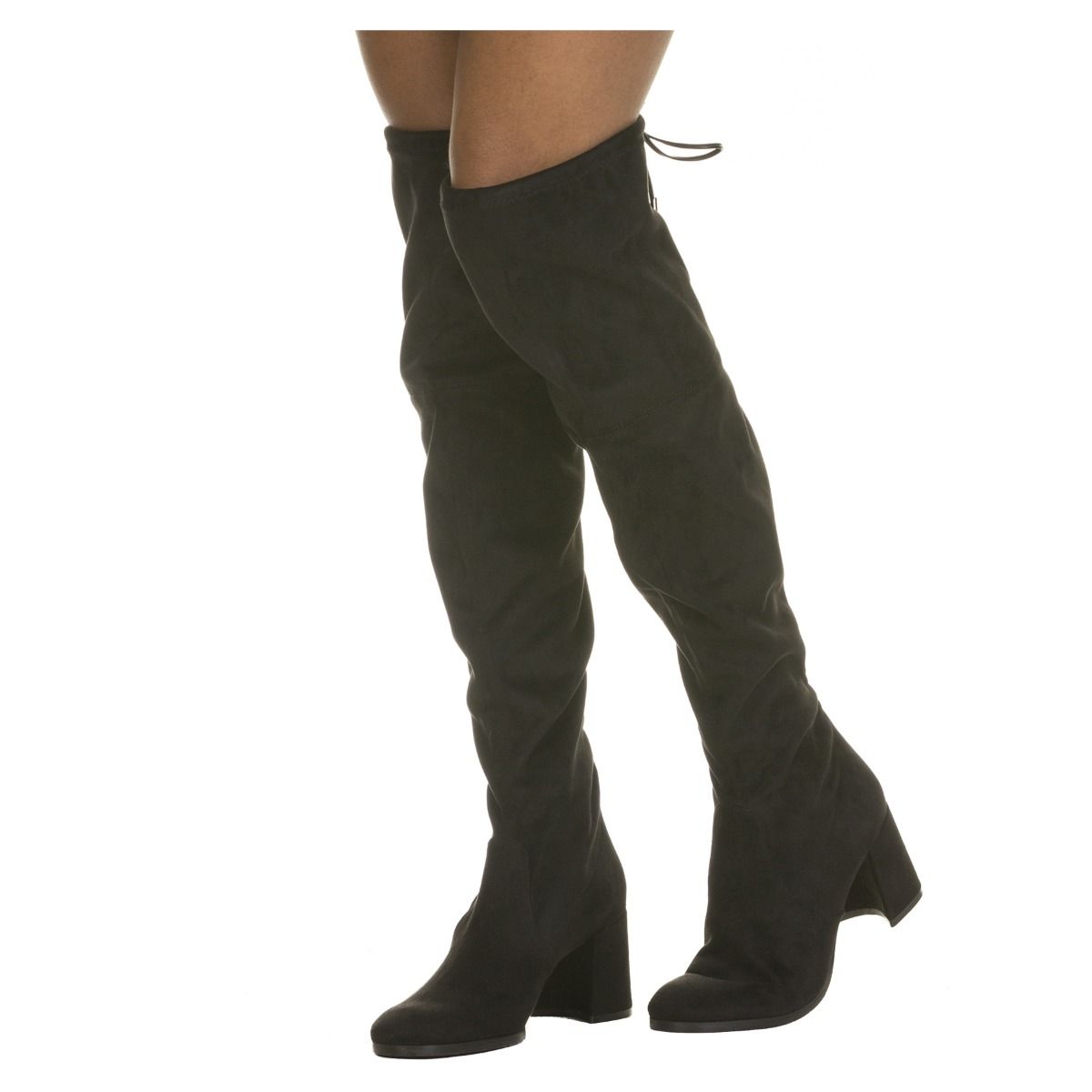 Stivali alti spora al ginocchio in camoscio nero con gambale elasticizzato, zip interna, tacco 60 fondo gomma.
