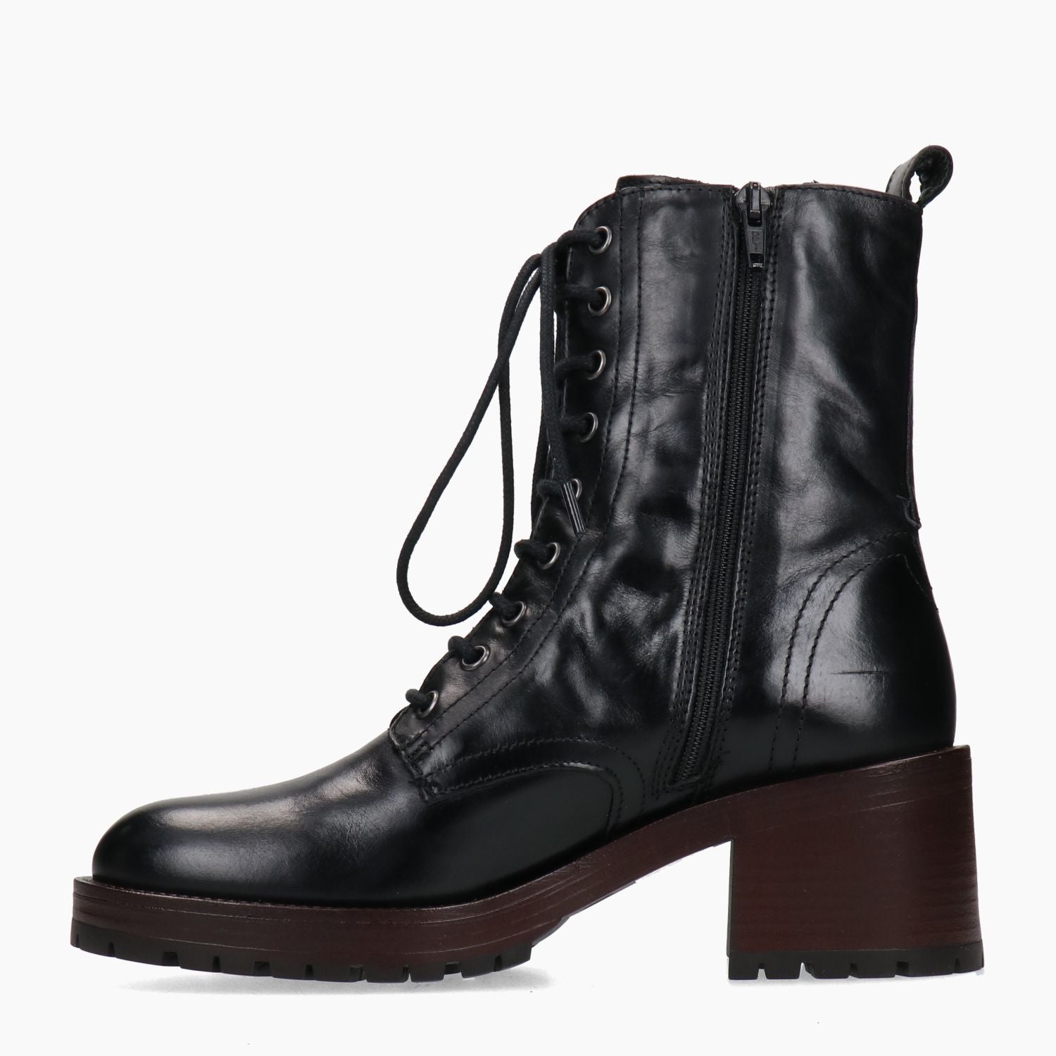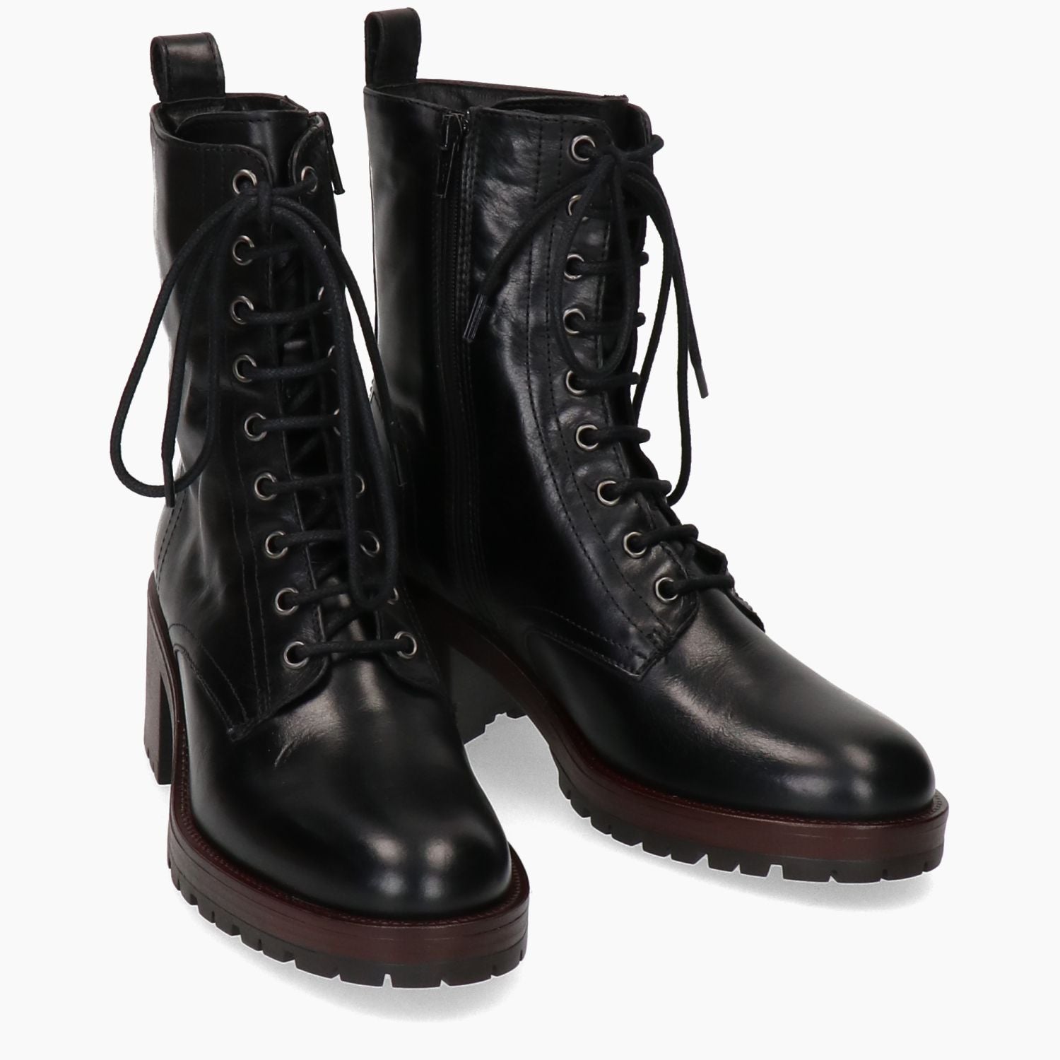 Anfibi in pelle in colore nero. Punta tonda. Chiusura con lacci e zip. Interno in microfibra. Suola in gomma con proflio laterale di colore bordeaux. Tacco di 6 cm. Collezione Fabbrica Dei Colli donna Autunno/Inverno.