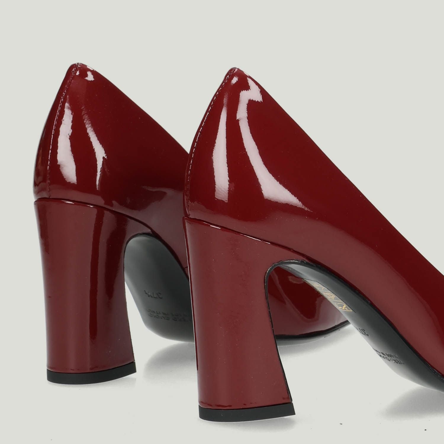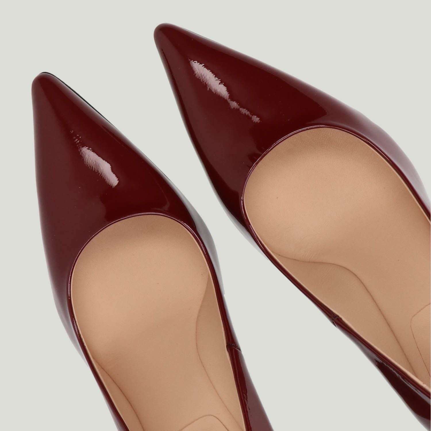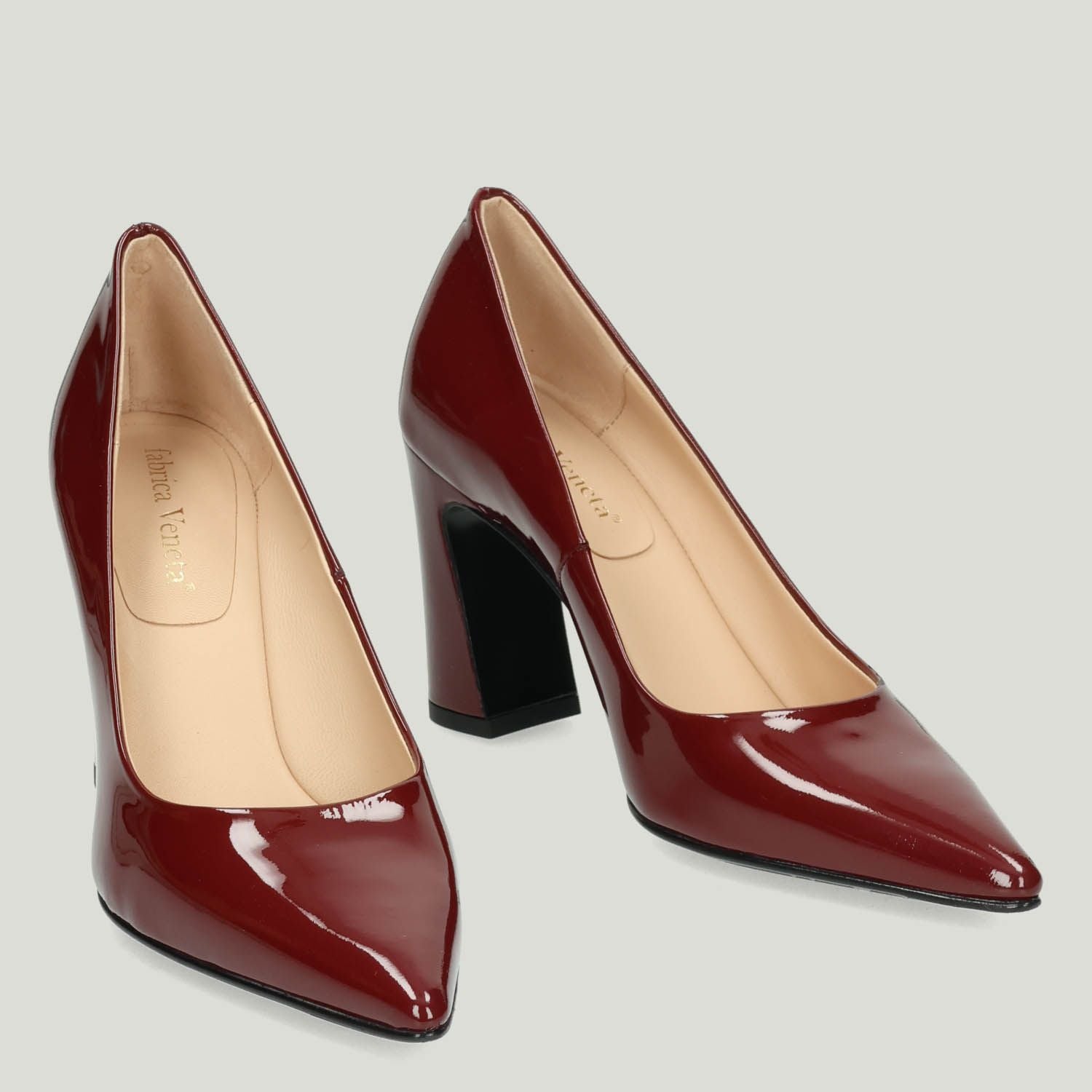 Decollete in pelle verniciata bordeaux. Interno in pelle con lavorazione a sacchetto. Suola in cuoio con isola antiscivolo in gomma. Tacco di 8 cm. Collezione Fabrica Veneta donna.