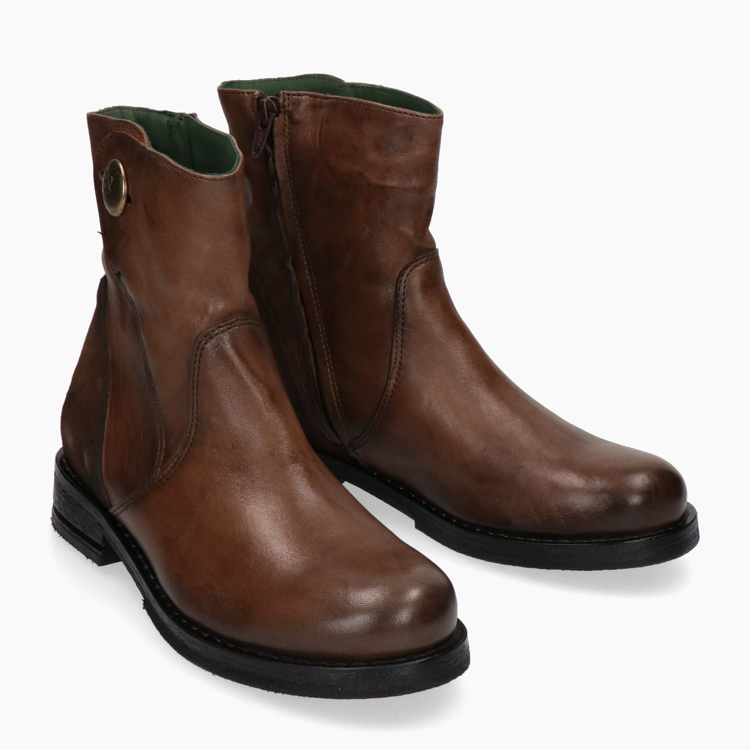 Stivaletti Felmini con tomaia in pelle in colore cuoio invecchiato. Punta tonda. Chiusura con zip laterale. Bottone a lato del gambale dorato. Tallone in camoscio cuoio. Suola in gomma con tacco di 3 cm. Collezione Felmini donna Autunno/Inverno.