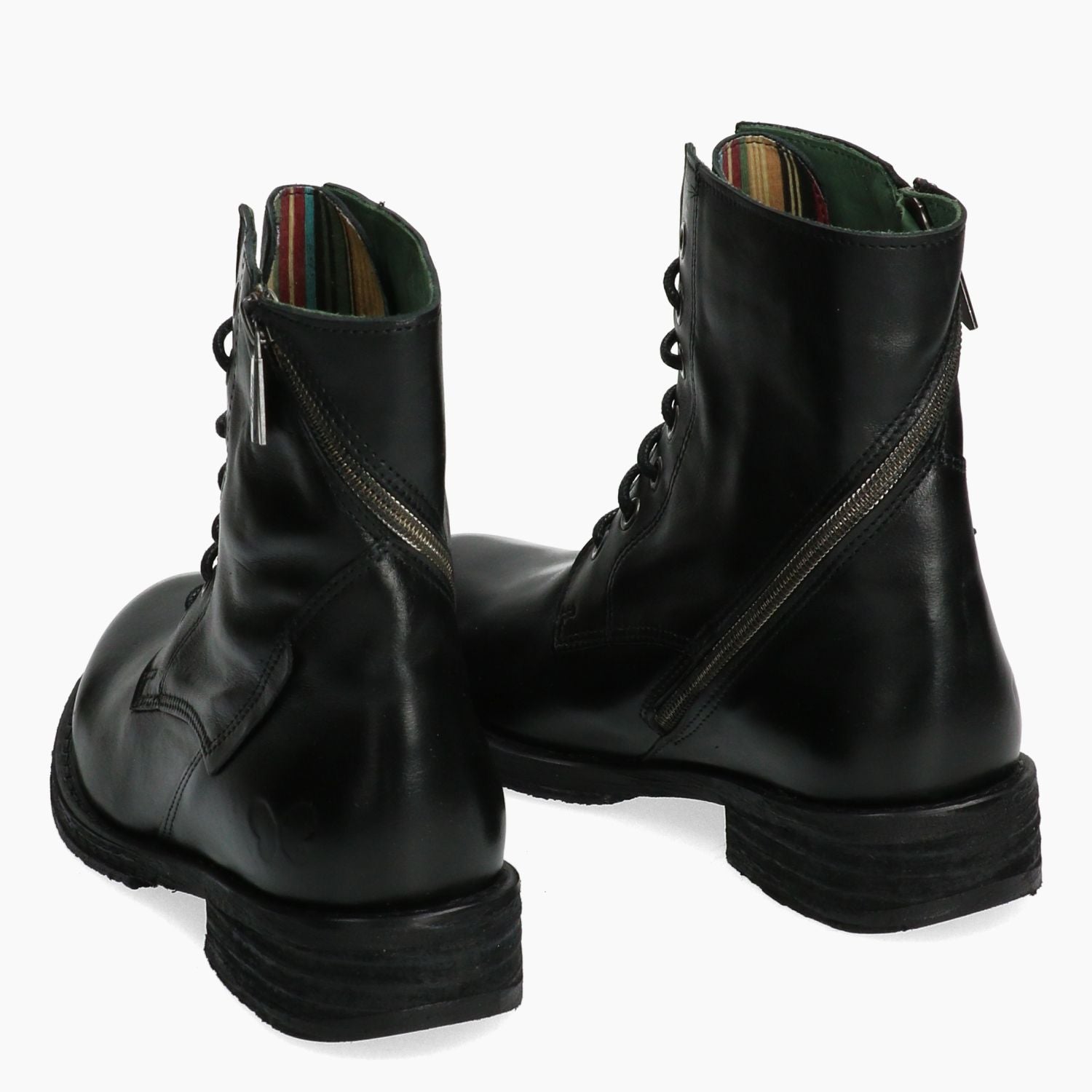 Anfibio con tomaia in pelle in colore nero. Chiusura tramite lacci e zip che ruota attorno al gambale. Interno in pelle e tessuto. Suola in gomma con tacco di 3 cm. Collezione Felmini donna Autunno/Inverno.