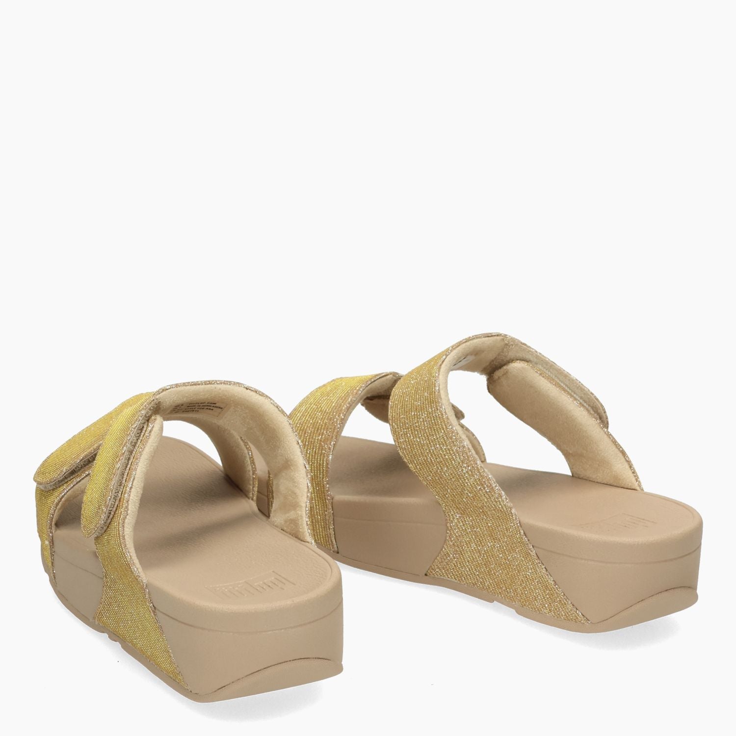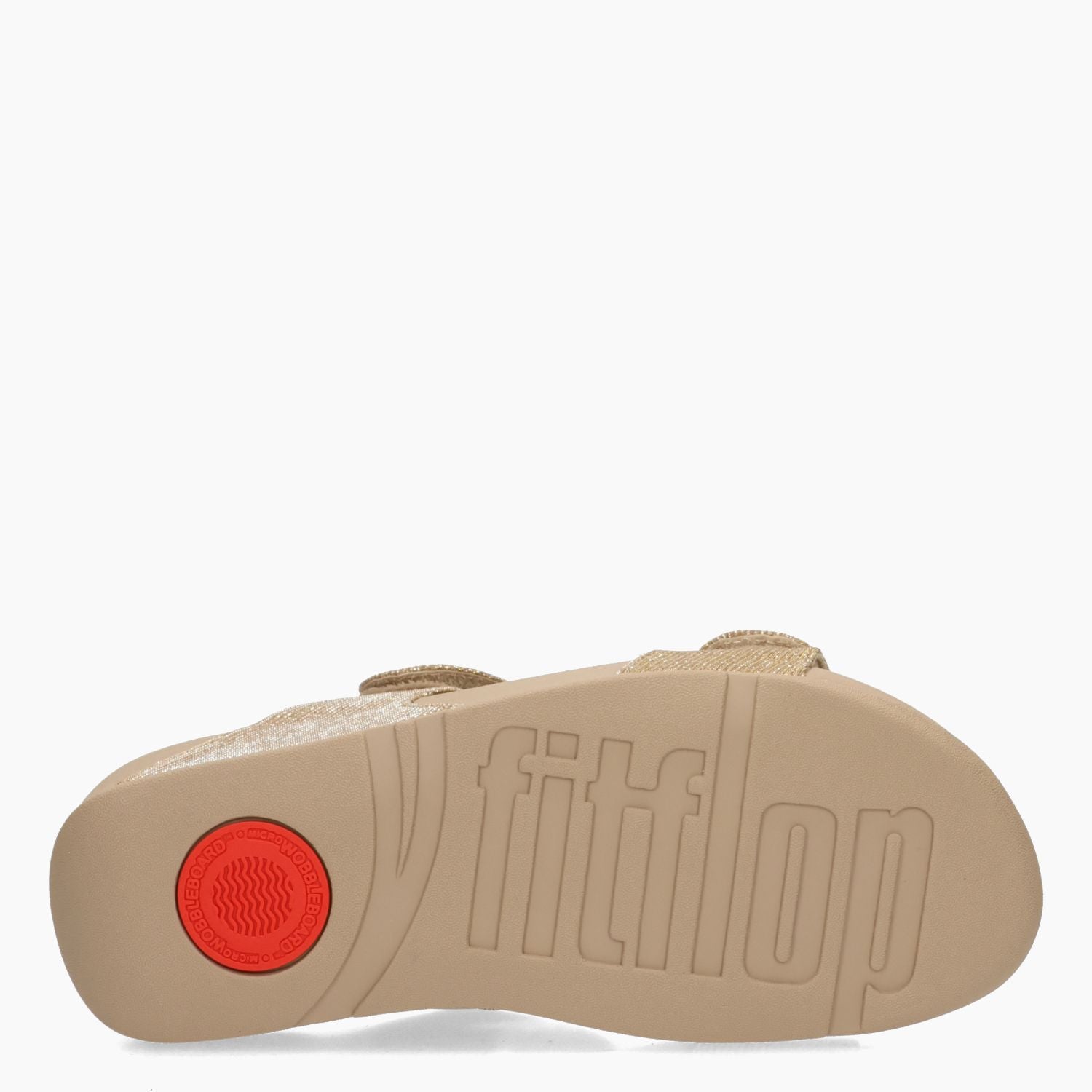 Ciabatta con doppio velcro in ecopelle glitterata oro. Interno in microfibra beige. Suola in gomma con zeppa di 4 cm. Collezione Fitflop donna Primavera/Estate.