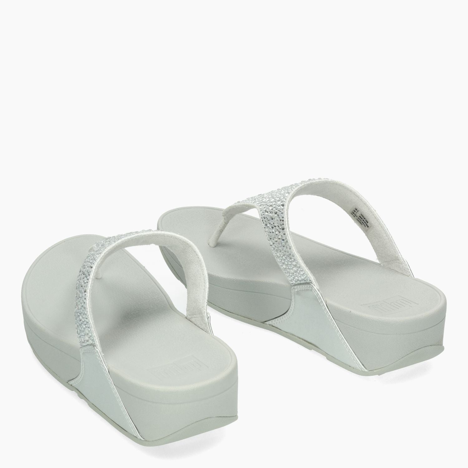 Ciabatta infradito in ecopelle argento con strass. Interno in microfibra nera. Suola in gomma con zeppa di 4 cm. Collezione Fitflop donna Primavera/Estate.