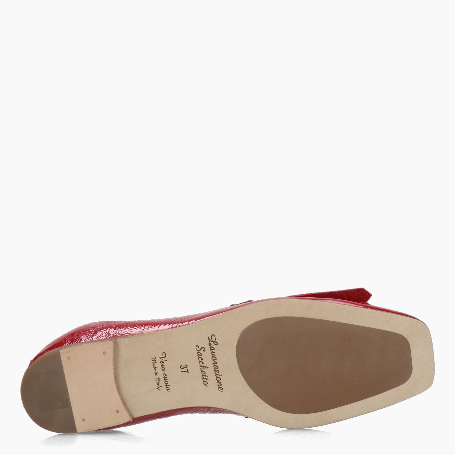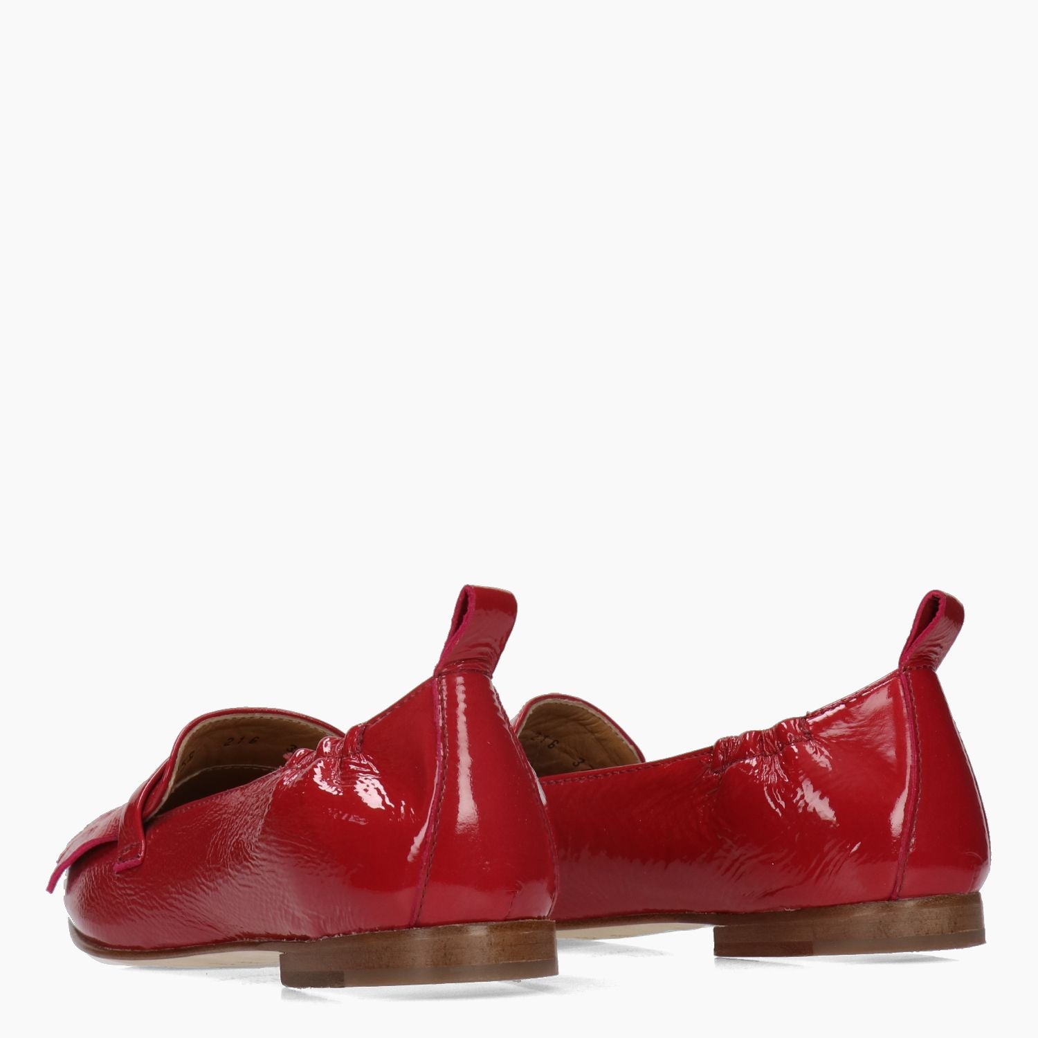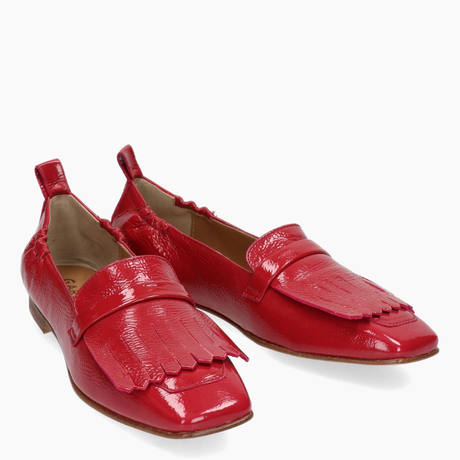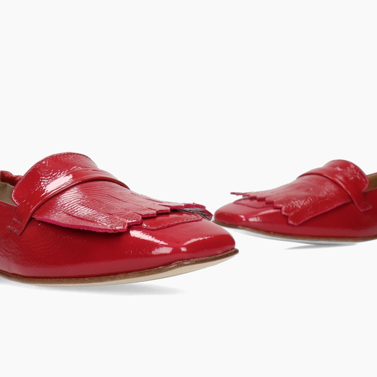 Mocassini in naplack in colore rosso ciliegia con frangia. Interno in pelle con lavorazione a sacchetto. Suola in cuoio e gomma con tacco di 1 cm. Collezione Garlani donna Primavera/Estate.