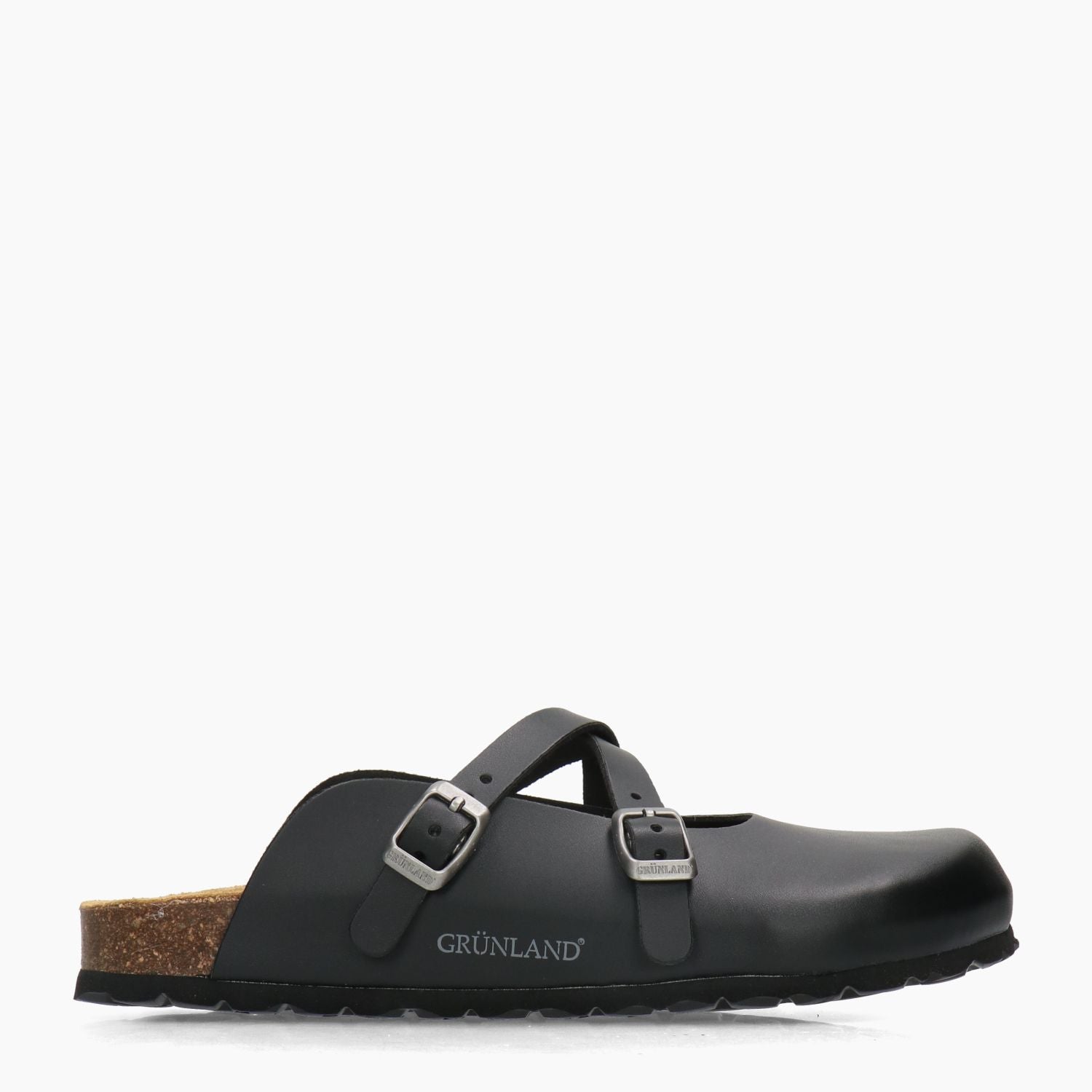 Sabot Grunland con tomaia in ecopelle in colore nero. Doppia fibbia con logo. Interno in ecopelle con sottopiede anatomico in pelle. Suola in gomma. Collezione Grunland donna.