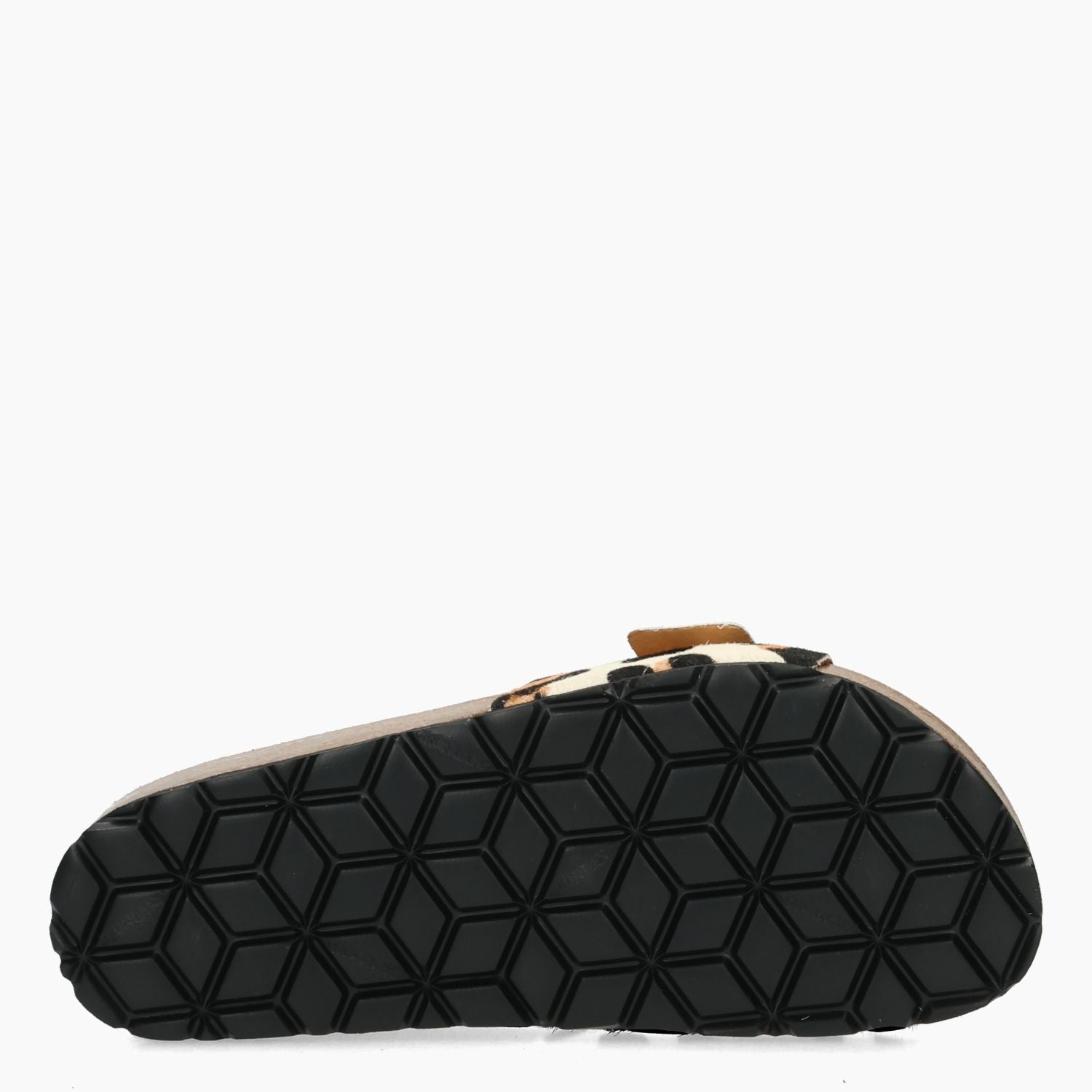 Ciabatta con tomaia in cavallino maculato. Chiusura con fibbia in metallo dorato. Interno in ecopelle con sottopiede imbottito. Suola in gomma con zeppa di 2 cm. Collezione Grunland donna Primavera/Estate.